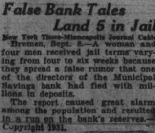 False Bank Tales Land 5 in Jail York Sept. four men terms ing from four to six weeks because they spread false that the directors the Savings bank fled with mildeposits. The report caused great alarm among the and resulted the bank's Copyright
