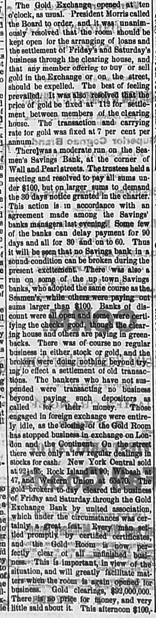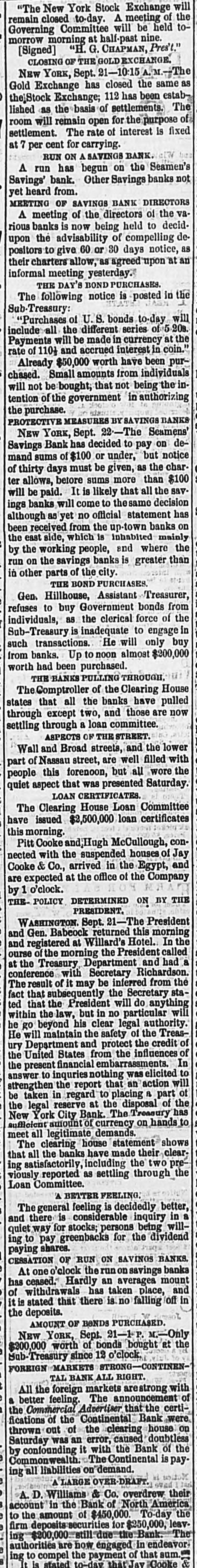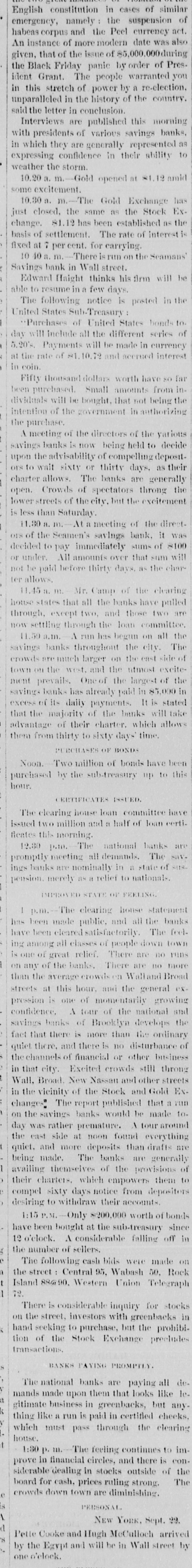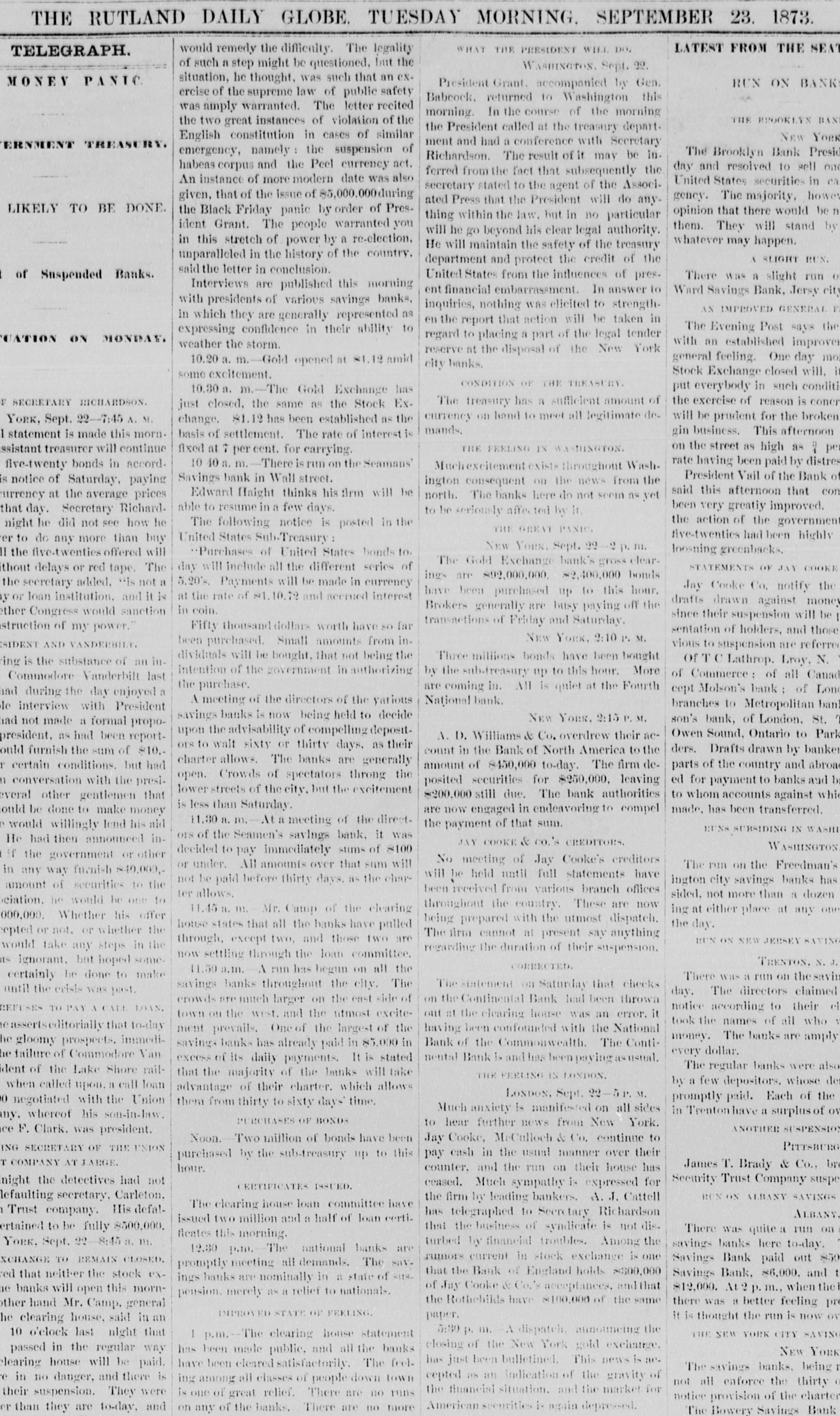 THE RUTLAND DAILY GLOBE. TUESDAY MORNING. SEPTEMBER 23. 1873. LATEST FROM THE SEAT WHAT THE PRESIDENT WILL DO. would remedy the difficulty. The legality TELEGRAPH. of such a step might be questioned, but the WASHINGTON Sept. 92. situation, he thought. was such that an exMONEY PANIC RUN ON BANK President Grant. accompanied by Gen. ercise of the supreme law of public safety Babcock. returned to Washington this was amply warranted. The letter recited morning. In the course of the morning THE BROOKLYN BAN the two great instances of violation of the the President called at the treasury depart. English constitution in cases of similar New YORK ment and had a conference with Secretary ERNMENT TREASURY emergency, namely the suspension of The Brooklyn Bank Presid Richardson. The result of it may be in. habeas corpus and the Peel currency act. day and resolved to sell one ferred from the fact that subsequently the An instance of more modern date was also United States securities in ca secretary stated to the agent of the Associgiven, that of the issue of $5,000,000during gency. The majority, howe ated Press that the President will do anyLIKELY TO BE DONE. the Black Friday panic by order of Presopinion that there would be n thing within the law. but in no particular ident Grant. The people warranted you them. They will stand by will he go beyond his clear legal authority. in this stretch of power by a re-election. whatever may happen. He will maintain the safety of the treasury unparalleled in the history of the country. A SLIGHT RUN. department and protect the credit of the said the letter in conclusion. of Suspended Banks. There was a slight run O United States from the influences of presInterviews are published this morning ent financial embarrassment. In answer to Ward Savings Bank, Jersy city with presidents of various savings banks, inquiries, nothing was elicited to strengthAN IMPROVED GENERAL in which they are generally represented as en the report that action will be taken in The Evening Post says the expressing confidence in their ability to regard to placing a part of the legal tender UATION ON MONDAY. with an established improver weather the storm. reserve at the disposal of the New York general feeling. One day mo 10.20 a. m.--Gold opened at $1.12 amid city banks. Stock Exchange closed will. some excitement. CONDITION OF THE TREASURY put everybody in such conditi 10.30 a. m.-The Gold Exchange has F SECRETARY RICHARDSON the exercise of reason is coner The treasury has a sufficient amount of just closed. the same as the Stock Exwill be prudent for the broken currency on hand to meet all legitimate dechange. $1.12 has been established as the YORK, Sept. 22-7:45 A. M. mands. gin business. This afternoon 1 statement is made this morn. basis of settlement. The rate of interest is assistant treasurer will continue THE FEELING IN HINGTON. on the street as high as : per fixed at 7 percent. for carrying. rate having been paid by distres 10 40 a. m. There is run on the Seamans' five-twenty bonds in accord. Muchexeitement exists throughout WashPresident Vail of the Bank of Savings bank in Wall street. notice of Saturday, paying ington consequent on the news from the said this afternoon that con Edward Haight thinks his firm will be currency at the average prices north. The banks here do not seem as yet been very greatly improved. able to resume in a few days. that day. Secretary Richardto be seriously affer ted by it the action of the government night he did not see how he The following notice is posted in the THE GREAT PANIC. five-twenties had been highly United States Sub-Treasury er to do any more than buy New York Sept. 92 P. 111. loosing greenbacks II the five-twenties offered will Purchases of United States bonds to The Gold Exchange bank's gross clearday will include all the different series of STATEMENTS OF JAY COOKE thout delays or red tape. The ings are $92,000,000. -2,400,000 bonds the secretary added, "is not a 5.20's Payments will be made in currency Jay Cooke Co. notify the have been purchased up to this hour. at the rate of 81.10.79 and accrued interest y or loan institution. and it is drafts drawn against money Brokers generally are busy paying off the in coin. ether Congress would sanction since their suspension will be transactions of Friday and Saturday. Fifty thousand dollars worth have so far struction of my power. sentation of holders, and those NEW YORK, 2:10 P. M. been purchased. Small amounts from inSIDENT AND VANDEEBILT. vious to suspension are referre dividuals will be bought. that not being the Three millions bonds have been bought ing is the substance of an in. Of TC Lathrop. Lroy, N. intention of the government in authorizing by the sub-treasury up to this hour. More of Commerce of all Canad Commodore Vanderbill last the purchase. are coming in. All is quiet at the Fourth cept Molson's bank of Lone had during the day enjoyed a National bank. A meeting of the directors of the variotts branches to Metropolitan bani le interview with President savings banks is now being held to decide NEW YORK, 2:15 P. M. son's bank, of London. St. had not made a formal propoupon the advisability of compelling depositOwen Sound, Ontario to Park A. D. Williams & Co. overdrew their acpresident. as had been reportors to wait sixty or thirty days, as their count in the Bank of North America to the ould furnish the sum of $10.ders. Drafts drawn by banker charter allows. The banks are generally 1 certain conditions. but had parts of the country and abroa amount of 8450,000 to-day. The firm deopen. Crowds of spectators throng the ed for payment to banks and 11 conversation with the presiposited securities for $250,000, leaving lower streets of the city, but the excitement $200,000 still due. The bank authorities to whom accounts against whi everal other gentlemen that is less than Saturday. made. has been transferred. are now engaged in endeavoring to compel ould be done to make money 11.30 a. 