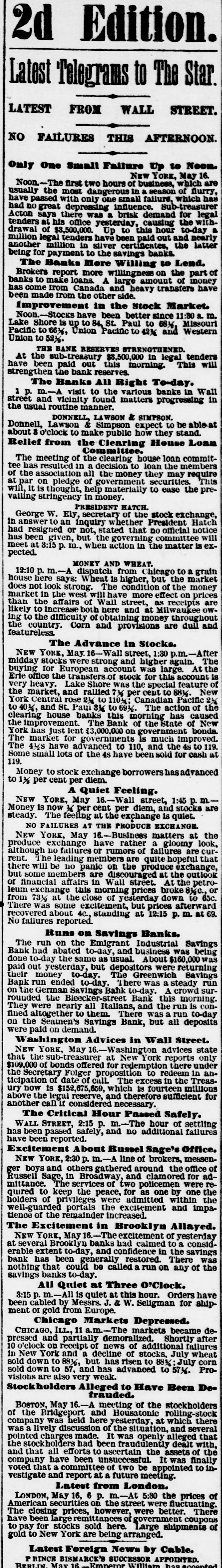 20 Edition. Latest Telegrams to The Star. LATEST FROM WALL STREET. NO FAILURES THIS AFTERNOON. Only One Small Failure Up to Noon. NEW YORK, May 16. Noon-The first two hours of business, which are usually the most dangerous in a season of flurry, have passed with only one small failure, which has had no great depressing influence. Sub-treasurer Acton says there was a brisk demand for legal tenders at his office yesterday, causing the withdrawal of $3,500,000. Up to this hour to-day a million legal tenders have been paid out and nearly another million in sliver certificates, the latter being for payment to the savings banks The Banks More Willing to Lend. Brokers report more willingness on the part of banks to make loans. A large amount of money has come from Canada and heavy transfers have been made from the other side. Improvement in the stock Market. Noon.-Stocks have been better since 11:30 a. m. Lake Shore is up to 84, St. Paul to 68%, Missouri Pacific to 66%, Union Pacific to 42% and Western Union to 52%. THE BANK RESERVES STRENGTHENED. At the sub-treasury $8,500,000 in legal tenders have been paid out this morning. This will strengthen the bank reserves. The Banks All Right To-day. 1 p. m-A visit to the various banks in Wall street and vicinity found matters progressing in the usual routine manner. DONNELL, LAWSON & SIMPSON. Donnell, Lawson & Simpson expect to be able at about 8 o'clock to make public how they stand. Relief from the Clearing House Loan Committee. The meeting of the clearing house loan committee has resulted in a decision to loan the members of the association all the money they may require at par on pledge of government securities. This will, it is thought, help materially to ease the prevailing stringency in money. PRESIDENT HATCH. George W. Ely, secretary of the stock exchange, in answer to an inquiry W hether President Hatch had resigned or not, stated that no official notice has been given, but the governing committee will meet at 3:15 p. m., when action in the matter is expected. MONEY AND WHEAT. 12:10 p. m.-A dispatch from Chicago to a grain house here says: Wheat is higher, but the market does not look strong. The condition of the money market in the west will have more effect on prices than the affairs of Wall street, as receipts are likely to increase both here and at Milwaukee owing to the difficulty of obtaining money throughout the country. Corn and provisions are dull and featureless. The Advance in Stocks. NEW YORK, May. 16-Wall street, 1:30 p.m-After midday stocks were strong and higher again. The buying for European account was large. At the Erie office the transfers of stock for this account is very heavy. Lake Shore was the special feature of the market, and rallied 7% per cent to 88%. New York Central rose 2½ to 1104; Canadian Pacific 24 to 401/4, and St. Paul 8½ to 6916. The action of the clearing house banks this morning has caused the improvement. The Bank of the State of New York has just lent $3,000,000 on government bonds. The market for governments is much improved. The 4 1/28 have advanced to 110, and the 48 to 119. Some small lots of the 4S have been sold for cash at 119. Money to stock exchange borrowers has advanced to 13/2 per cent per diem. A Quiet Feeling. New YORK, May 16.-Wall street, 1:45 p. mMoney is now ½ per cent per diem, and stocks are steady. The feeling at the exchange is quiet. NO FAILURES AT THE PRODUCE EXCHANGE. NEW YORK, May 16.-Business matters at the produce exchange have rather a gloomy look, although no failures or rumors of failures are current. he leading members are quite hopeful that there will be no panic on the produce exchange, but some members are discouraged at the outlook or financial affairs in Wall street. At the petroleum exchange this morning prices broke 81 c., or from 73% at the close of yesterday down to 65c. There was some excitement, but prices afterward recovered about 4c., standing at 12:15 P. m. at 69. No failures reported. Runs on Savings Banks. The run on the Emigrant Industrial Savings Bank had abated to-day, and business was being done to-day the same as usual. About $160,000 paid out yesterday, but depositors were returning their money to-day. The Greenwich Savings Bank run ended to-day. There was a steady run on the German Savings Bank to-day. A crowd surrounded the Bleecker-street Bank this morning. They were nearly all Italians, and the run is confined altogether to them. There was a run to-day on the Seamen's Savings Bank, but all deposits were paid on demand. Washington Advices in Wall Street. NEW YORK, May 16.-Washington advices state that the sub-treasurer at New York reports only $109,000 of bonds offered for redemption there under the Secretary Folger proposition to redeem in anticipation of date of call The excess in the Treasury now is $152,675,659, which is fourteen millions above the legal reserve, and therefore sufficient for another call ir considered necessary. The Critical Hour Passed Safely. WALL STREET, 2:15 p. m-The hour of settling has been passed safely, and no additional failures have been reported. Excitement About Russel Sage's Office. NEW YORK, 2:30 I m-A line of brokers, messenger boys and others gathered around the office of Russell Sage, in Broadway, and clamored for admittance. The services of two policemen were required to keep the peace, for as one by one the holders of privileges were admitted within the well-guarded portals the excitement and impatienoe of the remainder increased. The Excitement in Brooklyn Allayed. NEW YORK, May 16.-The excitement of yesterday at several Brooklyn banks had calmed to a considerable extent to-day, and confidence in the savings bank has been generally restored. There was nothing that could be called a run on any of the savings banks to-day. All Quiet at Three O'Clock. 3:15 p. m.-All is quiet at this hour. Orders have been cabled by Messrs. J. & W. Seligman for shipment or gold from Europe. Chicago Markets Depressed. CHICA