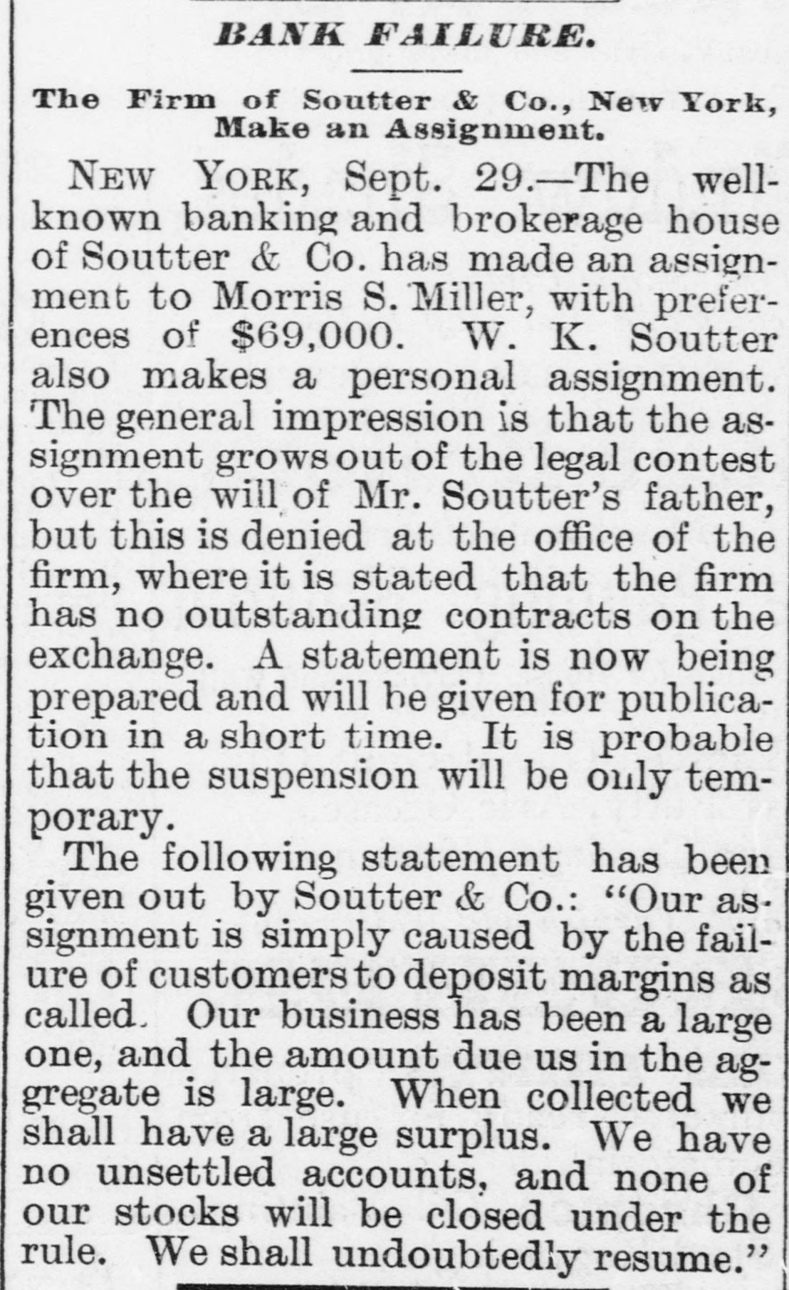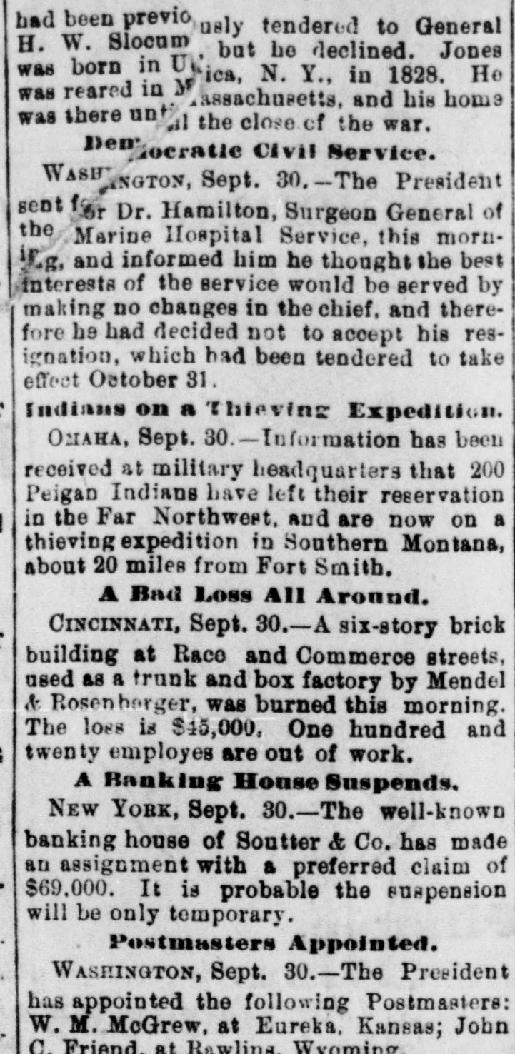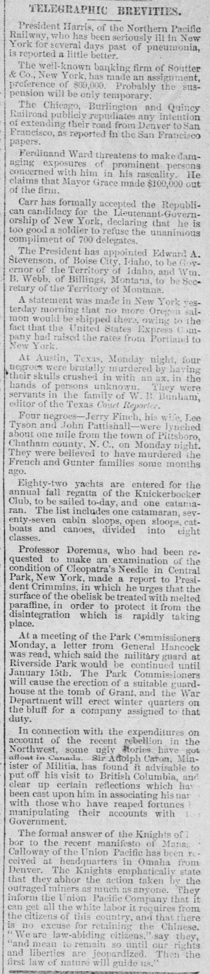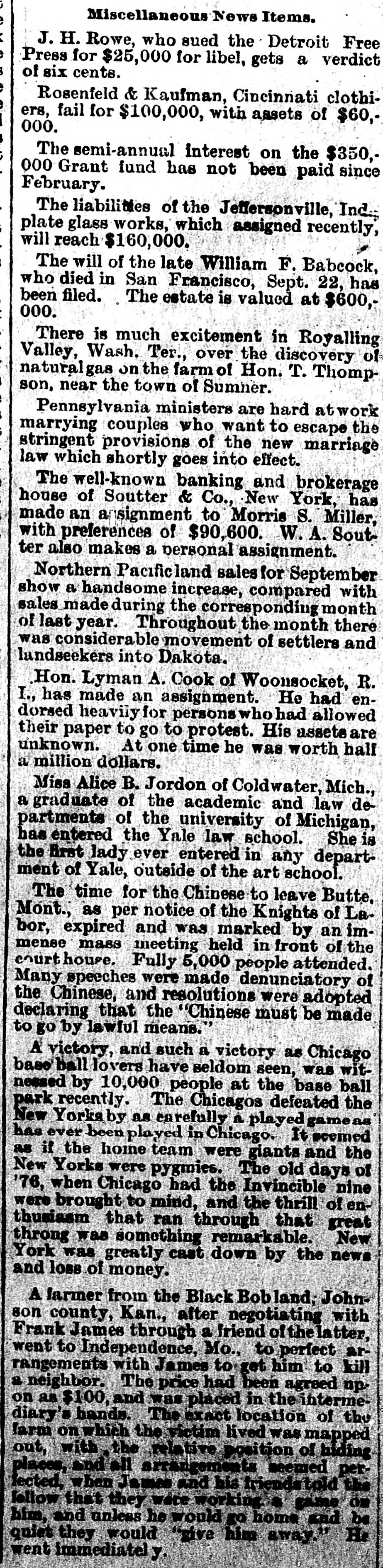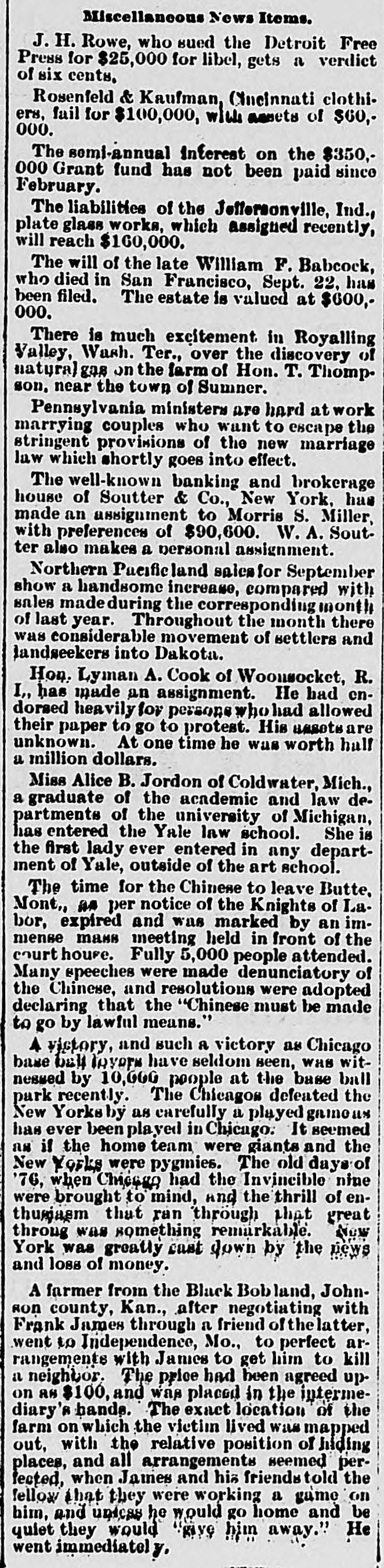 Miscellaneous News Items. J. H. Rowe, who sued the Detroit Free Press for $25,000 for libel, gets a verdict of six cents, Rosenfeld & Kaufman, Cincinnati clothiers, fail for $100,000, with masets of $60,000. The semi-annual interest on the $350,000 Grant fund has not been paid since February. The liabilities of the Jeffersonville, Ind., plate glass works, which assigned recently, will reach $160,000. The will of the late William F. Babcock, who died in San Francisco, Sept. 22, has been filed. The estate is valued at $600,000. There is much excitement in Royalling Valley, Wash. Ter., over the discovery of natural gas on the farm of Hon. T. Thompson, near the town of Sumner. Pennsylvania ministers are hard at work marrying couples who want to escape the stringent provisions of the new marriage law which shortly goes into effect. The well-known banking and brokerage house of Soutter & Co., New York, has made an assignment to Morris S. Miller, with preferences of $90,600. W.A. Soutter also makes a personal assignment. Northern Pacific land sales for September show a handsome increase, compared with sales made during the corresponding month of last year. Throughout the month there was considerable movement of settlers and landseekers into Dakota. Hon. Lyman A. Cook of Woonsocket, R. I,, has made an assignment. He had ondorsed heavily for persons who had allowed their paper to go to protest. His assets are unknown. At one time he was worth half a million dollars. Miss Alice B. Jordon of Coldwater, Mich., a graduate of the academic and law departments of the university of Michigan, has entered the Yale law school. She is the first lady ever entered in any department of Yale, outside of the art school. The time for the Chinese to leave Butte, Mont,, as per notice of the Knights of Labor, expired and was marked by an immense mass meeting held in front of the court house. Fully 5,000 people attended. Many speeches were made denunciatory of the Chinese, and resolutions were adopted declaring that the "Chinese must be made to go by lawful means." 4 vistory, and such a victory as Chicago base ball lovers have seldom seen, was witnessed by 10,000 people at the base ball park recently. The Chicagos defeated the New Yorksby as carefully a played gamou has ever been played in Chicago. It seemed as if the home team were giants and the New Yorks were pygmies. The old days of '76, when Chicago had the Invincible nine were brought to mind, and the thrill of enthusjasm that ran through that great throug was something remarkable. New York was greatly cast down by the news and loss of money. A farmer from the Black Bobland, Johnson county, Kan., after negotiating with Frank James through a friend of the latter, went to Independence, Mo., to perfect arrangements with James to get him to kill a neighbor. The price had been agreed upon as $100, and was placed in the intermediary's hands. The exact location of the farm on which the victim lived With mapped out, with the relative position of hiding places, and all arrangements seemed perfected, when James and his friends told the fellow that they were working a game on him, and unicss he would go home and be quiet they would "give him away." He went immediatel