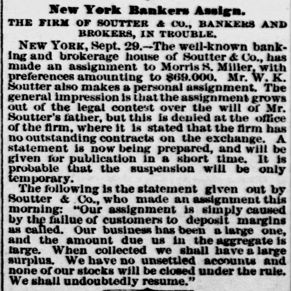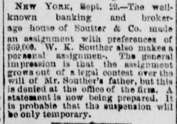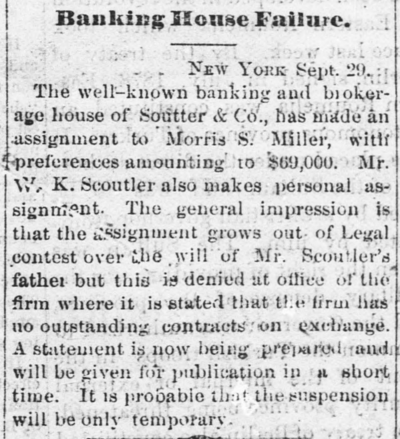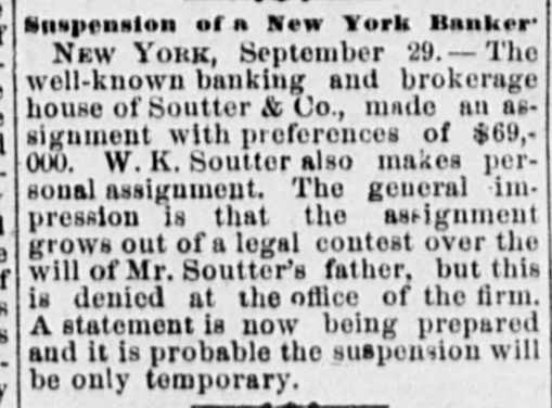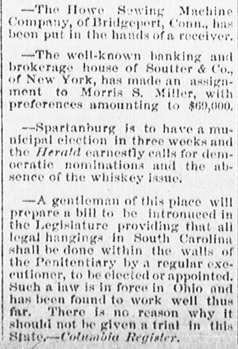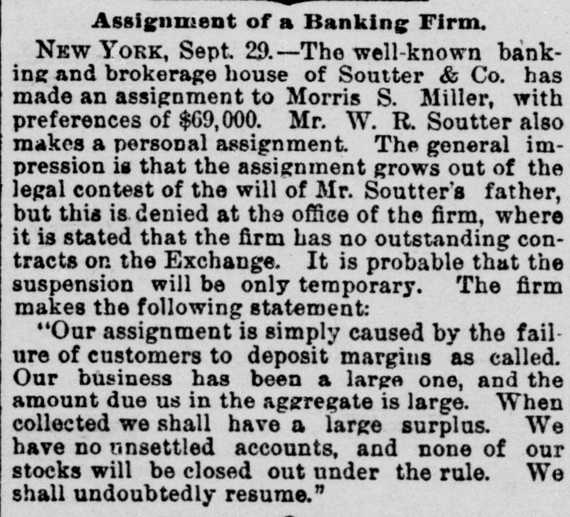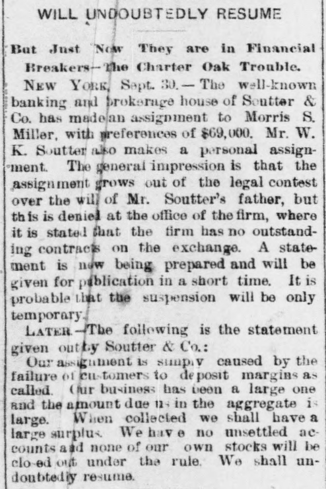 Miscellaneous News Items. J. H. Rowe, who sued the Detroit Free Press for $25,000 for libel, gets a verdict of six cents, Rosenfeld & Kaufman, Cincinnati clothiers, fail for $100,000, with masets of $60,000. The semi-annual interest on the $350,000 Grant fund has not been paid since February. The liabilities of the Jeffersonville, Ind., plate glass works, which assigned recently, will reach $160,000. The will of the late William F. Babcock, who died in San Francisco, Sept. 22, has been filed. The estate is valued at $600,000. There is much excitement in Royalling Valley, Wash. Ter., over the discovery of natural gas on the farm of Hon. T. Thompson, near the town of Sumner. Pennsylvania ministers are hard at work marrying couples who want to escape the stringent provisions of the new marriage law which shortly goes into effect. The well-known banking and brokerage house of Soutter & Co., New York, has made an assignment to Morris S. Miller, with preferences of $90,600. W.A. Soutter also makes a personal assignment. Northern Pacific land sales for September show a handsome increase, compared with sales made during the corresponding month of last year. Throughout the month there was considerable movement of settlers and landseekers into Dakota. Hon. Lyman A. Cook of Woonsocket, R. I,, has made an assignment. He had ondorsed heavily for persons who had allowed their paper to go to protest. His assets are unknown. At one time he was worth half a million dollars. Miss Alice B. Jordon of Coldwater, Mich., a graduate of the academic and law departments of the university of Michigan, has entered the Yale law school. She is the first lady ever entered in any department of Yale, outside of the art school. The time for the Chinese to leave Butte, Mont,, as per notice of the Knights of Labor, expired and was marked by an immense mass meeting held in front of the court house. Fully 5,000 people attended. Many speeches were made denunciatory of the Chinese, and resolutions were adopted declaring that the "Chinese must be made to go by lawful means." 4 vistory, and such a victory as Chicago base ball lovers have seldom seen, was witnessed by 10,000 people at the base ball park recently. The Chicagos defeated the New Yorksby as carefully a played gamou has ever been played in Chicago. It seemed as if the home team were giants and the New Yorks were pygmies. The old days of '76, when Chicago had the Invincible nine were brought to mind, and the thrill of enthusjasm that ran through that great throug was something remarkable. New York was greatly cast down by the news and loss of money. A farmer from the Black Bobland, Johnson county, Kan., after negotiating with Frank James through a friend of the latter, went to Independence, Mo., to perfect arrangements with James to get him to kill a neighbor. The price had been agreed upon as $100, and was placed in the intermediary's hands. The exact location of the farm on which the victim lived With mapped out, with the relative position of hiding places, and all arrangements seemed perfected, when James and his friends told the fellow that they were working a game on him, and unicss he would go home and be quiet they would "give him away." He went immediatel