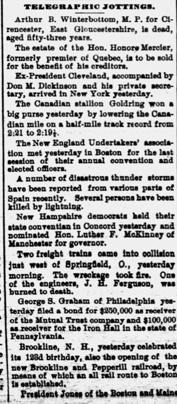 TELEGRAPHIC JOTTINGS. Arthur B. Winterbottom, M. P. for Cirencester, East Gloucestershire, is dead, aged fifty-three years. The estate of the Hon. Honore Mercier, formerly premier of Quebec, is to be sold for the benefit of his creditors. Ex-President Cleveland, accompanied by Don M. Dickinson and his private secretary, arrived in New York yesterday. The Canadian stallion Goldring won a big purse yesterday by lowering the Canadian mile on a half-mile track record from 2:21 to 2:191. The New England Undertakers' association met yesterday in Boston for the last session of their annual convention and elected officers. A number of disastrous thunder storms have been reported from various parts of Spain recently. Several persons have been killed by lightning. New Hampshire democrats held their state conventian in Concord yesterday and nominated Hon. Luther F. McKinney of Manchester for governor. Two freight trains came into collision just west of Springfield, O., yesterday morning. The wreckage took fire. One of the engineers, J. H. Ferguson, was burned to death. George S. Graham of Philadelphia yesterday filed a bond for $250,000 as receiver of the Mutual Trust company and $100,000 as receiver for the Iron Hall in the state of Pennsylvania. Brookline, N. H., yesterday celebrated its 128d birthday, also the opening of the new Brookline and Pepperill railroad, by means of which an all rail route to Boston is established, President Jones of the Boston and Maine