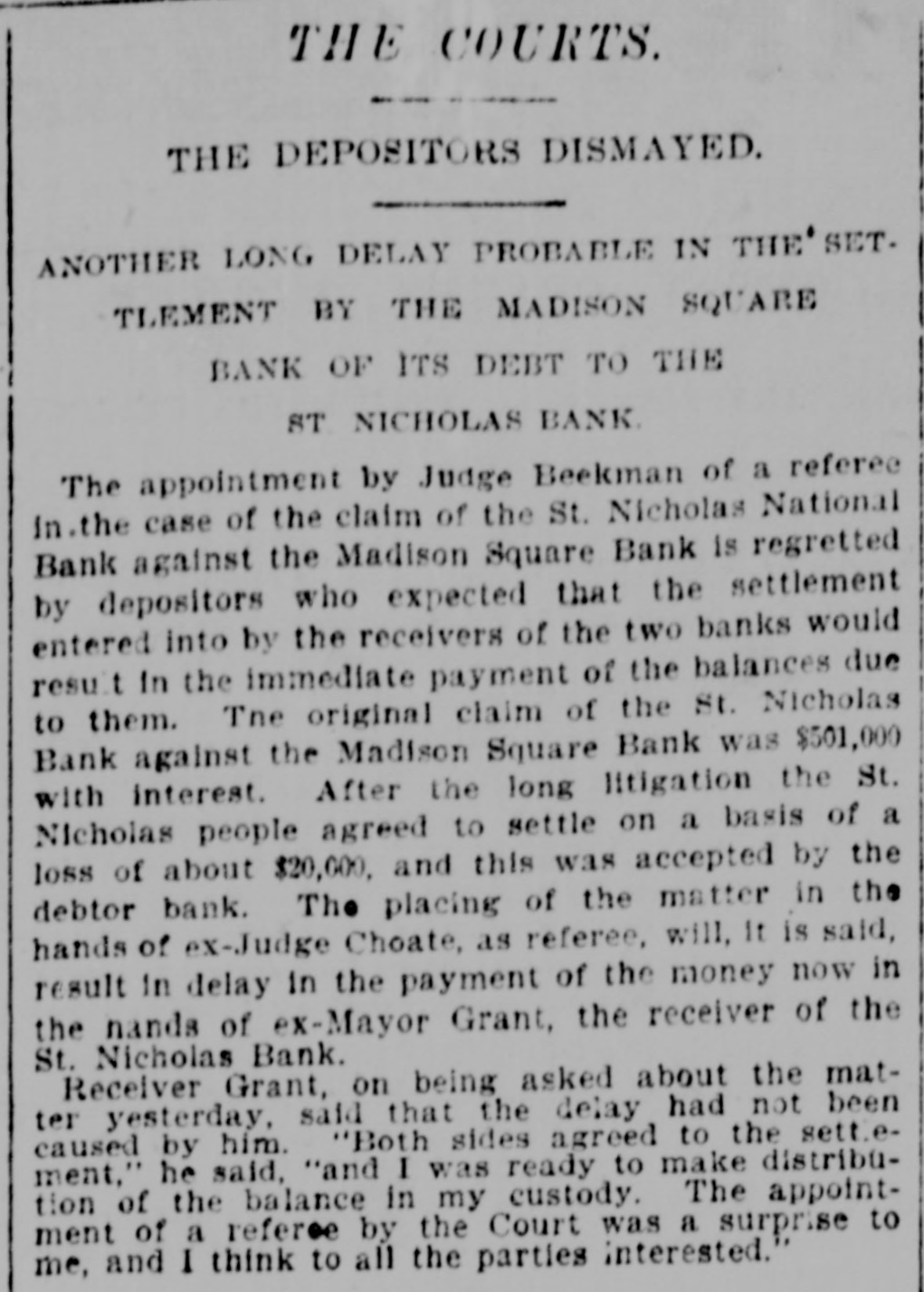 THE COURTS. THE DEPOSITORS DISMAYED. ANOTHER LONG DELAY PROBABLE IN THE SETTLEMENT BY THE MADISON SQUARE BANK OF ITS DEBT TO THE ST NICHOLAS BANK. The appointment by Judge Beekman of a referee in.the case of the claim of the St. Nicholas National Bank against the Madison Square Bank is regretted by depositors who expected that the settlement entered into by the receivers of the two banks would result In the immediate payment of the balances due to them. The original claim of the St. Nicholas Bank against the Madison Square Bank was $501,000 with interest. After the long litigation the St. Nicholas people agreed to settle on a basis of a loss of about $20,000, and this was accepted by the debtor bank. The placing of the matter in the hands of ex-Judge Choate, as referee, will, It is said, result in delay in the payment of the money now in the hands of ex-Mayor Grant, the receiver of the St. Nicholas Bank. Receiver Grant, on being asked about the matter yesterday, said that the delay had not been caused by him. "Both sides agreed to the settlement," he said, "and I was ready to make distribution of the balance in my custody. The appointment of a referee by the Court was a surprise to me, and I think to all the parties interested."