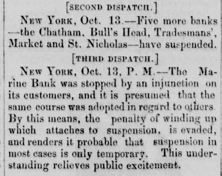 [SECOND DISPATCH.] NEW YORK, Oct. 13.-Five more banks -the Chatham. Bull's Head, Tradesmans', Market and St. Nicholas-have suspended. [THIRD DISPATCH.] New YORK, Oct. 13, P. M.-The Marine Bank was stopped by an injunction on its customers, and it is presumed that the same course was adopted in regard to others By this means, the penalty of winding up which attaches to suspension, is evaded, and renders it probable that suspension in most cases is only temporary. This understanding relieves public excitement.