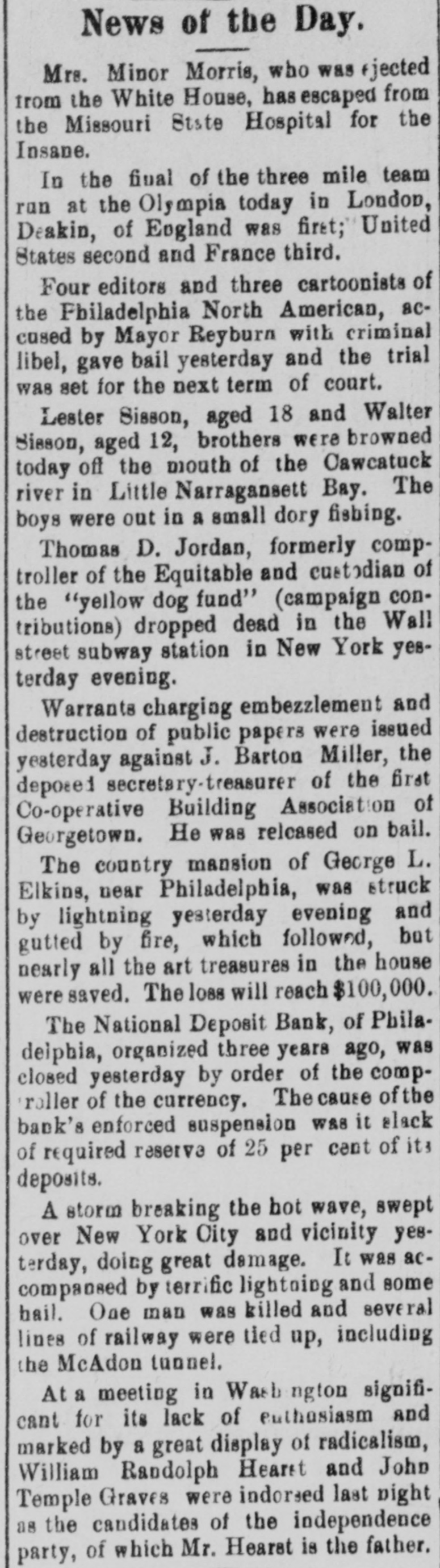 FINANCIAL Jan. 2-State Bank, Rockyford, Col., closed doors. 6-Four big New York diamond firms forced into trustee's hands; liabilities, $4,500,000. -Chicago Great Western railroad JOHN placed in hands of receivers. 16-Western Bank and Trust Co., Dallas, Tex., largest Texas saving bank, placed in receiver's hands. 18-John R. Walsh, president Chicago National bank and several railroads, convicted of misappropriating institution's funds. 21-Capital State Bank, Boise, Idaho, suspended. 22-Traders and Mechanics' Bank, Pittsburg, Pa., closed doors. 25-National Bank of North America, New York, closed for liquidation, by order of government. 29-New Amsterdam National bank, capital $1,000,000, and Mechanics and Traders' bank, both of New York, taken in charge by comptroller of currency. 31-Oriental Bank of New York closed doors, following run. Feb. 13-W. B. Ridgely, comptroller of currency, accepted presidency of reorganized National Bank of Commerce, Kansas City, Mo. 26-International and Great Northern Railroad Co., a Gould line, placed in receivers' hands. 27-Financiers E. R. Thomas and O. F. Thomas indicted on charge of mismanagement of funds of Provident Savings Life Assurance society. Mar. 13-John R. Walsh denied new trial; sentenced to five years in federal prison. 16-People's National bank, Aspin, Col., closed. Apr. 1-Pike County Bank and Trust Co., Macomb City, Miss., placed in receiver's hands. 21-Bank of Wauseon, Wauseon, O., closed doors. 24-T. A. McIntyre & Co., with houses in many cities, failed for $1,000,000. May 8-Euclid Avenue Trust Co., Cleveland, O., assigned. 14-Reserve Trust Co., and American Savings bank, Cleveland, O., closed their doors. 28-G. W. MacMillen & Co., Pittsburg, Pa., stockbrokers, failed; liabilities, $1,800,000. Jun. 3-Kosclusko Company bank, Warsaw, Ind., closed by state auditor. 23-Citizens' bank, Dover, Ky., closed doors. Jul. 14-National Deposit bank, Philadelphia, Pa., closed by comptroller of currency. 17-Farmers and Merchants' Banking Co., Cleveland, O., failed. 22-Standard on $29,240,000 fine decision unanimously reversed by United States court of appeals at ChiAug. cago. 6-First National bank, Belle Plaine, Minn., closed by order comptroller of currency; bank was insolvent: President J. G. Lund committed suicide. 25-A. O. Brown & Co., one of largest New York brokerage firms, failed; liabilities over $1,000,000. Sep. 10-A. Booth & Co., largest fish house in country, forced into receiver's hands. Oct. 16-Union National bank, Sommerville, Pa., closed by government. Nov. 5-Charles W. Morse and Alfred H. Curtis, great financiers, found guilty of misapplication of funds and falsifying books of National Bank of America, New York. 6-C. W. Morse sentenced to 15 years; Curtis given liberty on suspended sentence. 23-Eldred bank of Eldred, Pa., suspended; capital stock, $100,000. Dec. 7-National exchange bank at Springfield, Mo., closed; excitement caused by effort of W. O. Oldham, cashier of State Savings bank, to shoot President H. B. McDaniel, of Union National bank. 11-Springport, Mich., State Savings bank closed by bank examiner. 16-Somersworth, N. H., First National bank closed, following discovery of shortage of $85,000. 23-Thomas F. Ryan announced retirement from finance. 26-Henry W. Poor, New York broker, assigned for creditors.
