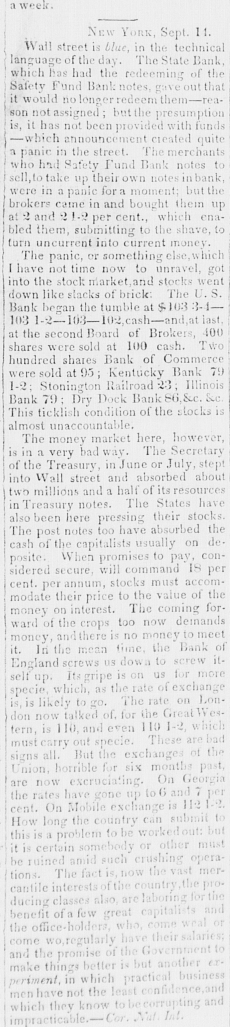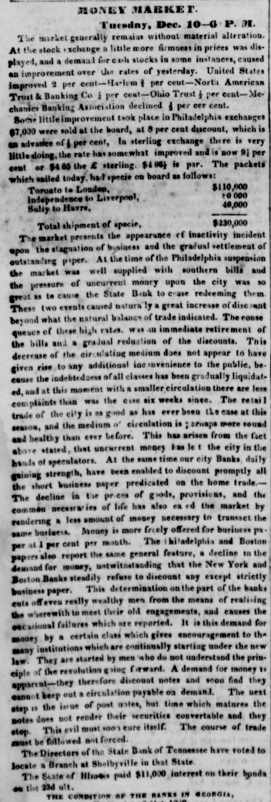 There is but little doing in domestic bills, and the discount is increasing, particularly on Georgia and Mobile. The country money of this State is again becoming deranged. It will be recollected, last fall, after the State Bank ceased to redeem Safe-ty Fund money in this city. the rate of discount rose very high, and continued so until the 9th of Nov., when a convention of Safe-ty Fund Banks was held at Auburn, whereby it was arranged that a bank should be appointed in Albany or Troy, to act as agent to seal up the bills and notify each bank by mail of the amount of its notes then on hand for redemption. The Bank so notified to redeem its bills, so sealed up at the end of 16'days after the sealing by drafts or funds current in Albany. The agency charged 1-10 of 1 per cent for conducting the business. The new banks generally came into this arrangement, under which the rate of discount gradually fell from 5 a 6 per cent to 1 a 11 per cent, both for Red Back and Safety Fund. The banks were to keep the system of exchanging with each other, and adjusting the balances. To this arrangement, the Safety Fund Banks still adhere, but most of the banks under the new law have been thrown out at the agency, and the discount on them is rapidly rising. The following is a list of those still redeemed at the agency:-