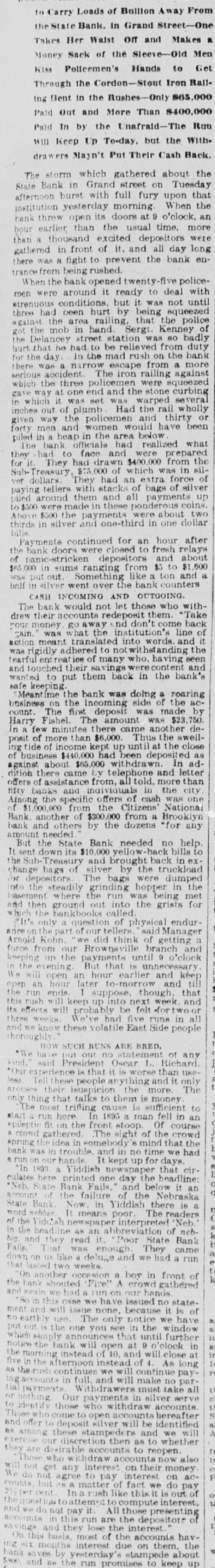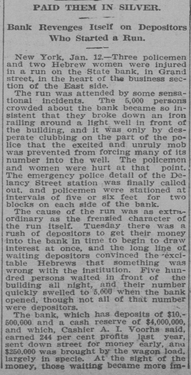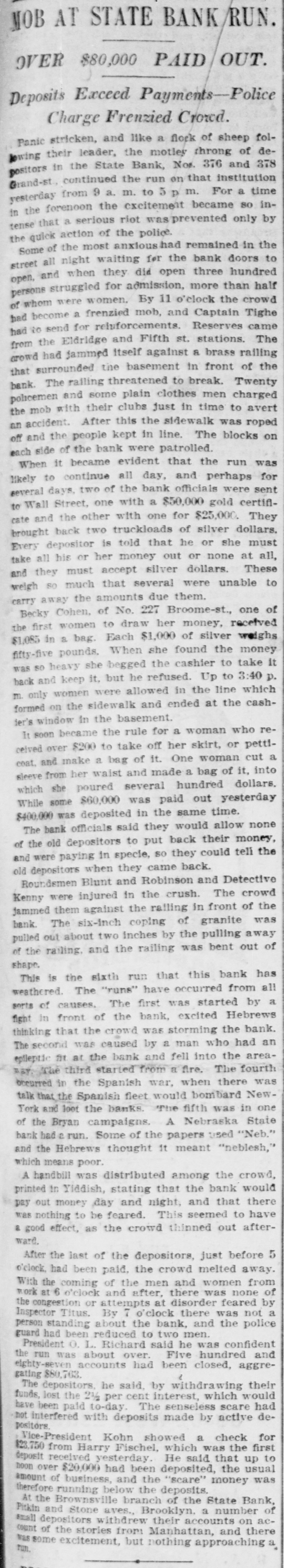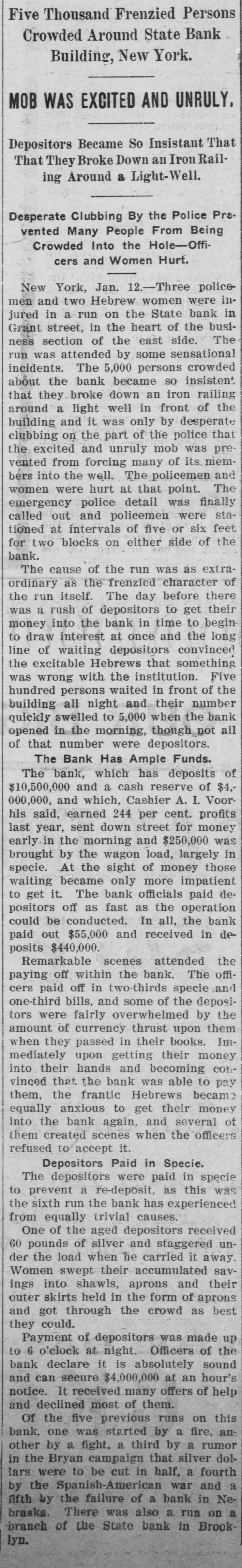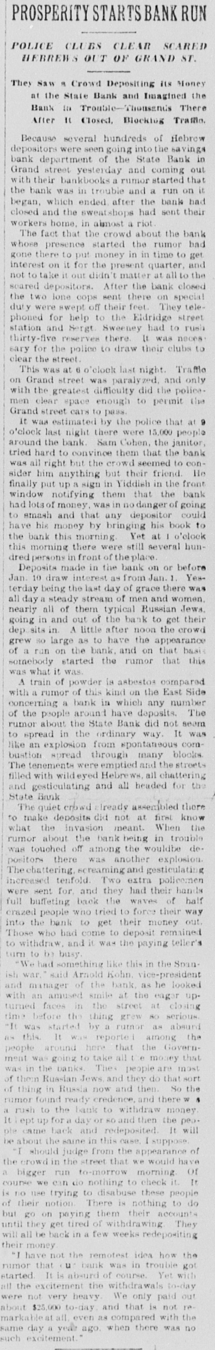 PROSPERITY STARTS BANK RUN POLICE CLUBS CLEAR SCARED HEBREWS OUT OF GRAND ST. They Saw a Crowd Depositing its Money at the State Bank and Imagined the Bank in Trouble-Thousends There After It Closed, Blocking Traffic. Because several hundreds of Hebrew depositors were seen going into the savings bank department of the State Bank in Grand street yesterday and coming out with their bankbooks a rumor started that the bank was in trouble and a run on it began, which ended after the bank had closed and the sweatshops had sent their workers home, in almost a riot. The fact that the crowd about the bank whose presence started the rumor had gone there to put money in in time to get interest on it for the present quarter, and not to take it out didn't matter at all to the scared depositors. After the bank closed the two lone cops sent there on special duty were swept off their feet. They telephoned for help to the Eldridge street station and Sergt. Sweeney had to rush thirty-five reserves there. It was neces: sary for the police to draw their clubs to clear the street. This was at 6 o'clock last night. Traffle on Grand street was paralyzed, and only with the greatest difficulty did the policemen clear space enough to permit the Grand street cars to pass. It was estimated by the police that at 9 o'clock last night there were 15,000 people around the bank. Sam Cohen, the janitor, tried hard to convince them that the bank was all right but the crowd seemed to consider him anything but their friend. He finally put up a sign in Yiddish in the front window notifying them that the bank had lots of money, was in no danger of going to smash and that any depositor could have his money by bringing his book to the bank this morning. Yet at I o'clock this morning there were still several hundred persons in front of the place. Deposits made in the bank on or before Jan. 10 draw interest as from Jan. 1. Yesterday being the last day of grace there was all day a steady stream of men and women, nearly all of them typical Russian Jews. going in and out of the bank to get their dep. sits in. A little after noon the crowd grew so large as to have the appearance of a run on the bank, and on that basis somebody started the rumor that this was what it was. A train of powder is asbestos compared with a rumor of this kind on the East Side concerning a bank in which any number of the people around have deposits. The rumor about the State Bank did not seam to spread in the ordinary way. It was like an explosion from spontaneous combustion spread through many blooks. The tenements were emptied and the streets filled with wild eyed Hebrews, all chattering and gesticulating and all headed for the State Bank The quiet crowd clready assembled there to make deposits did not at first know what the invasion meant. When the rumor about the bank being in trouble was touched off among the wouldbe depositors there was another explosion. The chattering, creaming and gesticulating increased tenfold. Two extra policemen were sent for, and they had their hands full buffeting back the waves of half crazed people who tried to force their way into the bank to get their money out. Those who bad come to deposit remained to withdraw. and it was the paying teller's turn to be busy. "We had something like this in the Spansh war." said Arnold Kohn. vice-president and manager of the bank, as he looked with an amused smile at the eagar upurned faces in the street at closing ime before the thing grew so serious. It was started by a rumor as absurd this. It WITH reported among the eonte around here that the Govern-
