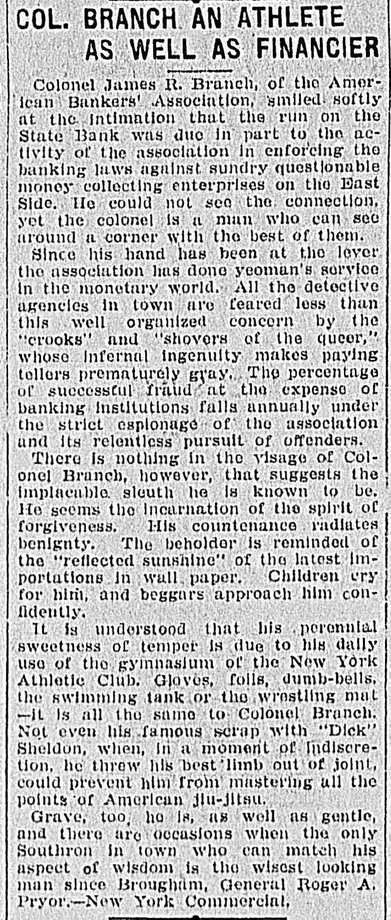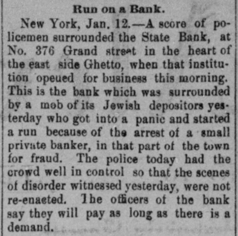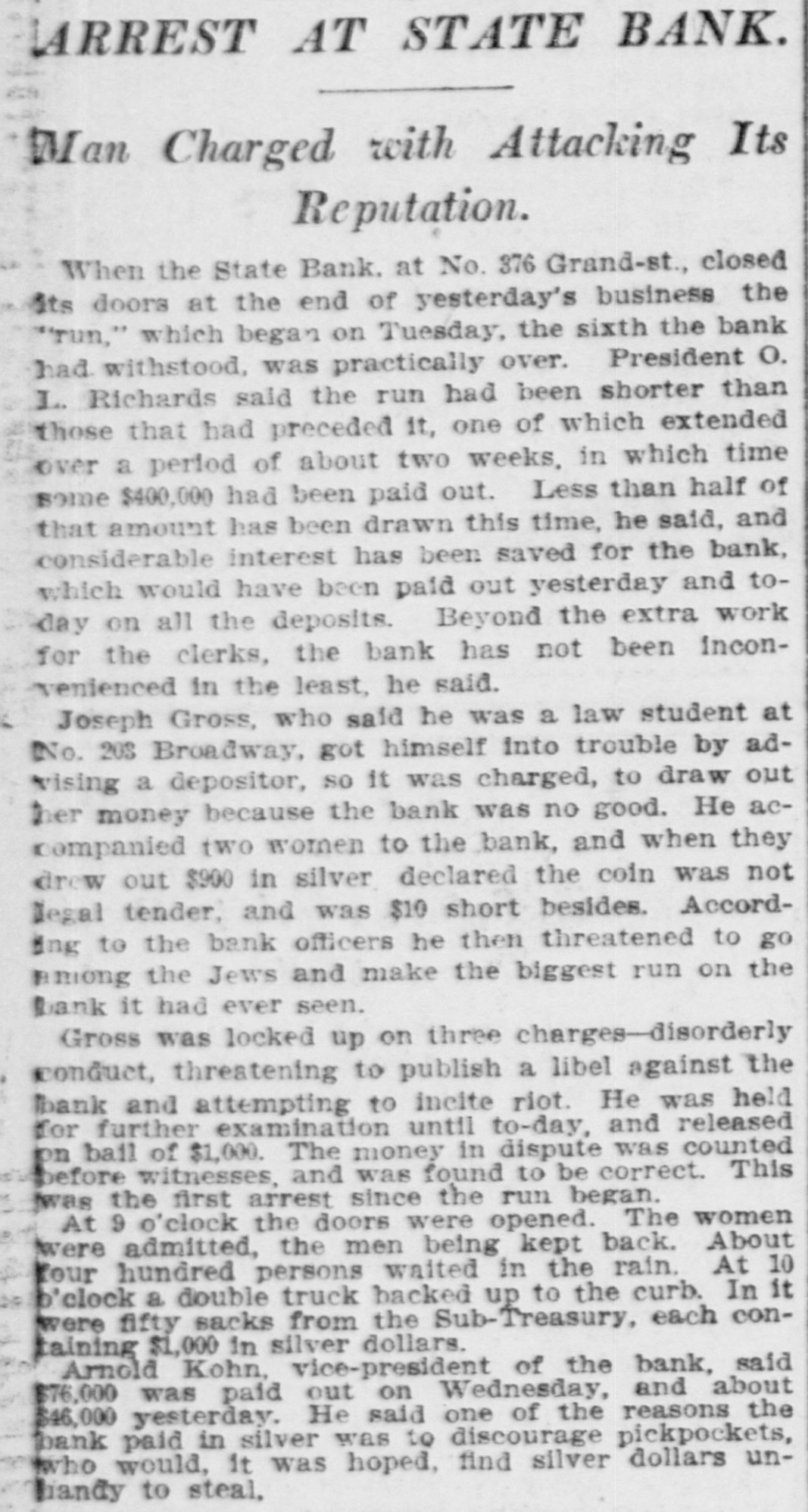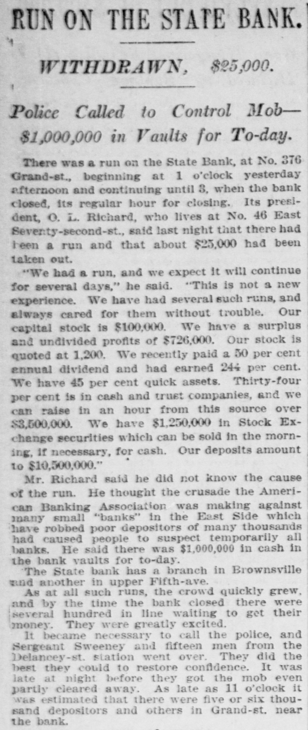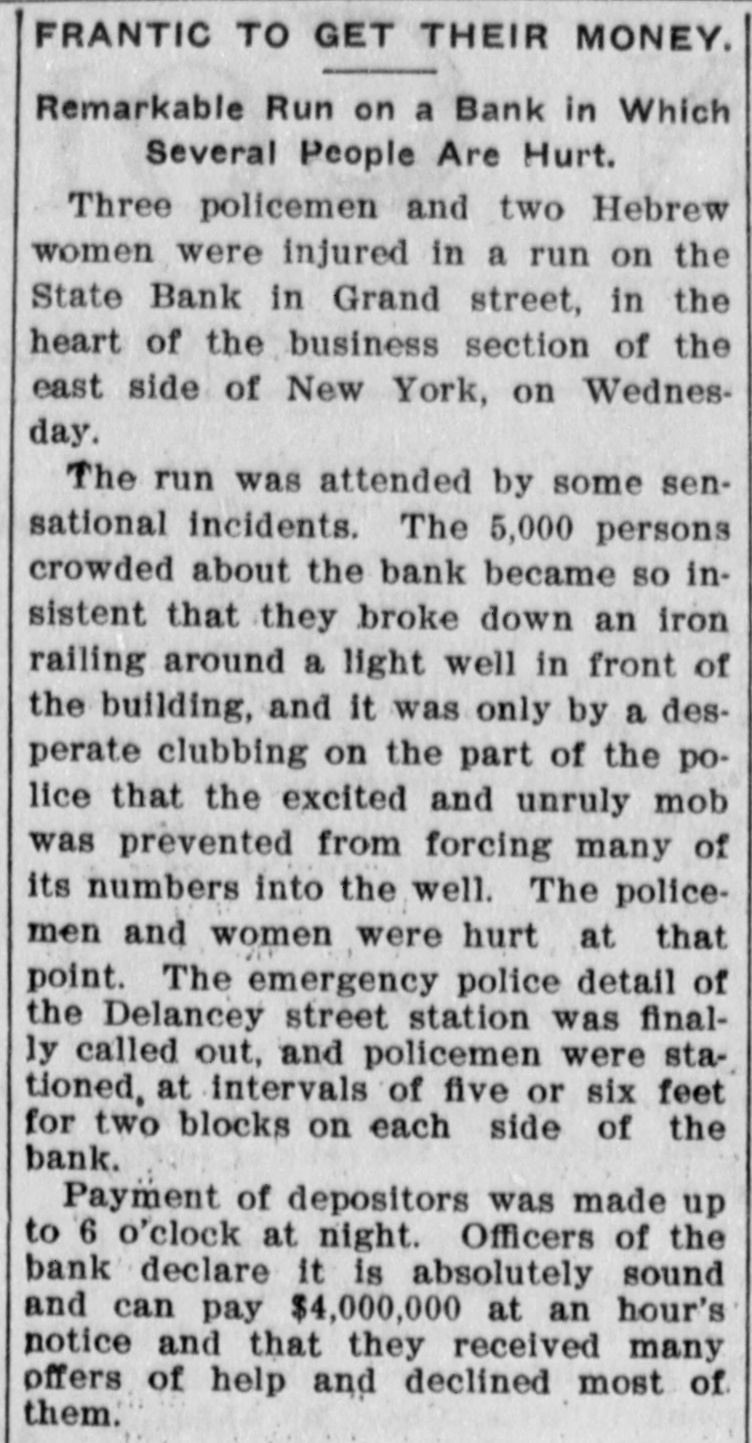 PROSPERITY STARTS BANK RUN POLICE CLUBS CLEAR SCARED HEBREWS OUT OF GRAND ST. They Saw a Crowd Depositing its Money at the State Bank and Imagined the Bank in Trouble-Thousends There After It Closed, Blocking Traffic. Because several hundreds of Hebrew depositors were seen going into the savings bank department of the State Bank in Grand street yesterday and coming out with their bankbooks a rumor started that the bank was in trouble and a run on it began, which ended after the bank had closed and the sweatshops had sent their workers home, in almost a riot. The fact that the crowd about the bank whose presence started the rumor had gone there to put money in in time to get interest on it for the present quarter, and not to take it out didn't matter at all to the scared depositors. After the bank closed the two lone cops sent there on special duty were swept off their feet. They telephoned for help to the Eldridge street station and Sergt. Sweeney had to rush thirty-five reserves there. It was neces: sary for the police to draw their clubs to clear the street. This was at 6 o'clock last night. Traffle on Grand street was paralyzed, and only with the greatest difficulty did the policemen clear space enough to permit the Grand street cars to pass. It was estimated by the police that at 9 o'clock last night there were 15,000 people around the bank. Sam Cohen, the janitor, tried hard to convince them that the bank was all right but the crowd seemed to consider him anything but their friend. He finally put up a sign in Yiddish in the front window notifying them that the bank had lots of money, was in no danger of going to smash and that any depositor could have his money by bringing his book to the bank this morning. Yet at I o'clock this morning there were still several hundred persons in front of the place. Deposits made in the bank on or before Jan. 10 draw interest as from Jan. 1. Yesterday being the last day of grace there was all day a steady stream of men and women, nearly all of them typical Russian Jews. going in and out of the bank to get their dep. sits in. A little after noon the crowd grew so large as to have the appearance of a run on the bank, and on that basis somebody started the rumor that this was what it was. A train of powder is asbestos compared with a rumor of this kind on the East Side concerning a bank in which any number of the people around have deposits. The rumor about the State Bank did not seam to spread in the ordinary way. It was like an explosion from spontaneous combustion spread through many blooks. The tenements were emptied and the streets filled with wild eyed Hebrews, all chattering and gesticulating and all headed for the State Bank The quiet crowd clready assembled there to make deposits did not at first know what the invasion meant. When the rumor about the bank being in trouble was touched off among the wouldbe depositors there was another explosion. The chattering, creaming and gesticulating increased tenfold. Two extra policemen were sent for, and they had their hands full buffeting back the waves of half crazed people who tried to force their way into the bank to get their money out. Those who bad come to deposit remained to withdraw. and it was the paying teller's turn to be busy. "We had something like this in the Spansh war." said Arnold Kohn. vice-president and manager of the bank, as he looked with an amused smile at the eagar upurned faces in the street at closing ime before the thing grew so serious. It was started by a rumor as absurd this. It WITH reported among the eonte around here that the Govern-