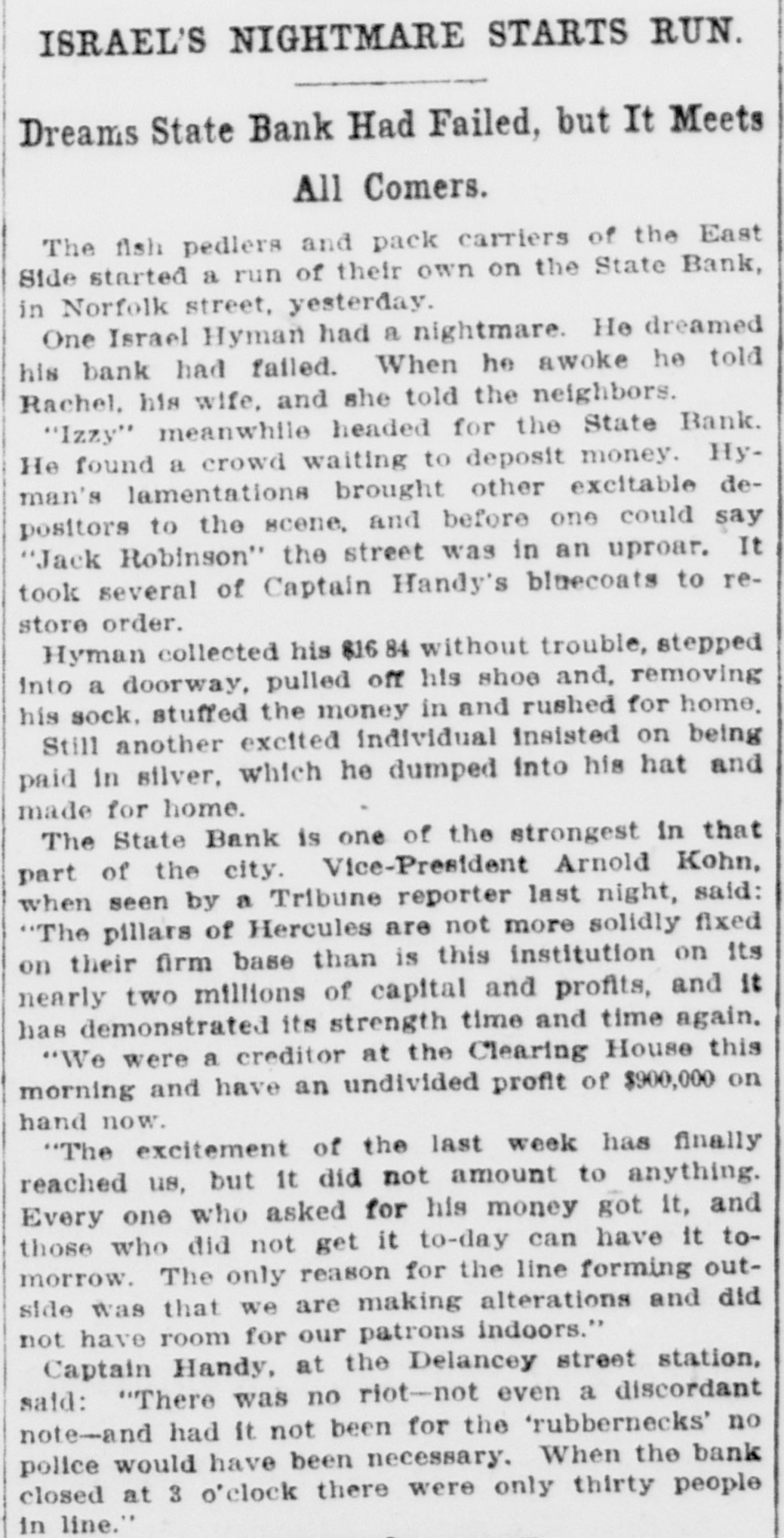ISRAEL'S NIGHTMARE STARTS RUN. Dreams State Bank Had Failed, but It Meets All Comers. The fish pedlers and pack carriers of the East Side started a run of their own on the State Bank, in Norfolk street, yesterday. One Israel Hyman had a nightmare. He dreamed his bank had failed. When he awoke he told Rachel, his wife, and she told the neighbors. "Izzy" meanwhile headed for the State Bank. He found a crowd waiting to deposit money. Hyman's lamentations brought other excitable depositors to the scene, and before one could say "Jack Robinson" the street was in an uproar. It took several of Captain Handy's bluecoats to restore order. Hyman collected his 816 without trouble, stepped into a doorway, pulled off his shoe and, removing his sock, stuffed the money in and rushed for home. Still another excited individual insisted on being paid in silver, which he dumped into his hat and made for home. The State Bank is one of the strongest in that part of the city. Vice-President Arnold Kohn, when seen by a Tribune reporter last night, said: "The pillars of Hercules are not more solidly fixed on their firm base than is this institution on its nearly two millions of capital and profits, and it has demonstrated its strength time and time again. "We were a creditor at the Clearing House this morning and have an undivided profit of $900,000 on hand now. "The excitement of the last week has finally reached us, but It did not amount to anything. Every one who asked for his money got it, and those who did not get it to-day can have it tomorrow. The only reason for the line forming outside was that we are making alterations and did not have room for our patrons indoors." Captain Handy, at the Delancey street station, said: "There was no riot-not even a discordant note-and had it not been for the 'rubbernecks' no police would have been necessary. When the bank closed at 3 o'clock there were only thirty people in line."