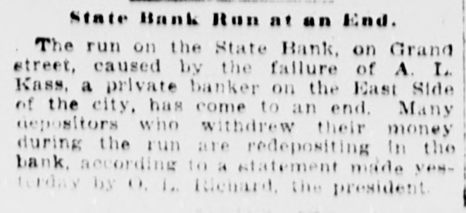 Kobre, Ginsberg and Lawyer Accused by Grand Jury in Brooklyn. NEW BANK RUNS ON EAST SIDE Nervous Depositors Throng Institutions, Despite Their Readiness to Pay All. max Kobre, Moses Ginsberg, his partner and manager of the Brownsville branch of his private banking business, and David E. Singer, his lawyer son-in-law, were indicted again yesterday, and Singer spent last night in Raymond st. jail, Brooklyn. District Attorney Cropsey obtained the indictments. ess than a month ago the same trio were indicted on this side of the East River. At that time Charles Dushkind, Special Assistant District Attorney, asserted that one of the men dumped $60,000 and another $50,000 into Wall Street shortly before their banks closed, early in August. Of the third he said there was proof to show that a check for $25,000 was handed to his lawyer the night before the banks closed. It is believed that this $25,000 transaction figures in the Brooklyn indictments and that Singer was the man it is alleged the check was given to. Kobre is also concerned in this, according to the District Attorney's office, and indicted as well for receiving deposits after he knew his bank was insolvent. There is a. forgery charge against Ginsberg. Runs continued on the Public Bank, at Delancey and Ludlow sts., and the State Bank, at Grand and Orchard sts., yesterday. Lines of overanxious depositors began to form in front of the two institutions as early as 2 o'clock in the morning. Questions asked of the nervous people by reporters failed to reveal the source of rumors that the banks were in any way unsafe. Nevertheless, ever since the closing of the Kass banks the susceptible East Side has been in a flurry over banks in general, and this is said by bankers to be the reason for the runs. Before 9 a. m. there were about 500 persons in line at each bank, with police reserves keeping order. The line in front of the State Bank extended to Norfolk st., to Broome st., and east to Suffolk st. The line in front of the Public Bank extended west on Delancey st. to Orchard and south to Broome st. At the Public Bank depositors were paid off at the rate of five every thirty minutes, and at the State Bank at the rate of ten in the same period. Speculators appeared offering to buy from the depositors their accounts at 90 per cent of their value, but the police soon drove these men away, All day the banks kept on paying money out, and at closing hour, which was at the usual time, 3 o'clock, there were still about 2,000 persons in the vicinity of each