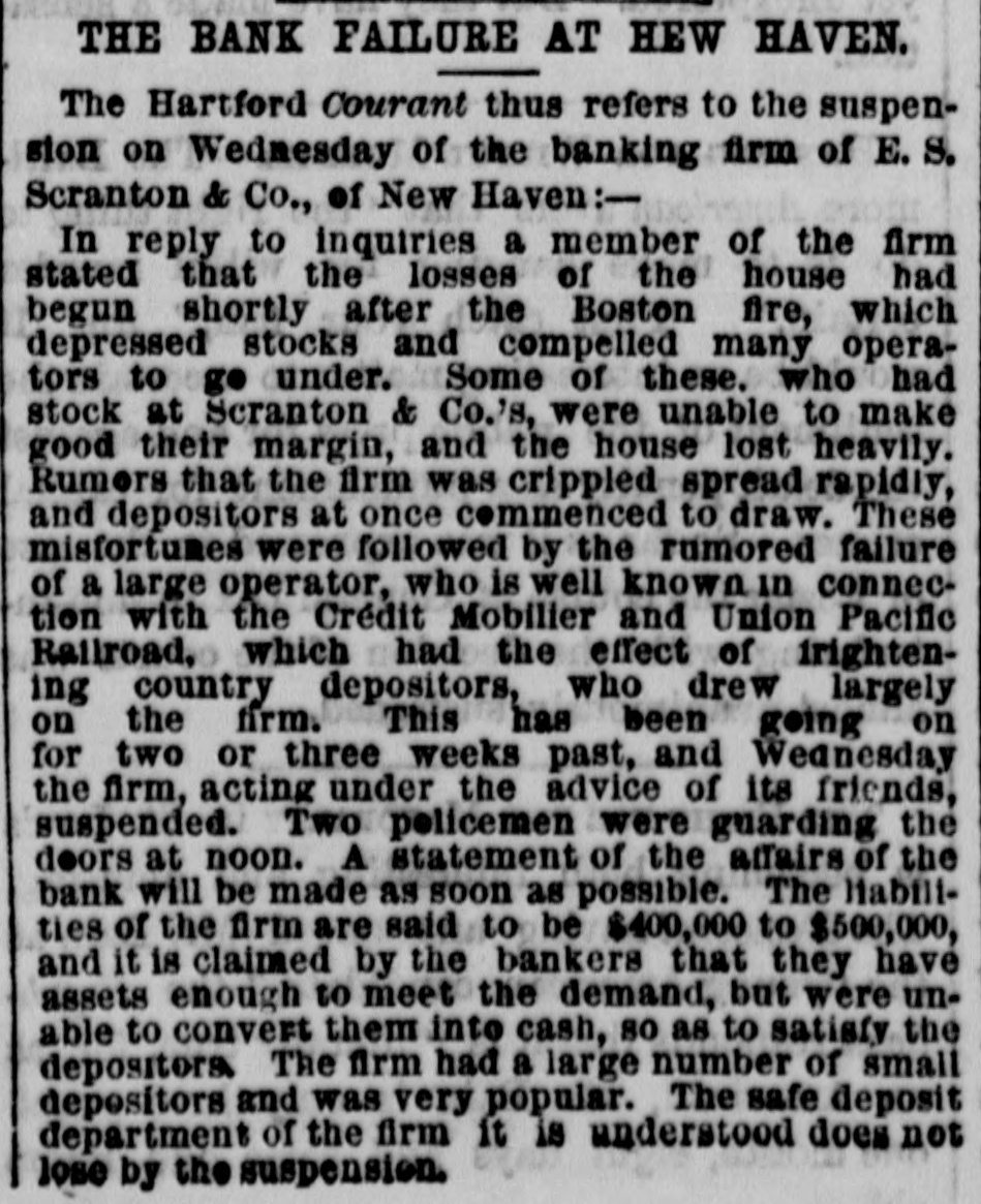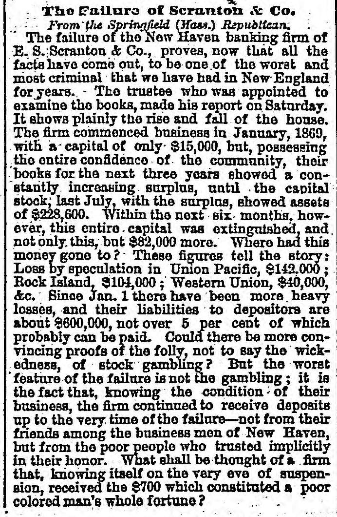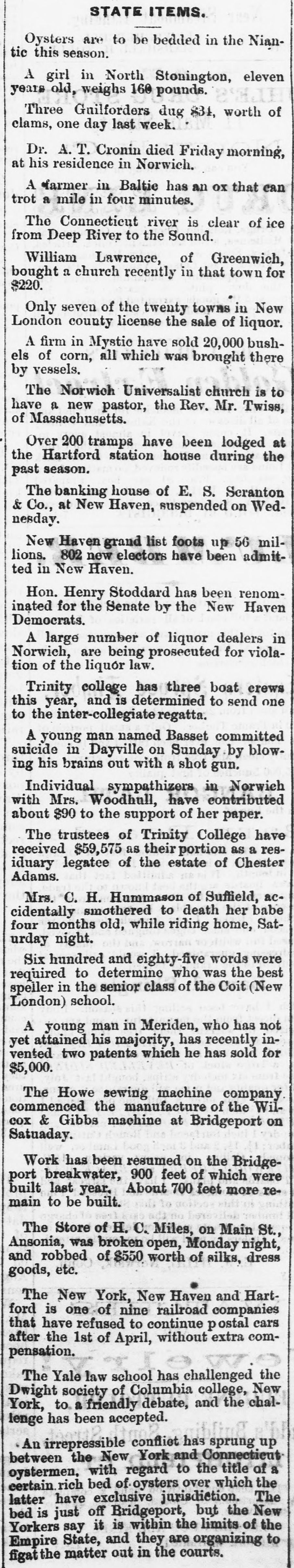 STATE ITEMS. Oysters are to be bedded in the Niantic this season. A girl in North Stonington, eleven years old, weighs 160 pounds. Three Guilforders dug 834, worth of clams, one day last week. Dr. A. T. Cronin died Friday morning, at his residence in Norwich. A farmer in Baltic has an OX that can trot a mile in four minutes. The Connecticut river is clear of ice from Deep River to the Sound. William Lawrence, of Greenwich, bought a church recently in that town for $220. Only seven of the twenty towns in New London county license the sale of liquor. A firm in Mystic have sold 20,000 bushels of corn, all which was brought there by vessels. The Norwich Universalist church is to have a new pastor, the Rev. Mr. Twiss, of Massachusetts. Over 200 tramps have been lodged at the Hartford station house during the past season. The banking house of E. S. Scranton & Co., at New Haven, suspended on Wednesday. New Haven grand list foots up 56 millions. 802 new electors have been admitted in New Haven. Hon. Henry Stoddard has been renominated for the Senate by the New Haven Democrats. A large number of liquor dealers in Norwich, are being prosecuted for violation of the liquór law. Trinity college has three boat crews this year, and is determined to send one to the inter-collegiate regatta. A young man named Basset committed suicide in Dayville on Sunday by blowing his brains out with a shot gun. Individual sympathizers in Norwich with Mrs. Woodhull, have contributed about $90 to the support of her paper. The trustees of Trinity College have received $59,575 as their portion as a residuary legatee of the estate of Chester Adams. Mrs. C. H. Hummason of Suffield, accidentally smothered to death her babe four months old, while riding home, Saturday night. Six hundred and eighty-five words were required to determine who was the best speller in the senior class of the Coit (New London) school. A young man in Meriden, who has not yet attained his majority, has recently invented two patents which he has sold for $5,000. The Howe sewing machine company commenced the manufacture of the WilCOX & Gibbs machine at Bridgeport on Satuaday. Work has been resumed on the Bridgeport breakwater, 900 feet of which were built last year. About 700 feet more remain to be built. The Store of H. C. Miles, on Main St., Ansonia, was broken open, Monday night, and robbed of $550 worth of silks, dress goods, etc. The New York, New Haven and Hartford is one of nine railroad companies that have refused to continue postal cars after the 1st of April, without extra compensation. The Yale law school has challenged the Dwight society of Columbia college, New York, to a friendly debate, and the challenge has been accepted. An irrepressible confliet has sprung up between the New York and Connecticut oystermen, with regard to the title of a certain rich bed of oysters over which the latter have exclusive jurisdiction. The bed is just off Bridgeport, but the New Yorkers say it is within the limits of the Empire State, and they are organizing to figat the matter out in the courts.