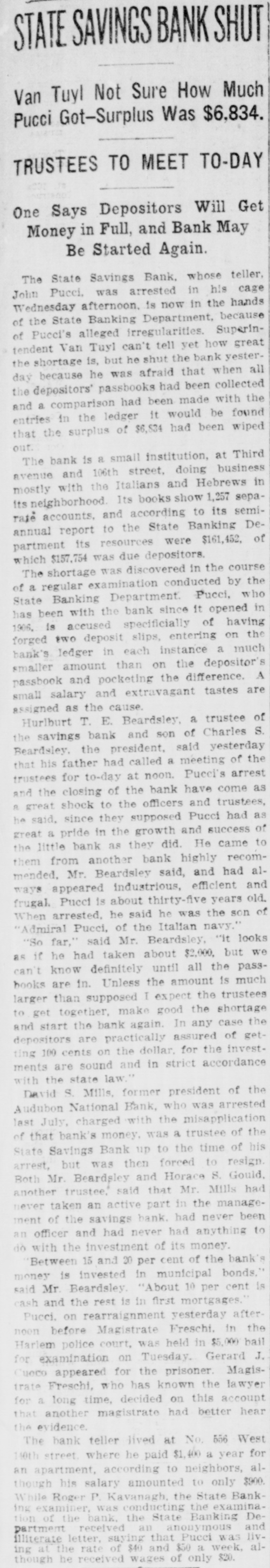 STATE SAVINGS BANK SHUT Van Tuyl Not Sure How Much Pucci Got-Surplus Was $6.834. TRUSTEES TO MEET TO-DAY One Says Depositors Will Get Money in Full, and Bank May Be Started Again. The State Savings Bank, whose teller, John Pucci. was arrested in his cage Wednesday afternoon. is now in the hands the State Banking Department. because of Pucci's alleged irregularities. Superinof tendent Van Tuyl can't tell yet how great shortage is, but he shut the bank yester- all the because he was afraid that when the day depositors' passbooks had been collected the a comparison had been made with and in the ledger it would be found that entries the surplus of $6,834 had been wiped out. The bank is a small institution, at Third and 106th street, doing business avenue with the Italians and Hebrews in its mostly neighborhood Its books show 1,257 semi- separate accounts, and according to its annual report to the State Banking De- of partment its resources were $161,452. which $157,754 was due depositors. The shortage was discovered in the course a regular examination conducted by who the of State Banking Department Pucci, has been with the bank since it opened in 1906, is accused specifically of having the forged two deposit slips, entering on bank's ledger in each instance a much smaller amount than on the depositor's A passbook and pocketing the difference. small salary and extravagant tastes are assigned as the cause Hurlburt T. E. Beardsley, a trustee of S. the savings bank and son of Charles Beardsley, the president, said yesterday that his father had called a meeting of the trustees for to-day at noon. Pucci's arrest and the closing of the bank have come as a great shock to the officers and trustees, he said, since they supposed Pucci had as great a pride in the growth and success of the little bank as they did. He came to them from another bank highly recommended. Mr. Beardsley said, and had always appeared industrious, efficient and frugal. Pucci is about thirty-five years old. of When arrested, he said he was the son "Admiral Pucci, of the Italian navy." "So far," said Mr. Beardsley, "It looks as if he had taken about $2,000, but we can't know definitely until all the passbooks are in. Unless the amount is much larger than supposed I expect the trustees to get together. make good the shortage and start the bank again. In any case the depositors are practically assured of getting 100 cents on the dollar. for the investments are sound and in strict accordance with the state law. David S. Mills, former president of the Audubon National Bank, who was arrested last July, charged with the misapplication of that bank's money. was a trustee of the Bank up to the time of his but was then to arrest, State Savings forced resign. and Horace S. Gould said that Mr. another Both Mr. trustee." Beardsley Mills had never taken an active part in the managethe savings bank. had never ment of anything been an officer and had never had to do the investment of its 15 and 20 per cent of bank's Between with money. the money is invested in municipal bonds. said Mr. Beardsley "About 10 per cent is cash and the rest is in first mortgages. Pucci. on rearraignment yesterday afternoon before Magistrate Freschi. in the court, was held in Harlem examination police Gerard $5,000 bail for on Tuesday. J. for the trate who has Cuoco Freschi, appeared known prisoner. the Magis- lawyer for a time, decided on account that magistrate had another long this better hear the evidence The bank teller lived at No. 556 West 140th street where he paid $1,400 a year for an according to apartment, neighbors, only $900. although his salary amounted to P. Kavanagh, the ing was conducting the While examiner, Roger Banking State examina- Bank- Detion of the bank. the State received an and saying that livrate of $40 and $50 a alpartment ing illiterate at the letter, anonymous Pucci week, was $20. though he received wages of only