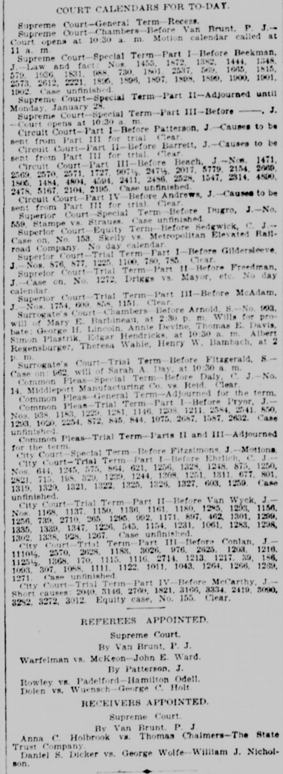 COURT CALENDARS FOR TO-DAY. Supreme Court-General Term-Recess. Supreme Court-Chambers-Before Van Brunt. P. J.Court opens at 10:30 a. m. Motion calendar called at 11 a. m. Supreme Court-Special Term-Part I-Before Beekman. J.-Law and fact: Nos. 1455, 1872, 1382, 1444, 1348. 579. 1936, 1831, 988, 730. 1801. 2537, 569, 1665, 1815, 2573. 2612, 2221. 1895, 1896, 1897, 1898, 1899, 1900, 1901, 1902. Case unfinished. Supreme Court-Special Term-Part II-Adjourned until Monday. January 28. Supreme Court-Special Term-Part III-Before - J. -Court opens at 10:30 a m. Circuit Court-Part I-Before Patterson, J.-Causes to be sent from Part III for trial Clear. Circuit Court-Part II-Before Barrett, J.-Causes to be sent from Part III for trial. Clear. Circuit Court-Part III-Before Beach. J.-Nos. 1471, 2569. 2570. 2571, 1727, 90714, 247½. 2017, 5779. 2154, 2669, 1805. 1484, 4804, 4594, 2411, 2486, 2528, 1547, 2314. 4890, 2478, 5167. 2104, 2195. Case unfinished. Circuit Court-Part IV-Before Andrews, J.-Causes to be sent from Part III for trial. Clear. Superior Court-Special Term-Before Dugro, J.-No. 559, Stampe vs. Strauss. Case unfinished. Superior Court-Equity Term-Before Sedgwick, C. J.-Case on, No. 153. Skelly V8. Metropolitan Elevated Railroad Company. No day calendar. Superior Court-Trial Term-Part I-Before Gildersleeve, J.-Nos. 876, 877, 1225, 1100, 780, 785. Clear. Supretor Court-Trial Term-Part II-Before Freedman, J.-Case on, No. 1272, Driggs vs. Mayor, etc. No day calendar. Superior Court-Trial Term-Part III-Before McAdam. J.-Nos. 1754, 609, 858, 1151. Clear. Surrogate's Court-Chambers-Before Arnold, S.-No. 993, will of Mary E. Barbineau, at 2:30 D. m. Wills for probate: George H. Lincoin, Annie Devine, Thomas E. Davis. Simon Plastrik, Edgar Hendricks, at 10:30 a. m. Albert Regensburger, Theresa Wahle, Henry W. Bambach, at 2 P. m. Surrogate's Court-Trial Term-Before Fitzgerald, S.Case on: 962, will of Sarah A. Day. at 10:30 a. m. Common Pleas-Special Term-Before Daly, C. J.-No. 14, Middleport Manufacturing Co. V8. Reid. Clear. Common Pleas-General Term-Adjourned for the term. Common Pleas-Trial Term-Part I-Before Pryor, J.Nos. 938, 1183, 1229. 1281, 1146. 1208. 1211. 2584, 2541. 850, 1293, 1020, 2254, 872, 845, 844, 1075, 2687, 1587, 2632. Case unfinished. Common Pleas-Trial Term-Parts II and III-Adjourned for the term. City Court-Special Term-Before Fitzsimons J.-Motions. City Court-Trial Term-Part I-Before Ehrlich, C. J.Nos. 644, 1245, 575, 864, 621, 1256, 1328, 1248, 875, 1250, 2821. 715. 198, 329, 1239, 1244, 1308, 1251, 1311. 677, 801, 1319, 1320. 1321. 1322, 1325, 1326, 1327, 603, 1259. Case unfinished. City Court-Trial Term-Part II-Before Van Wyck, J.Nos. 1168, 1137. 1150. 1136, 1161. 1180, 1285, 1293, 1156, 1256, 739, 2710, 265, 1295. 992, 1171. 897, 462, 1301, 1299, 1335, 1339, 1347. 1226, 545. 1154, 1231, 1061, 1283, 1298, 1302. 1338, 928, 1267. Case unfinished. City Court-Trial Term-Part III-Before Conlan, J.1110½. 2570, 2628. 1188. 3026, 976. 2625. 1203, 1216, 1125½, 1368. 170, 1115. 1116. 2714. 1213. 1217. 39, 186, 1093, 307. 1088, 1111. 1122. 1011. 1043, 1264, 1266, 1269, 1271. Case unfinished. City Court-Trial Term-Part IV-Before McCarthy, J.Short causes: 2040, 3146, 2760, 1821, 3166, 3334. 2419, 3090, 3282, 3272, 3012. Equity case, No. 155. Clear. REFEREES APPOINTED. Supreme Court. By Van Brunt, P.J. Warfelman vs. McKeon-John E. Ward. By Patterson. J. Rowley VS. Padelford-Hamilton Odell. Dolen vs. Wuensch-George C. Holt RECEIVERS APPOINTED. Supreme Court. By Van Brunt. P. J. Anna C. Holbrook vs. Thomas Chalmers-The State Trust Company. Daniel S. Dicker vs. George Wolfe-William J. Nicholson.