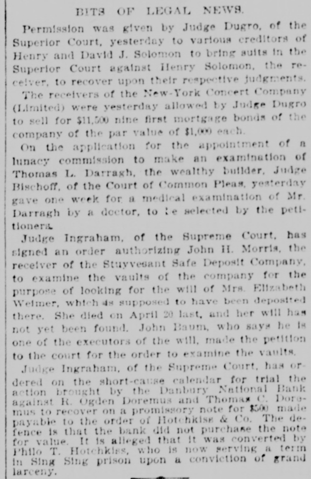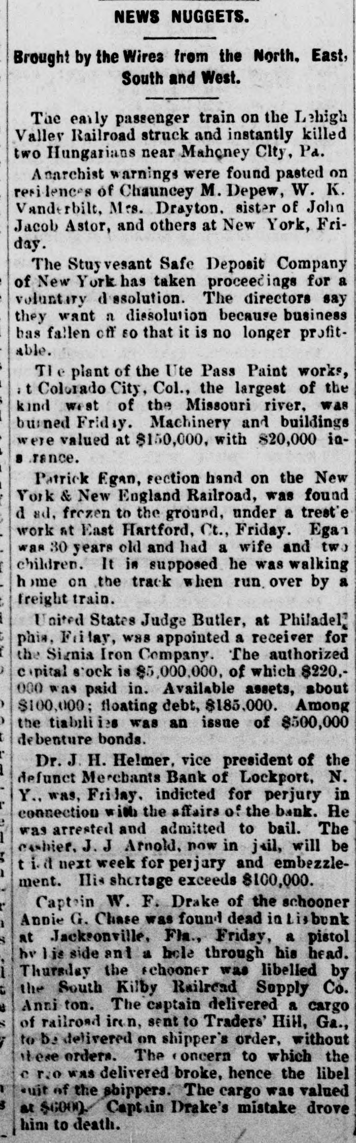 NEWS NUGGETS. Brought by the Wires from the North. East, South and West. The early passenger train on the Lehigh Valley Railroad struck and instantly killed two Hungarians near Mahoney City, Pa. Anarchist warnings were found pasted on residences of Chauncey M. Depew, W. K. Vanderbilt, Mrs. Drayton. sister of John Jacob Astor, and others at New York, Friday. The Stuyvesant Safe Deposit Company of New York has taken proceedings for a voluntary dissolution. The directors say they want a dissolution because business has fallen off 80 that it is no longer profitable. TI plant of the Ute Pass Paint works, Colorado City, Col., the largest of the kind west of the Missouri river, was burned Friday. Machinery and buildings were valued at $150,000. with $20,000 ia8 rance. Patrick Egan, section hand on the New York & New England Railroad, was found d ad, frezen to the ground, under a trest'e work at East Hartford, Ct., Friday. Egan was 30 years old and had a wife and two children. It in supposed he was walking home on the track when run. over by a freight train. United States Judge Butler, at Philadel phis, Fritay, was appointed a receiver for the Signia Iron Company. The authorized capital stock is $5,000,000, of which $220.000 was paid in. Available assets, about $100,000; floating debt, $185,000. Among the tiabilities was an issue of $500,000 debenture bonds. Dr. J. H. He!mer, vice president of the defunct Merchants Bank of Lockport, N. Y., was, Friday. indicted for perjury in connection with the affairs of the bank. He was arrested and admitted to bail. The cashier, J.J Arnold, now in juil, will be t a next week for perjury and embezzlement. Ilis shortage exceeds $100,000. Captain W. F. Drake of the schooner Annie G. Chase was found dead in Lisbunk at Jacksonville, Fla., Friday, a pistol by lis side and a hole through his head. Thursday the schooner was libelled by the South Kilby Railread Supply Co. Anni ton. The captain delivered a cargo of railroad iron, sent to Traders' Hill, Ga., to be delivered on shipper's order, without these orders. The concern to which the e T20 was delivered broke, hence the libel suit of the shippers. The cargo was valued at $6000. Captain Drake's mistake drove him to death.