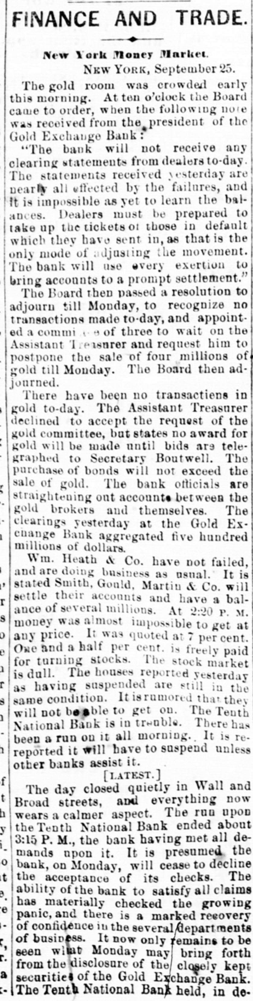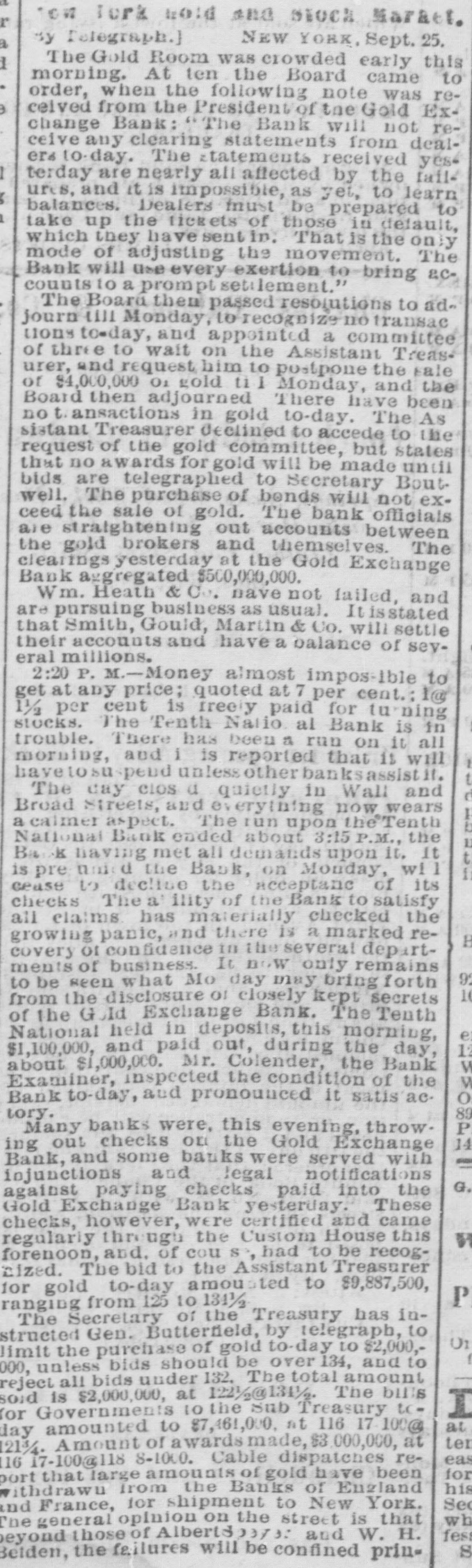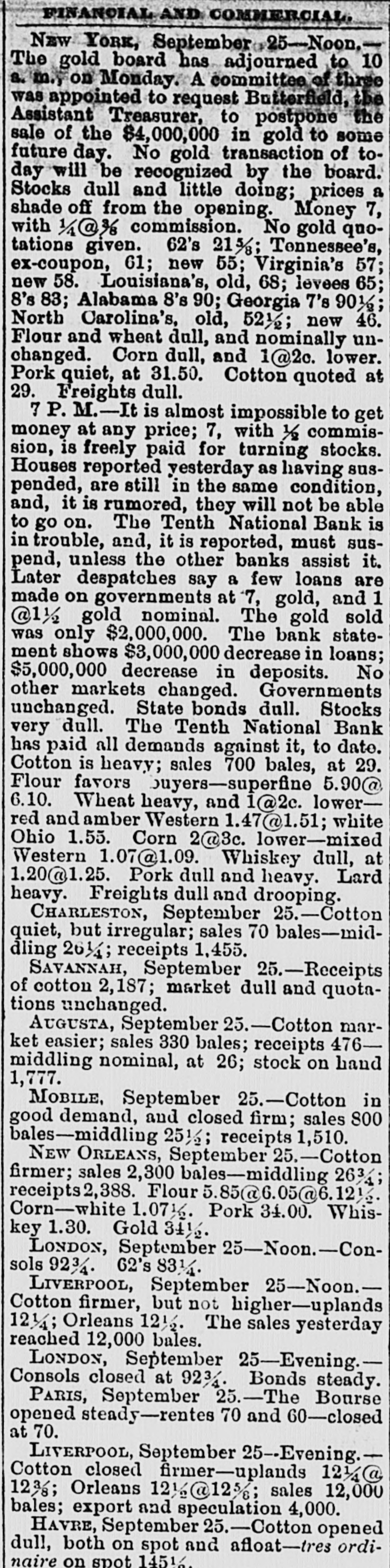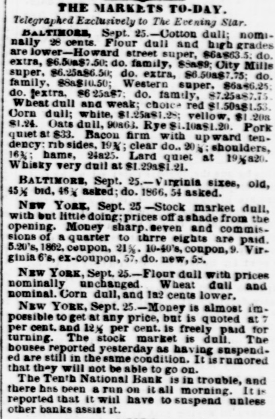 THE MARKETS TO-DAY. Telegraphed Exclusively to The Evening Star. BALTIMORE, Sept. 25.-Cotton dull; nominaily 28 cents. Flour dull and high grades are lower-Howard street super, $6a$63.5 do. extra, $6.5Ua$7.50 do. family, 85a$9; City Mills super, $6.25a86.50; do. extra, $6.508$7.75; do. family, 88a$10.50; Western super. $6a46.25 do. fextra, 8625a do. family, 87.25a87.75 Wheat dull and weak; choice red $1.50a$1.53. Corn dull; white, $1.25a@1.29; yellow, 81 208 $1.24. Oats dull, 90863. Rye $1.10a@1.20. Pork quiet at $33. Bacon firm with up ward tendency: rib sides, 19%; clear do., 20 is: shoulders, 16%; hame, 24a25. Lard quiet at 19X820. Whisky very dull at @1.29a@i.21. BALTIMORE, Sept. 25.-Virginia sixes, old, 45 1/2 bid, 46% asked; do. 1866, 54 asked. NEW YORK, Sept. 25 -Stock market dull, with but little doing; prices off a shade from the opening. Money sharp. seven and commissions of a quarter to thrre eights are paid. 5.20's, 1862, coupon, 21% 10-40's, coupon, 9. Virginia 6's, ex-coupon, 57, do. new, 5s. NEW YORK, Sept. Flour dull with prices nominally unchanged. Wheat dull and nominal. Corn dull, and 1a2 cents lower. NEW YORK, Sept. 25.-Money is almost im possible to get at any price, but is quoted at per cent. and 12% per cent. is freely paid for turning. The stock market is dull. The houses reported yesterday as having suspended are still in the same condition. It is rumored that they will not be able to go on. The Tenth National Bank is in trouble, and there has been a run on it all morning. It is reported that it will have to suspend unless other banks assist it.