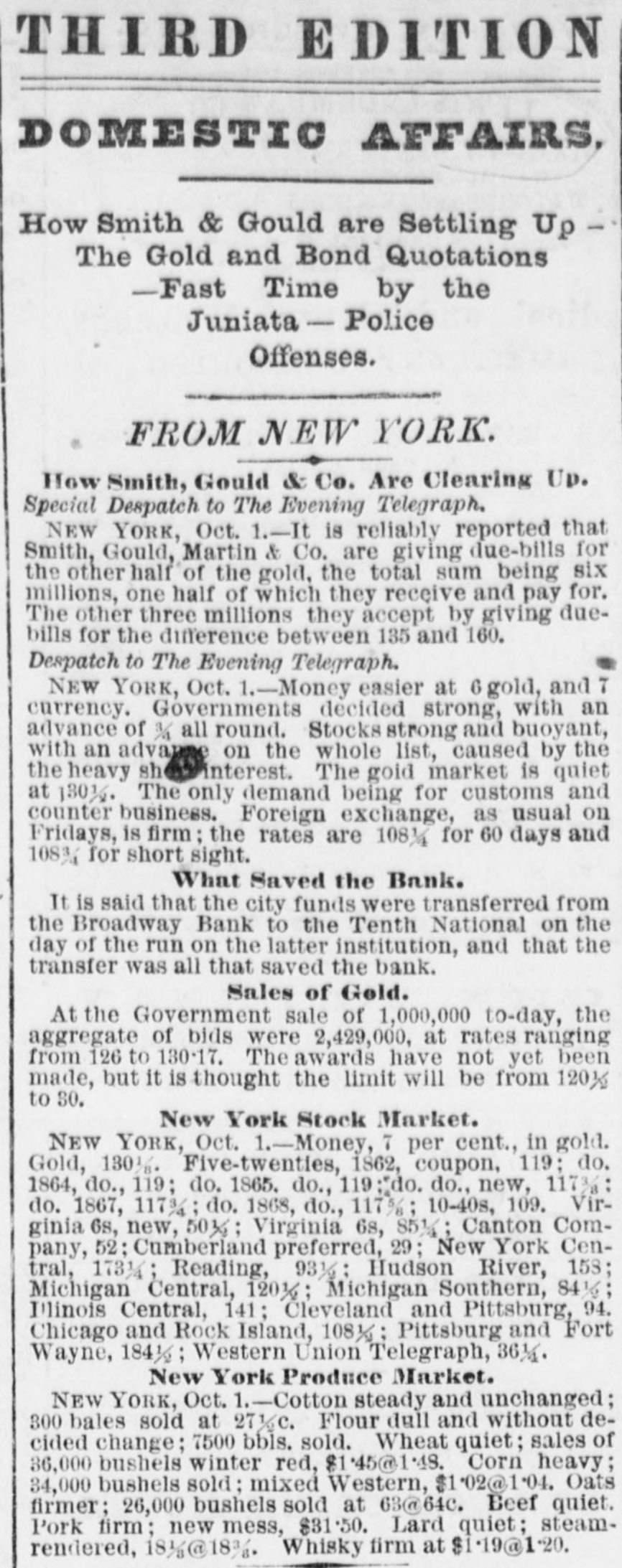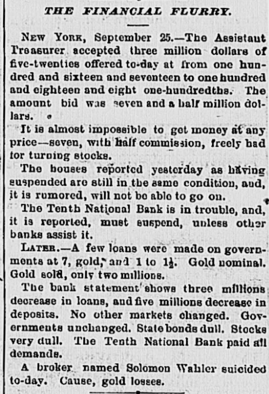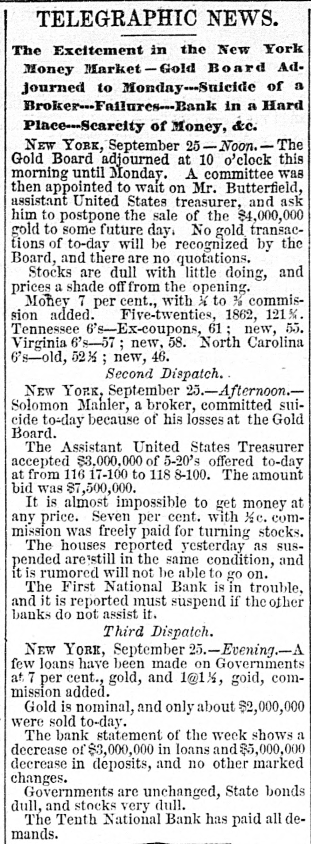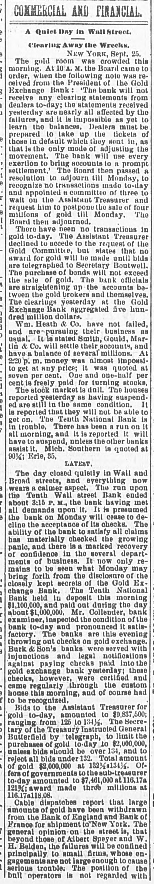 THE MARKETS TO-DAY. Telegraphed Exclusively to The Evening Star. BALTIMORE, Sept. 25.-Cotton dull; nominaily 28 cents. Flour dull and high grades are lower-Howard street super, $6a$63.5 do. extra, $6.5Ua$7.50 do. family, 85a$9; City Mills super, $6.25a86.50; do. extra, $6.508$7.75; do. family, 88a$10.50; Western super. $6a46.25 do. fextra, 8625a do. family, 87.25a87.75 Wheat dull and weak; choice red $1.50a$1.53. Corn dull; white, $1.25a@1.29; yellow, 81 208 $1.24. Oats dull, 90863. Rye $1.10a@1.20. Pork quiet at $33. Bacon firm with up ward tendency: rib sides, 19%; clear do., 20 is: shoulders, 16%; hame, 24a25. Lard quiet at 19X820. Whisky very dull at @1.29a@i.21. BALTIMORE, Sept. 25.-Virginia sixes, old, 45 1/2 bid, 46% asked; do. 1866, 54 asked. NEW YORK, Sept. 25 -Stock market dull, with but little doing; prices off a shade from the opening. Money sharp. seven and commissions of a quarter to thrre eights are paid. 5.20's, 1862, coupon, 21% 10-40's, coupon, 9. Virginia 6's, ex-coupon, 57, do. new, 5s. NEW YORK, Sept. Flour dull with prices nominally unchanged. Wheat dull and nominal. Corn dull, and 1a2 cents lower. NEW YORK, Sept. 25.-Money is almost im possible to get at any price, but is quoted at per cent. and 12% per cent. is freely paid for turning. The stock market is dull. The houses reported yesterday as having suspended are still in the same condition. It is rumored that they will not be able to go on. The Tenth National Bank is in trouble, and there has been a run on it all morning. It is reported that it will have to suspend unless other banks assist it.