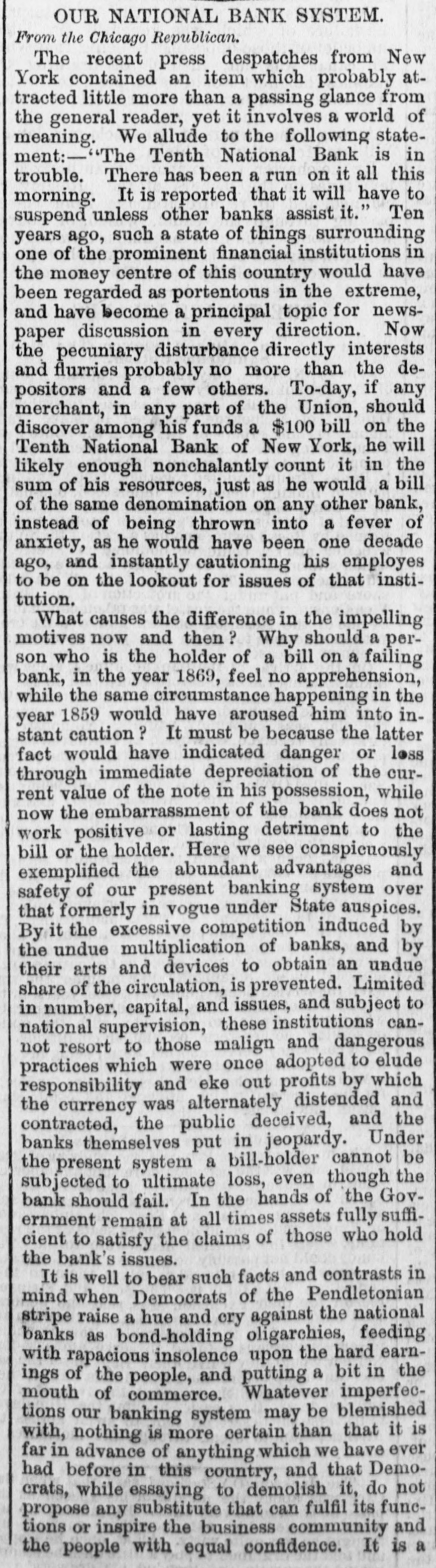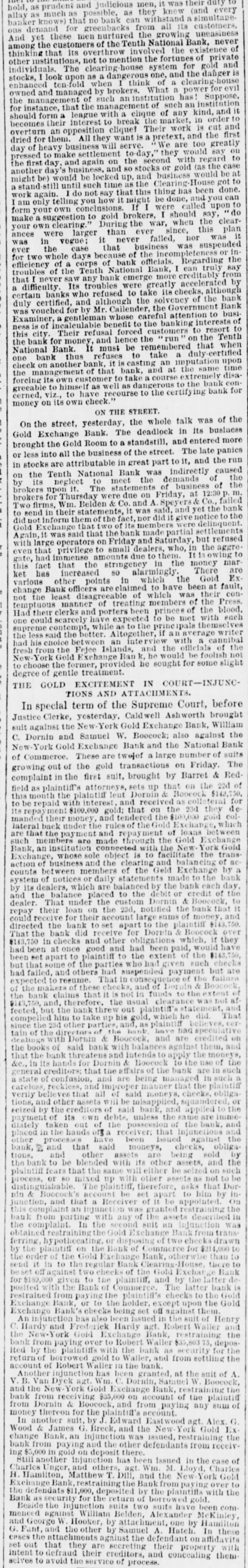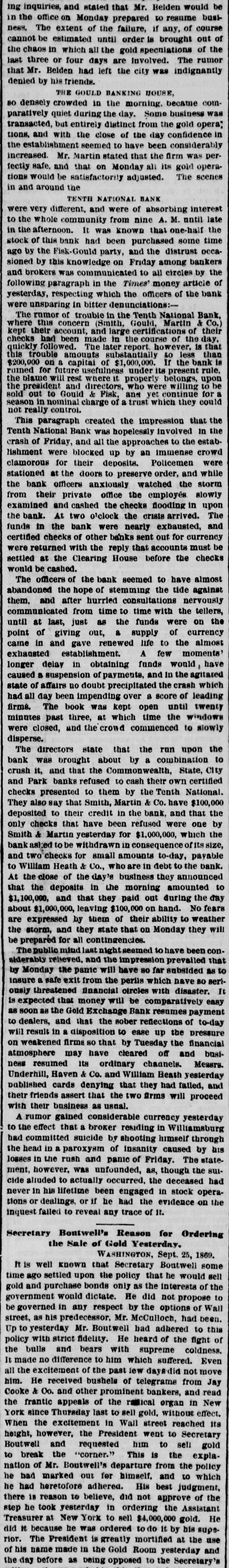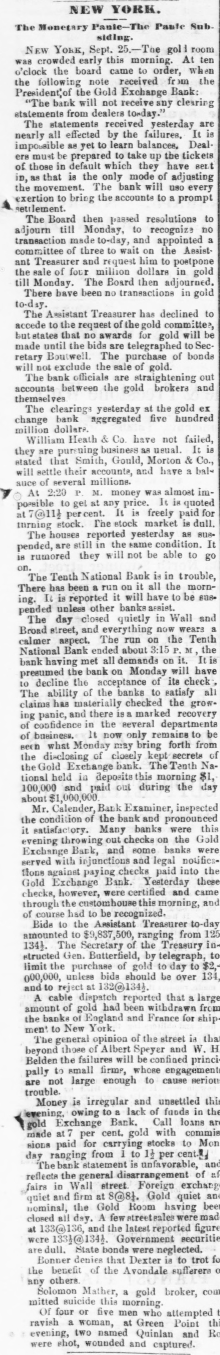 THE MARKETS TO-DAY. Telegraphed Exclusively to The Evening Star. BALTIMORE, Sept. 25.-Cotton dull; nominaily 28 cents. Flour dull and high grades are lower-Howard street super, $6a$63.5 do. extra, $6.5Ua$7.50 do. family, 85a$9; City Mills super, $6.25a86.50; do. extra, $6.508$7.75; do. family, 88a$10.50; Western super. $6a46.25 do. fextra, 8625a do. family, 87.25a87.75 Wheat dull and weak; choice red $1.50a$1.53. Corn dull; white, $1.25a@1.29; yellow, 81 208 $1.24. Oats dull, 90863. Rye $1.10a@1.20. Pork quiet at $33. Bacon firm with up ward tendency: rib sides, 19%; clear do., 20 is: shoulders, 16%; hame, 24a25. Lard quiet at 19X820. Whisky very dull at @1.29a@i.21. BALTIMORE, Sept. 25.-Virginia sixes, old, 45 1/2 bid, 46% asked; do. 1866, 54 asked. NEW YORK, Sept. 25 -Stock market dull, with but little doing; prices off a shade from the opening. Money sharp. seven and commissions of a quarter to thrre eights are paid. 5.20's, 1862, coupon, 21% 10-40's, coupon, 9. Virginia 6's, ex-coupon, 57, do. new, 5s. NEW YORK, Sept. Flour dull with prices nominally unchanged. Wheat dull and nominal. Corn dull, and 1a2 cents lower. NEW YORK, Sept. 25.-Money is almost im possible to get at any price, but is quoted at per cent. and 12% per cent. is freely paid for turning. The stock market is dull. The houses reported yesterday as having suspended are still in the same condition. It is rumored that they will not be able to go on. The Tenth National Bank is in trouble, and there has been a run on it all morning. It is reported that it will have to suspend unless other banks assist it.