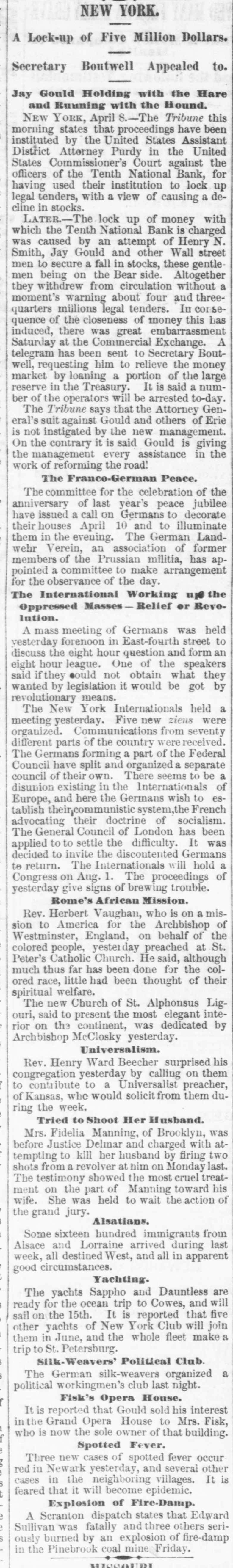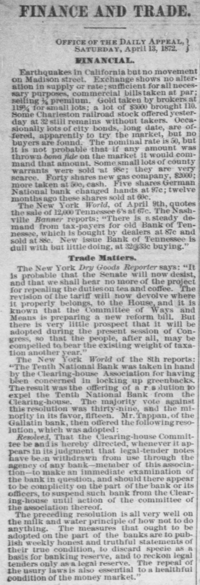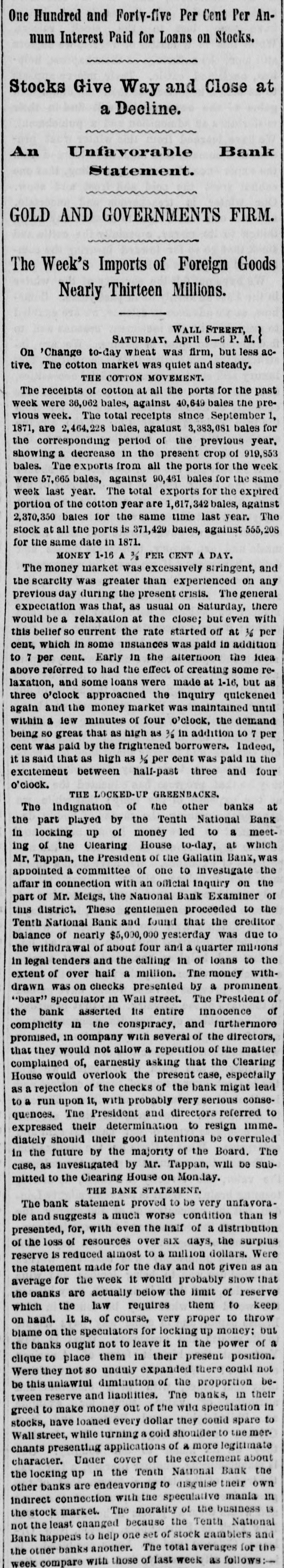 A SLIGHT ADVANCE IN GOLD. Government Bonds Steady and Firm. THE SOUTHERN LIST QUIET AND IGNORED. Heavy Imports of Foreign Dry Goods. WALL STREET, FRIDAY. April 5-6 P.M. on 'Change to-day wheat was firm, but inclined to dulness. The cotton market was steady. THE DRY GOODS IMPORTS. The imports or dry goods at this port during the past week were $5,430,901. The amount marketed was $4.833,080. MONEY STRINGENT. The money market was stringent throughout the day, and as high as 3-16 per cent was paid, in addition to per cent, equivalent to about 75 per cent per annum. The standing bid most of the time was 1/6 per cent, or 45 per cent per annum, Some of the leading government dealers got a little accommodation at plain 7 per cent, but loans to the best parties on stocks were made at 1/6 a 3-16 per cent. and coin interest was treely accepted by the anti-Shylock class of leaders, Bank accounts were unusually late, and many were not made up until near four o'clock. A little after three o'clock there was a brief cessation in the demand, and some lenders who came out to employ balances took per cent coin; but their offerings were rapidly absorbed, and s per cent was bid to the last moment the market hung together. As already intimated in this column the natural activity in money has been aggravated by artificial means. To-day the Tenth National Bank was creditor at the Clearing House for the unusual dif ference of $4,770,000. which amount must have been withdrawn from circulation by parties having ac. counts in that bank. The other banks venemently denounce the Tenth National for its connection, willingly or unwillingly, with this "lock-up," and were reported to have decided to exclude it from the Clearing House: but the rumor doubtless arose from a threat on the part of some of the officials of the Bank of Commerce that they would refuse to take the checks of the Tenth National it it reDeated these objectionable transactions. Whatever the agency of the bank, the parties owning the locked-up money are professional speculators, aiming by this means to produce a decline in prices, If not a panic, at the Stock Exchange. In this latter respect the scheme was a decided failure, as will be seen by the paragraph about stocks further on. Prime commercial paper IS quoted 8 a12 per cent discount, but is neglected. Foreign exchange was steady and a shade firmer at the rates given yesterday. GOLD STRONG-1103 A 110% The gold market was strong, but only moderately active at 11036 11014, with a few sales at 1103/ The closing quotation was 110 3-16 a 110%, with a number of bids at 1101, buyer three. The SubTreasury paid out $296,000 in redemption of the called bonds of 1862. In the gold loan market the rates ranged from per cent to 1-32 for carrying. The operations of the Gold Exchange Bank were as follows:$29,710,000 Gold cleared 1,216,674 Gold balances 1,376,306 Currency balances GOVERNMENTS STEADY. The government list was steady and quiet, which simple comment is about as much as can be made a upon the market. The foreign quotations were little lower, except in the one instance of the 67's, which were unchanged from yesterday. The follow. ing were the closing ces:-United States currency sixes, 11514 a 115% do. sixes, 1881, registered, 11414 115: do, do, coupon, 115% a 115%;do five-twenties, registered, May and November, 109 a 109%; do. do., 1862, coupon. do., 112 1/2 a 11234: do. do., 1864, do. do., 1121/4 a 112%: do. do., 1865, do. do., 1121 a 113; do. do., 1867, registered, January and July, 112% a 113; do. do., 1865, coupon. do., 11136 a 111%; do. do., 1867, do., do., 112% a 113; do. do., 1868, do., do., 112% a 113% do. fives of 1881, funded, registered, 109% a 110% do. do. do., coupon, 109% 1101/: do. ten-forties, registered, 107% a 108; do. do., coupon, 108 1/4 108 SOUTHERN SECURITIES QUIET. The Southern list was seldom so neglected, the in. difference of both the investment and speculative interest not being susceptible of ready explanation. unless on the theory that, these securities are now feeling the 111 effects of the scandalous administration of the finances of so many of the Southern States. The following were the prices at the close:Tennessee, ex coupon, (6 a 67; do. new, 66 67; Virginia, ex coupon, 50 a 56; do. registered stock, old, 44 a 49: do. sixes, consolidated bonds, 55 a 56; do. sixes, deferred scrip, 16 a 17; Georgia sixes, 73a78: do. sevens, 85 a 87; North Carolina, ex coupon, 36 % a 3736; do., new, 20 22; do., special tax, 14 a 16; Missouri sixes, 95% a 96; do., Hannibal and St. Joseph, 93 a 94; Louisiana sixes, 59 62: do. levee sixes, 60 a 63; do. do. eights, 70 80; Alabama fives, 58 a 62; do. eights, 85 a 90; South Carolina sixes, 52 a 53; do.. new. January and July, 373 38; do., do., April and October, 36 a 361/2; Arkansas sixes, funded, 54 a 58. THE ILLINOIS CENTRAL RAILROAD. The official report of the Illinois Central Railroad for the year 1871 contains the following summary or operations:The earnings of the line In Illinois were. $7,052,440 $8,817,009 The working expenses 463,512 And the State tax 4,280,522 Leaving net earnings The earnings of the leased lines in Iowa $2,771,918 were $1,348,701 Which, deducting the working expenses $824,910 543,328 Rent... 19.532 And taxes 1,387,772 $39,070 Shows deficit of in working the Iowa lines, and reduces the the net earnings or the lines operated by to... $2,732,847 company. 2,857,321 Against net earnings in 1870. 124,474 A falling OIT in 1871 of Making taxes the proportion of expenses and earnings The of the Land lands Department sold in 1871 48,927.31 61 per cent. acres railway for donated to aid the construction ot the the $469,404 26, making the to $23,349,721 close 24, and of 1871 2,215,789.77 aggregate acres sales for unsold at was the 319,210.23 which $1,000,000 acres: has $1,683,153 leaving 53 collected, that date of part and bond fund. The of the logg bonds by fire of the to trustees' construction records further literal compliance 