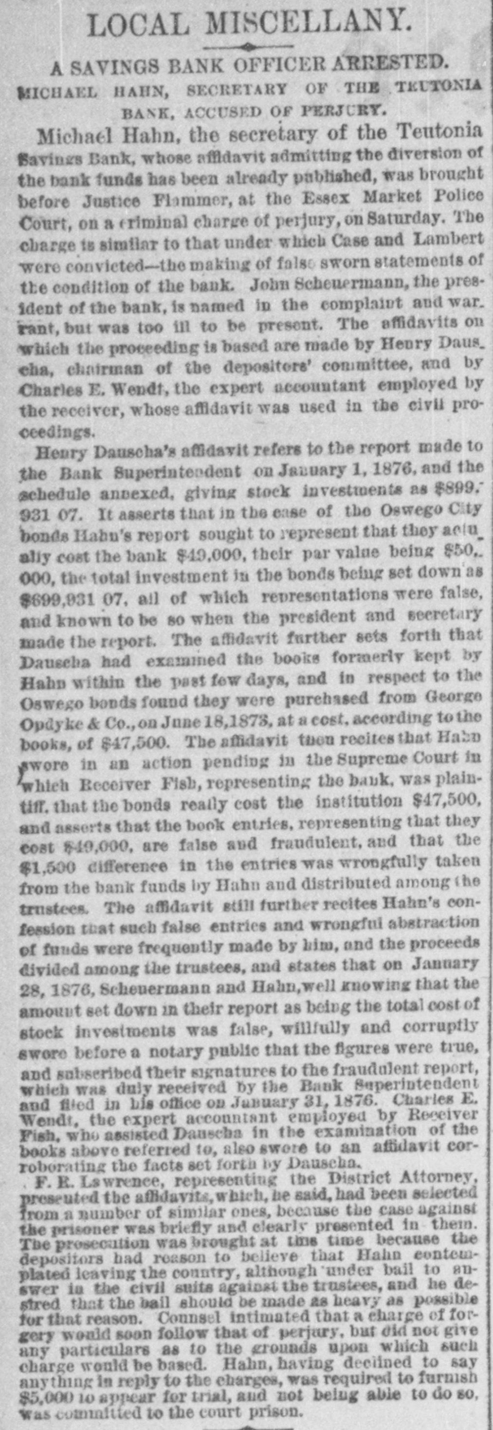 LOCAL MISCELLANY. # A SAVINGS BANK OFFICER ARRESTED. # MICHAEL HAHN, SECRETARY OF THE TEUTONIA BANK, ACCUSED OF PERJURY. Michael Hahn, the secretary of the Teutonia Savings Bank, whose affidavit admitting the diversion of the bank funds has been already published, was brought before Justice Flammer, at the Essex Market Police Court, on a criminal charge of perjury, on Saturday. The charge is similar to that under which Case and Lambert were convicted-the making of false sworn statements of the condition of the bank. John Scheuermann, the president of the bank, is named in the complaint and warrant, but was too ill to be present. The affidavits on which the proceeding is based are made by Henry Dauscha, chairman of the depositors' committee, and by Charles E. Wendt, the expert accountant employed by the receiver, whose affidavit was used in the civil proceedings. Henry Dauscha's affidavit refers to the report made to the Bank Superintendent on January 1, 1876, and the schedule annexed, giving stock investments as $899,931 07. It asserts that in the ease of the Oswego City bonds Hahn's report sought to represent that they actually cost the bank $49,000, their par value being $50,000, the total investment in the bonds being set down as $699,931 07, all of which representations were false, and known to be so when the president and secretary made the report. The affidavit further sets forth that Dauscha had examined the books formerly kept by Hahn within the past few days, and in respect to the Oswego bonds found they were purchased from George Opdyke & Co., on June 18, 1873, at a cost, according to the books, of $47,500. The affidavit then recites that Hahn swore in an action pending in the Supreme Court in which Receiver Fish, representing the bank, was plaintiff, that the bonds really cost the institution $47,500, and asserts that the book entries, representing that they cost $49,000, are false and fraudulent, and that the $1,500 difference in the entries was wrongfully taken from the bank funds by Hahn and distributed among the trustees. The affidavit still further recites Hahn's confession that such false entries and wrongful abstraction of funds were frequently made by him, and the proceeds divided among the trustees, and states that on January 28, 1876, Scheuermann and Hahn, well knowing that the amount set down in their report as being the total cost of stock investments was false, willfully and corruptly swore before a notary public that the figures were true, and subscribed their signatures to the fraudulent report, which was duly received by the Bank Superintendent and filed in his office on January 31, 1876. Charles E. Wendt, the expert accountant employed by Receiver Fish, who assisted Dauscha in the examination of the books above referred to, also swore to an affidavit corroborating the facts set forth by Dauscha. F. E. Lawrence, representing the District Attorney, presented the affidavits, which, he said, had been selected from a number of similar ones, because the case against the prisoner was briefly and clearly presented in them. The prosecution was brought at this time because the depositors had reason to believe that Hahn contemplated leaving the country, although 'under bail to answer in the civil suits against the trustees, and he desired that the bail should be made as heavy as possible for that reason. Counsel intimated that a charge of forgery would soon follow that of perjury, but did not give any particulars as to the grounds upon which such charge would be based. Hahn, having declined to say anything in reply to the charges, was required to furnish $5,000 to appear for trial, and not being able to do so, was committed to the court prison.