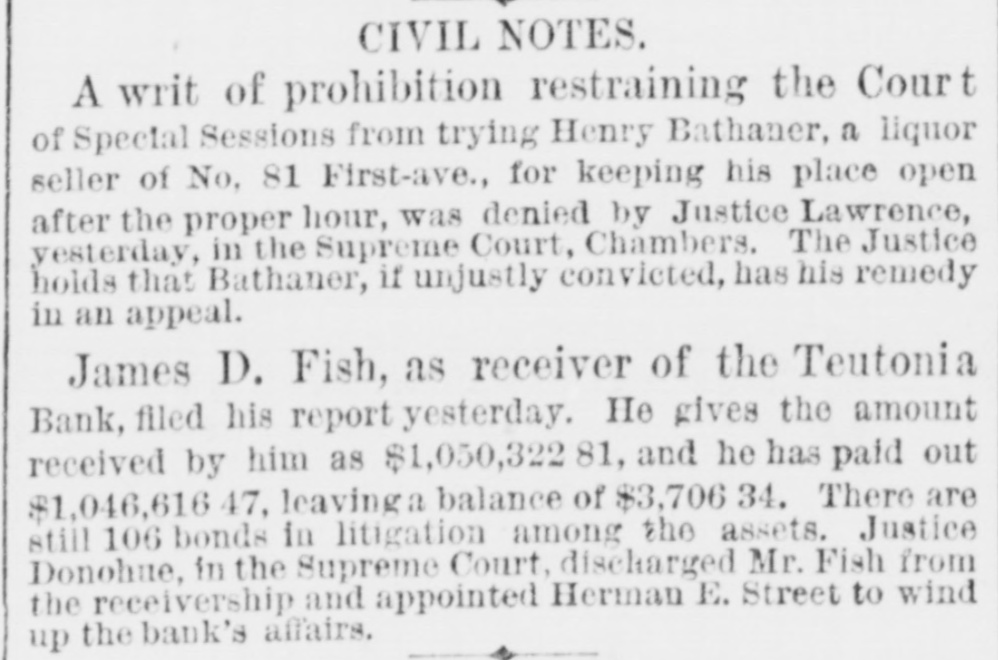 CIVIL NOTES. A writ of prohibition restraining the Court of Special Sessions from trying Henry Bathaner, a liquor seller of No. 81 First-ave., for keeping his place open after the proper hour, was denied by Justice Lawrence, yesterday, in the Supreme Court, Chambers. The Justice holds that Bathaner, if unjustly convicted, has his remedy in an appeal. James D. Fish, as receiver of the Teutonia Bank, filed his report yesterday. He gives the amount received by him as $1,050,322 81, and he has paid out $1,046,616 47, leaving a balance of $3,706 34. There are still 106 bonds in litigation among the assets. Justice Donohue, in the Supreme Court, discharged Mr. Fish from the receivership and appointed Herman E. Street to wind up the bank's affairs.
