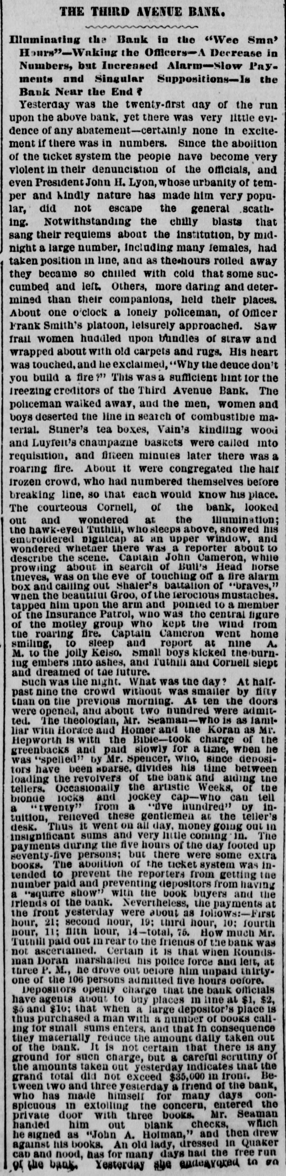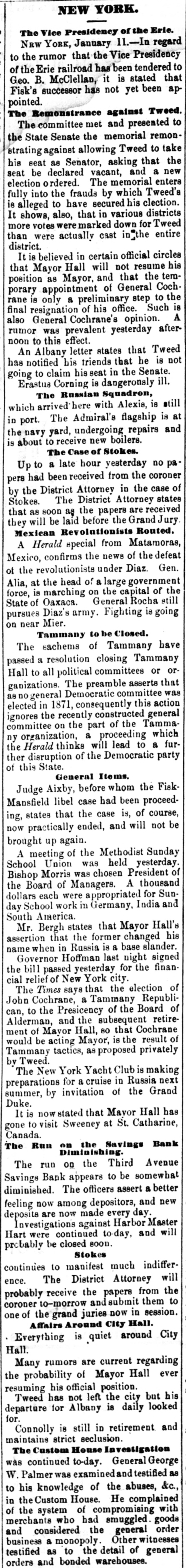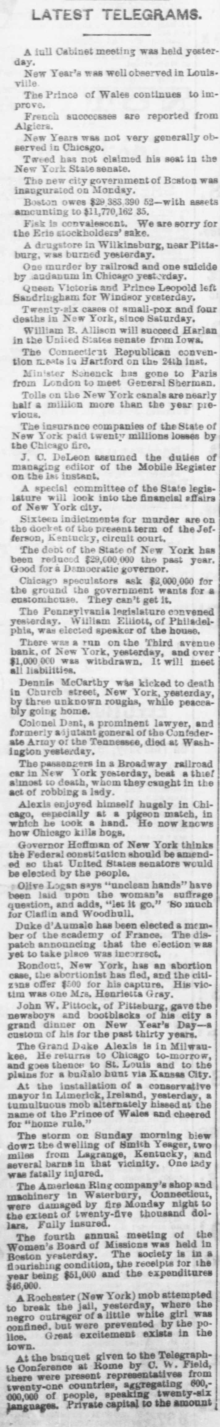 LATEST TELEGRAMS. A full Cabinet meeting was held yester day. New Year's was well observed in Louis. ville. The Prince of Wales continues to improve. French successes are reported from Algiera. New Years was not very generally observed in Chicago. Tweed has not claimed his seat in the New York State senate. The new city government of Boston was inaugurated on Monday. Boston owes $29,383,390 52-with amounting to $11,770,162 35. Fisk is convalescent. We are sorry for the Eris stockholders' sake. A drugstore in Wilkinsburg, near Pittsburg, was burned yesterday. One murder by railroad and one suicide by audanum in Chicago yesterday. Queen Victoria and Prince Leopold left Sandringham for Windsor yesterday. Twenty-six cases of small-pox and four deaths in New York, since Saturday. William B. Allison will succeed Harlan in the United States senate from Iowa. The Connecticut Republican convention meats is Hartford on the 24th inst. Minister Schenck has gone to Paris from London to meet General Sherman. Tolls on the New York canals are nearly half a million more than the year previous. The insurance companies of the State of New York paid twenty millions losses by the Chicago fire. J. C. DeLeon assumed the duties of managing editor of the Mobile Register on the las instant. A special committee of the State legislature will look into the financial affairs of New York city. Sixteen indictments for murder are on the docket of the present term of the Jefferson, Kentucky, circuit court, The debt of the State of New York has been reduced $29,000,000 the past year. Good for & Damoeratic governor. Chicago speculators ask $2,000,000 for the ground the government wants for a customhouse. They can't get it. The Penneylvania legislature convened yesterday. William Elliott, of Philadelphia, was elected speaker of the house. There was a run on the Third avenue bank, of New York, yesterday, and over $1,000,000 was withdrawn. It will meet all liabilities. Dennis McCarthy was kicked to death in Church street, New York, yesterday, by three unknown roughs, while peaceably going home. Colonel Dent, 8 prominent lawyer, and formerly adjutant goneral of the Confederate Army or the Tennessee, died at Washington yesterday. The passengers in S Broadway railroad in New York yesterday, beat a thief almost car to death, whom they caught in the act of robbing S lady. Alexis enjoyed himself hugely in Chiespecially at & pigeon match, in which cago, he LOOK a hand. He now knows how Chicago kills hogs. Governor Hoffman of New York thinks Federal constitution should be amended the so that United States senators would be elected by the people. Olive Logan says "unclean hands" have been laid upon the woman's suffrage question, and adds, "let it go." "So much for Claflin and Woodhull. Duke d'Aumale has been elected a member of the academy of France. The disannouncing that the election was to take place was patch yet incorrect. Rondout, New York, has an abortion the abortionist has fied, and the citizans case, offer $500 for his capture. His victim was one Mrs. Henrietta Gray. John W. Pittock, of Pittsburg, gave the a newsboys and bootblacks of his city grand dinner on New Year's Daycustom of his for the past thirty years. The Grand Dake Alexis is in Milwaukee, He returns to Chicago to-morrow, and goes thence to St. Louis and to the plains for a builalo hunt via Kansas City. At the installation of a conservative mayor in Limerick, Ireland, yesterday, a tumultuous mob alternately hissed at the name of the Prince of Wales and cheered for "home rule." " The storm on Sunday morning biew down the dwelling of Smith Yeager, two miles from Lagrange, Kentucky, and several barns in that vicinity. One lady was fatally injured. The American Ring company's shop and machinery in Waterbury, Connecticut, damaged by fire Monday night dolthe were extent of twenty-five thousand lars, Fully insured. fourth annual meeting of the Women's The Board of Missions was held in in Beston yesterday. condition, The the receipts society is for the a flourishing year being $51,000 and the expenditures $46,000. Rochester (New York) mob attempted the A break the jail, yesterday, where to outrager of a little white girl was negro confined. but were prevented by the the police. Great excitement exists in town. the banquet given to the TelegraphAt Conference at Rome by C. W. Field, from ie were present representatives 600,there countries, aggregating twenty-one of people, speaking twenty-siz languages. 000,000 Priyate capital to the amount