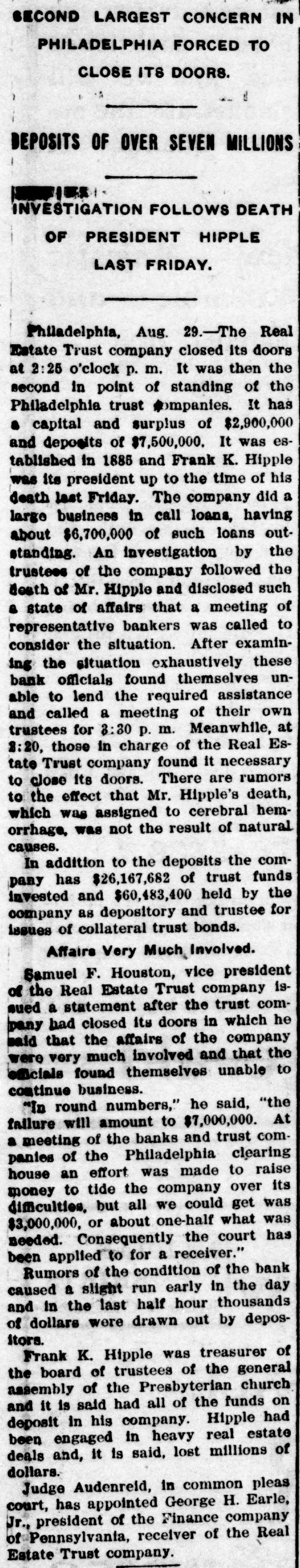 SECOND LARGEST CONCERN IN PHILADELPHIA FORCED TO CLOSE ITS DOORS. if DEPOSITS OF OVER SEVEN MILLIONS INVESTIGATION FOLLOWS DEATH OF PRESIDENT HIPPLE LAST FRIDAY. Philadelphia, Aug. 29.-The Real Estate Trust company closed its doors at 2:25 o'clock p. m. It was then the second in point of standing of the Philadelphia trust companies. It has a capital and surplus of $2,900,000 and deposits of $7,500,000. It was established in 1885 and Frank K. Hipple was its president up to the time of his death last Friday. The company did a large business in call loans, having about $6,700,000 of such loans outstanding. An investigation by the trustees of the company followed the death of Mr. Hipple and disclosed such a state of affairs that a meeting of representative bankers was called to consider the situation. After examining the situation exhaustively these bank officials found themselves unable to lend the required assistance and called a meeting of their own trustees for 8:30 p. m. Meanwhile, at 2:20, those in charge of the Real Estate Trust company found it necessary to close Its doors. There are rumors to the effect that Mr. Hipple's death, which was assigned to cerebral hemorrhage, was not the result of natural causes. In addition to the deposits the company has $26,167,682 of trust funds invested and $60,483,400 held by the company as depository and trustee for issues of collateral trust bonds. Affairs Very Much Involved. Samuel F. Houston, vice president of the Real Estate Trust company issued a statement after the trust company had closed its doors in which he haid that the affairs of the company were very much involved and that the officials found themselves unable to continue business. "In round numbers," he said, "the failure will amount to $7,000,000. At a meeting of the banks and trust companies of the Philadelphia clearing house an effort was made to raise money to tide the company over its difficulties, but all we could get was $3,000,000, or about one-half what was needed. Consequently the court has been applied to for a receiver." Rumors of the condition of the bank caused a slight run early in the day and in the last half hour thousands of dollars were drawn out by depositors. Frank K. Hipple was treasurer of the board of trustees of the general assembly of the Presbyterian church and it is said had all of the funds on deposit in his company. Hipple had been engaged in heavy real estate deals and, It is said, lost millions of dollars. Judge Audenreid, in common pleas court, has appointed George H. Earle, Jr., president of the Finance company of Pennsylvania, receiver of the Real Estate Trust company.