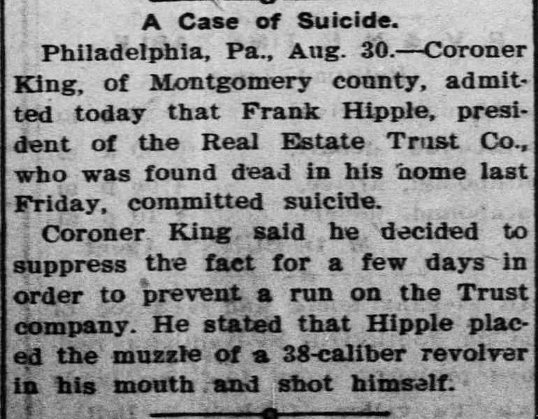 The coroner in Philadelphia now says that Frank D. Hipple, late president of the Real Estate Trust company, that failed, committed suicide by blowing out his brains. It was reported at the time that Hipple died from heart failure. The coroner says he suppressed the truth for fear of a run on the banking institutions.