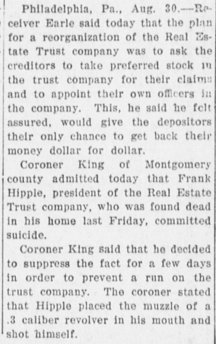 SUICIDE IS ADMITTED. The Late Bank Pres. Hipple, Philadelphia, Ended Tis Own Life. Philadelphia, Aug. 30.-The suspicion entertained that Frank K. Hipple. president of the embarassed Real Estate Trust Co., who was found dead at his home in Bryn Mawr, Pa., last Friday, committed suicide, was confirmed today by Joseph N. King. coroner of Montgomery county. When he made the announcement Dr. Albert H. Read, the coroner's physician, was standing near and he added: "You can say that Mr. Hipple blew out his brains." Since the death of Mr. Hipple, the family physician and the coroner maintained that he died of cerebral hemorrhage, while taking a bath. The coroner today said: "When I went to Bryn Mawr Fr to investigate the sudden death of Hipple and discovered that he had co.n mitted suicide,'I decided to suppress the fact for a few days in order to prevent a run on the Trust Company. I thought if there was anything wrong in Mr. Hipple's affairs, the directors would have a chance to make up whatever deficits there were." The coroner also stated that Hipple had placed the muzzle of a 38-calibre revolver in his mouth and shot himself. The ball passed upward and lodged in the brain. Mrs. Hipple was not aware that her husband had killed himself until the arrival of the family physician. Samuel F. Houston. vice president of the failed Trust Company. said today that the work on the plan to reopen the bank is being pushed. He said: "It is not necessary to have $7,000,000. but we want that sum guaranteed. If the guarantee is secured a large amount of cash would not be required as all danger of a run on the company would then be removed." Mr. Converse is authority for the statement that the failure was due entirely the loans of Segal. During the formal legal proceedings in court this afternoon to restrain the Real Estate Trust Co. from doing business and to continue the temporary receiver attorneys who claim they represent 10,000 depositors asked the court to appoint an auxiliary receiver. They suggested William A. Glasgow. The court took the matter under consideration.