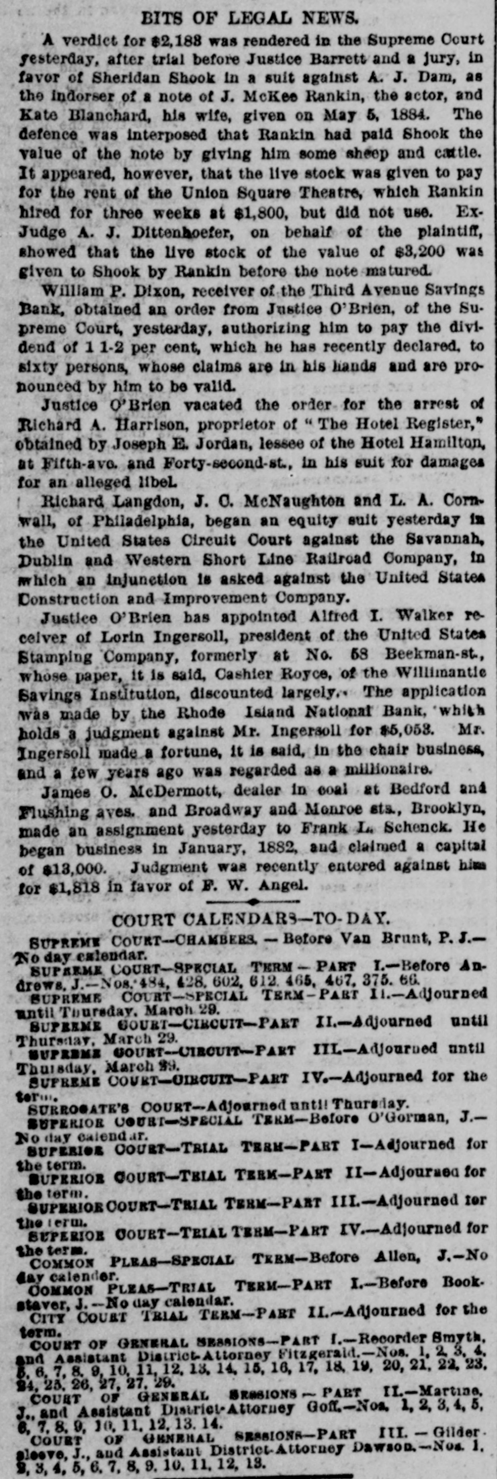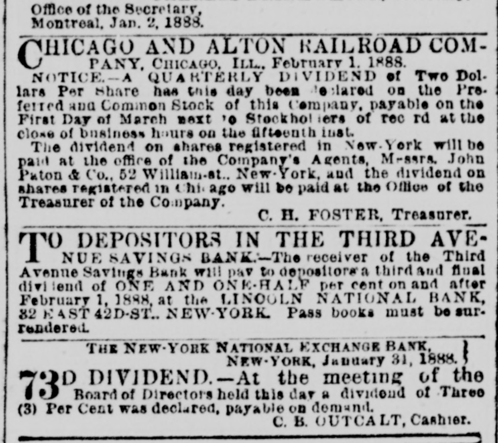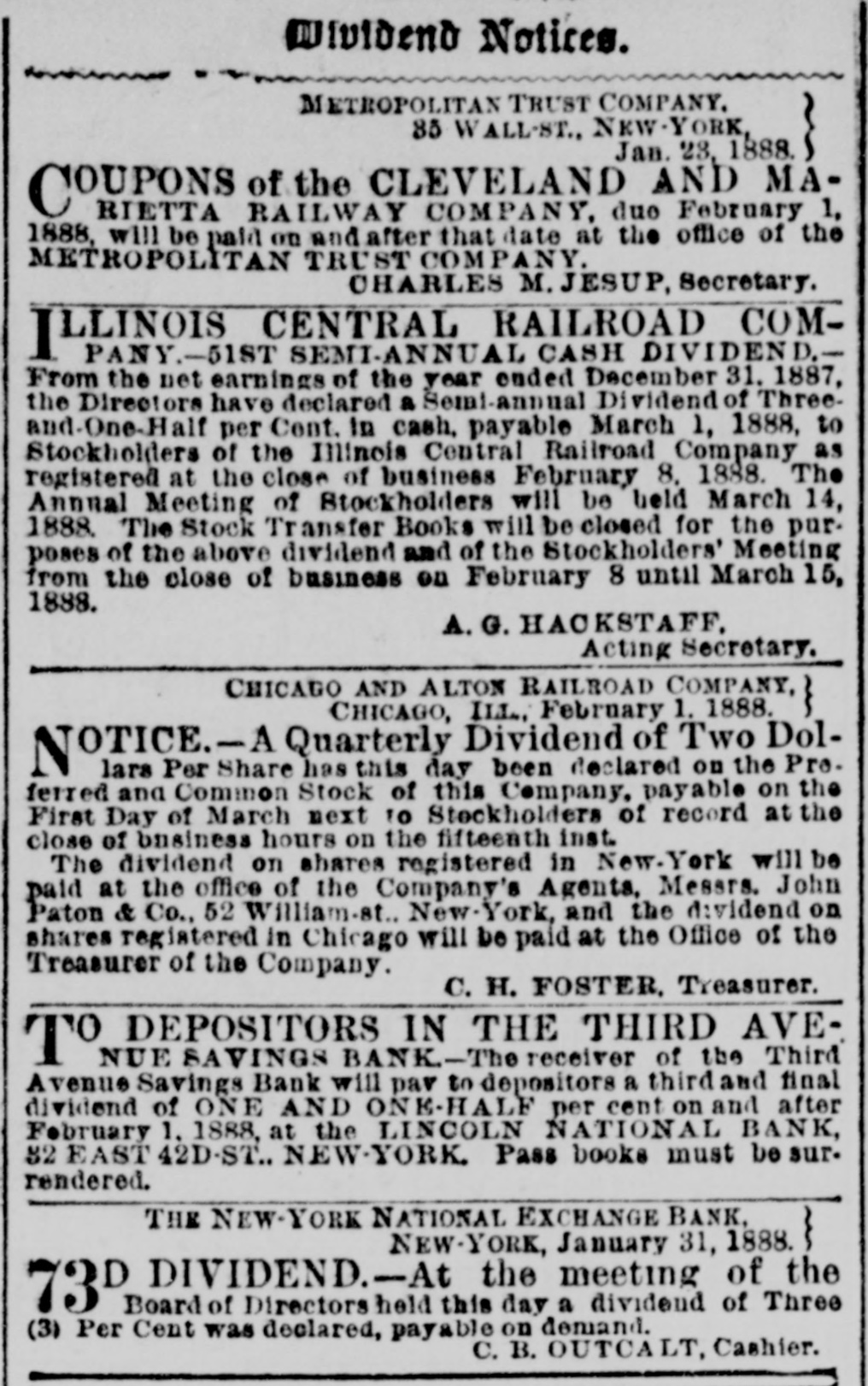 Wividend Notices. METROPOLITAN TRUST COMPANY. 85 WALL-ST., NEW-YORK, Jan. 23, 1888. OUPONS of the CLEVELAND AND MABIETTA RAILWAY COMPANY, due February 1, 1888, will be paid on and after that date at the office of the METROPOLITAN TRUST COMPANY. CHARLES M. JESUP, Secretary. LLINOIS CENTRAL RAILROAD COMPANY.-51ST SEMI-ANNUAL CASH DIVIDEND.From the net earnings of the year ended December 31. 1887, the Directors have declared a Semi-annual Dividend of Threeand-One-Half per Cent. In cash, payable March 1, 1888, to Stockholders of the Illinois Central Railroad Company as registered at the close of business February 8, 1888. The Annual Meeting of Stockholders will be held March 14, 1888. The Stock Transfer Books will be closed for the purposes of the above dividend and of the Stockholders' Meeting from the close of business on February 8 until March 15, 1888. A. G. HACKSTAFF. Acting Secretary. CHICAGO AND ALTON RAILBOAD COMPANY, } CHICAGO, ILL, February 1. 1888. OTICE.-A Quarterly Dividend of Two Dollars Per Share has this day been declared on the Preferred and Common Stock of this Company, payable on the First Day of March next 10 Stockholders of record at the close of business hours on the fifteenth inst. The dividend on shares registered in New-York will be paid at the office of the Company's Agents, Messrs. John Paton & Co., 52 William-st.. New-York, and the dividend on shares registered in Chicago will be paid at the Office of the Treasurer of the Company. C. H. FOSTER. Treasurer. T°, DEPOSITORS IN THE THIRD AVENUE SAVINGS BANK-The receiver of the Third Avenue Savings Bank will par to depositors a third and final dividend of ONE AND ONE-HALF per cent on and after February 1. 1888, at the LINCOLN NATIONAL BANK, 82 EAST 42D-ST.. NEW-YORK. Pass books must be surrendered. THE New-York NATIONAL EXCHANGE BANK, NEW-YORK, January 31, 1888. meeting of the a dividend of Three (3) Per Cent was declared, payable on demand. C. B. OUTCALT, Cashier.