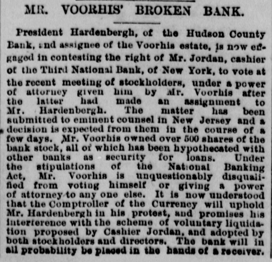 MR. VOORHIS' BROKEN BANK. President Hardenbergh, of the Hudson County Bank, and assignee of the Voorhis estate, is now erfgaged in contesting the right of Mr. Jordan, cashier of the Third National Bank, of New York, to vote at the recent meeting of stockholders, under a power of attorney given him by Mr. Voorhis after the latter had made an assignment to Mr. Hardenbergh. The matter has been submitted to eminent counsel in New Jersey and a decision is expected from them in the course of a few days. Mr. Voorhis owned over 500 shares of the bank stock, all or which has been hypothecated with other banks as security for loans. Under the stipulations of the National Banking Act, Mr. Voorhis is unquestionably disqualified from voting himself or giving a power of attorney to any one else. It is now understood that the Comptroller of the Currency will uphold Mr. Hardenbergh in his protest, and promises his interference with the scheme of voluntary liquidation proposed by Cashier Jordan, and adopted by both stockholders and directors. The bank will in all probability be placed in the hands of a receiver.
