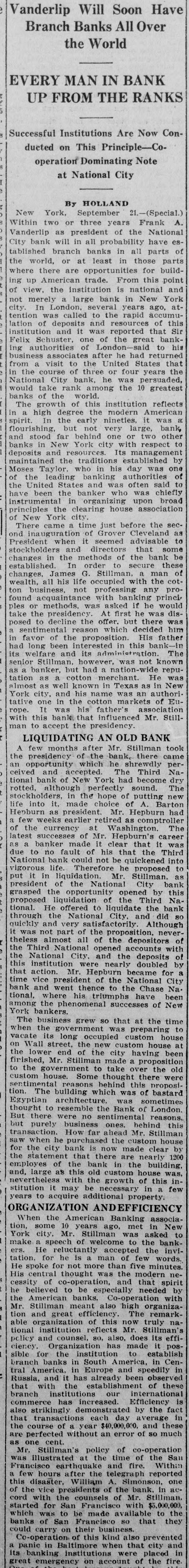 Will Soon Have Vanderlip Branch Banks All Over the World EVERY MAN IN BANK UP FROM THE RANKS This Successful Institutions Principle- Are Now Co- Conducted operation on Dominating Note at National City 21 By HOLLAND (Special.) September Frank New two York, or three years of the National Within president have es Vanderlip as will in all probability all parts of or bank banks in those parts tablished City branch at least in for buildpoint the where world, there are trade. opportunities From national this and ing up American institution is in New York at of view merely the large bank veral years accumu ago, not London, to the rapid of this tention city In was deposits called and reported resources that bank- Sir ing lation institution of and it one was of the great said to his associates United Felix uthorities Schuster of after London he had States returned that the years from business visit to of three the or was four persuaded, take rank world. in National the course City bank among he the 10 greatest reflects would banks of the of this institution modern American a flourishing The high growth degree early the nineties. large, it was bank behind with spirit in a In the but not very one or two respect other to esta maintained and stood in New far York city Its stablished manageme by who banks deposits and the traditions in his day authorities was one of Moses Taylor, leading banking and was often said chiefly of the United States banker who was upon broad the been the organizing association instrumental have the in clearing house the secprinciples York city just before as of New came time Grover Cleveland advisable to There uguration of seemed that some ond ina when directors the bank be President stockholder in the and order ethods to of secure man these of changes established James In G occupied Stillma with any the pro cot with changes wealth, all his not life professing bank ng princi would ton business. asked if he dis found methods. was At first he there was was take ples the decline presidence the offer. which but decided father him posed to imental reason His of the proposition propost in this bank- The favor been inter terested known banker, had long welfare and its wever was not wide repuas senior its Stillman but how had merchant nation He in New was tation as as cotton known in Texas was an authori Europe almost well and his cotton name ma rkets of tion that this bank tative York city, one was in the his father's influenced Mr Stillresidency. with man LIQUIDATING to accept the AN OLD Stillman BANK took Mr there came few months of the bank, shrewdly per bank the opportunity presidency which he The Third Na dry accept cepted had become perfectly ceived an and of New York sound. The new putting tional rotted although the hope of of Barton stockholders it. made in choice Mr epburn had life into president retired as comptroller The Henburn a as earlier Washington few weeks currency at Hepburn's career was of of the successes of Mr. it clear that it Third latest banker made his that the into quickened due to no fault could not be he proposed to vigorous liquida City National bank life Therefore Mr Stillman bank put in the National opened by this Na president of opportu unity the Third bank grasped the liquidation of liquidate the proposed offered to City and did so it was tional He National ctorily Although all through the very sa proposition. never- of almost opened accounts quickly not and part of the of the depositor with of National for the theless Third National City and nearly the deposits doubled by a this the institution Mr were Hep! became National City that action president of the the Chase Na tional. the time vice went thence to have been among phenomenal bank and where his triumphs successes of New at the time York bankers. grew so that preparing to long when The business the government occupie was custom custom house house at vacate Wall its street, of the the new city having proposit been on the lower Mr end Stillman made take over the were old firished, the government Some to thought this there proposicustom to house. reasons behind of hastard sentimenta The tal building which was was sometimes London tion Egyptian architecture resemble the Bank of reasons thought to no sentime imental behind this there were ones. Stillman the but But purely business HOW far ahead custom Mr. house transaction when he purchased is now made nearly clear 1200 bank saw for statement the city bank that there in are the building was employes the of the this old custom house of this inand, large as with the necessar growth in few nevertheless may be additional property years stitution to acquire NDEFFICIENCY associa ORGANIZATION Banking in New When the America years ago, met asked to some 10 Stillman was bankers. York tion, city, Mr of welcome accepted to the the invifive He spoke make He speech reluctantly man of few minutes words, was thought and tion, that tation for for he not more than the modern nespirit by His cessity central of co-opera to be espe Co-operation ially needed with organizahe believed American meant banks also high The remark the Stillman efficiency truly national so, tion Mr and nization great of this now Mr. Stillman's counsel has made able organization institution flects also, does its it effi- posestablish policy and organization institution merica, to in Censible ciency for the in South and speedity in branch banks in Europe already been observ these tral Russia. America and it has establishment Internation of tional that with institutions the our Efficiency the fact is branch has demonstrated increased by average in the course commerce strikingly each day and these are an without perfected as that also transaction of year $40,000,000 error of so much one cent of policy co-operation of time the Sal was Mr illustrated Stillman at the and fire. reported With Francisco earthquake after the telegraph Simonson. one acfew hours William A. bank in a disaster, esidents of th