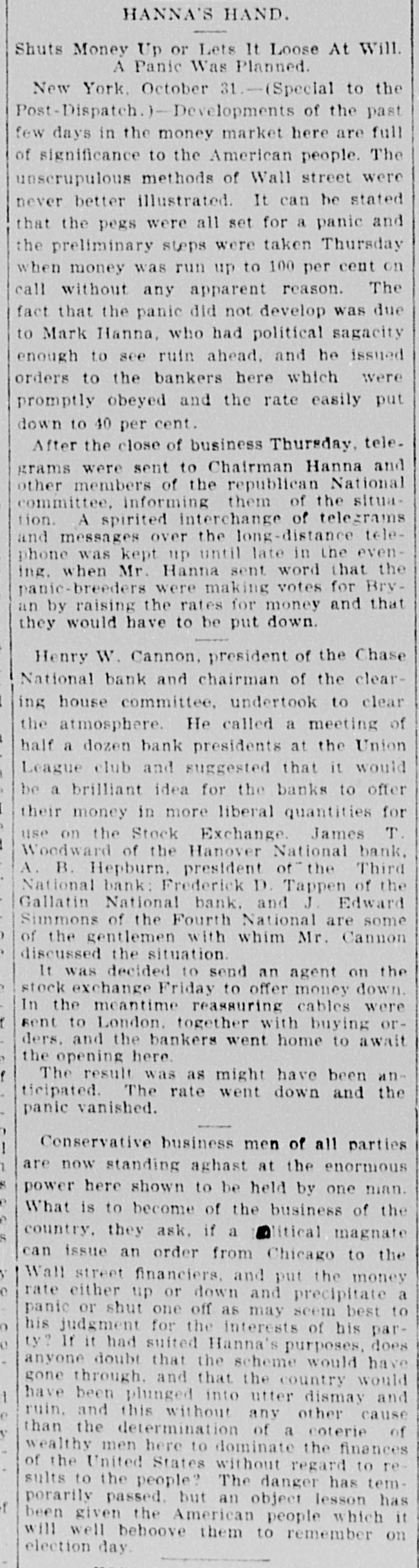 HANNA'S HAND. Shuts Money Up or Lets It Loose At Will. A Panic Was Planned. New York, October -(Special to the Post-Dispatch.)-Developments of the past few days in the money market here are full of significance to the American people. The unscrupulous methods of Wall street were never better illustrated. It can be stated that the pegs were all set for a panic and the preliminary steps were taken Thursday when money was run up to 100 per cent on call without any apparent reason. The fact that the panic did not develop was due to Mark Hanna, who had political sagacity enough to see ruin ahead, and he issued orders to the bankers here which were promptly obeyed and the rate easily put down to 40 per cent. After the close of business Thursday, telegrams were sent to Chairman Hanna and other members of the republican National committee, informing them of the situation. A spirited interchange of telegrams and messages over the long-distance telephone was kept up until late in the evening. when Mr. Hanna sent word that the panic-breeders were making votes for Bryan by raising the rates for money and that they would have to be put down. Henry W. Cannon, president of the Chase National bank and chairman of the clearing house committee, undertook to clear the atmosphere. He called a meeting of half a dozen bank presidents at the Union League club and suggested that it would be a brilliant idea for the banks to offer their money in more liberal quantities for use on the Stock Exchange. James T. Woodward of the Hanover National bank, A. B. Hepburn, president of the Third National bank: Frederick D. Tappen of the Gallatin National bank. and J. Edward Simmons of the Fourth National are some of the gentlemen with whim Mr. Cannon discussed the situation. It was decided to send an agent on the stock exchange Friday to offer money down. In the meantime reassuring cables were sent to London. together with buying orders. and the bankers went home to await the opening here. The result was as might have been anticipated. The rate went down and the panic vanished. Conservative business men of all parties are now standing aghast at the enormous power here shown to be held by one man. What is to become of the business of the country. they ask, if a itical magnate can issue an order from Chicago to the Wall street financiers, and put the money rate either up or down and precipitate a panic or shut one off as may seem best to his judgment for the interests of his party? If it had suited Hanna's purposes, does anyone doubt that the scheme would have gone through. and that the country would have been plunged into utter dismay and ruin. and this without any other cause than the determination of a coterie of wealthy men here to dominate the finances of the United States without regard to results to the people? The danger has temporarily passed. but an object lesson has been given the American people which it will well behoove them to remember on election day.