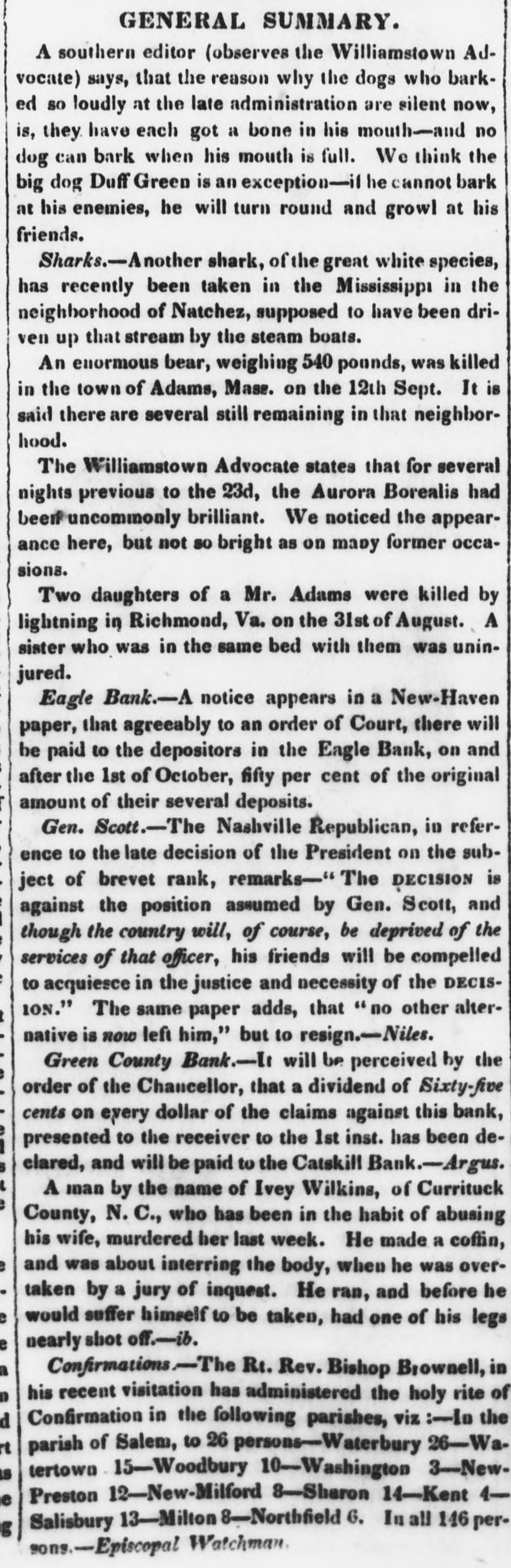 GENERAL SUMMARY. A southern editor (observes the Williamstown Advocate) says, that the reason why the dogs who barked so loudly at the late administration are silent now, is, they have each got a bone in his mouth-and no dog can bark when his mouth is full. We think the big dog Duff Green is an exception-il he cannot bark at his enemies, he will turn round and growl at his friends. Sharks.-Another shark, of the great white species, has recently been taken in the Mississippi in the neighborhood of Natchez, supposed to have been driven up that stream by the steam boats. An enormous bear, weighing 540 pounds, was killed in the town of Adams, Mase. on the 12th Sept. It is said there are several still remaining in that neighborhood. The Williamstown Advocate states that for several nights previous to the 23d, the Aurora Borealis had been/uncommonly brilliant. We noticed the appearance here, but not so bright as on many former occasions. Two daughters of a Mr. Adams were killed by lightning in Richmond, Va. on the 31st of August. A sister who was in the same bed with them was uninjured. Eagle Bank.-A notice appears in a New-Haven paper, that agreeably to an order of Court, there will be paid to the depositors in the Eagle Bank, on and after the 1st of October, fifty per cent of the original amount of their several deposits. Gen. Scott.-The Nashville Republican, in reference to the late decision of the President on the subject of brevet rank, remarks-" The DECISION is against the position assumed by Gen. Scott, and though the country will, of course, be deprived of the services of that officer, his friends will be compelled to acquiesce in the justice and necessity of the DECISION." The same paper adds, that "no other alternative is now left him," but to resign.-Niles. Green County Bank.-I will be perceived by the order of the Chancellor, that a dividend of Sixty-five cents on every dollar of the claims against this bank, presented to the receiver to the 1st inst. has been declared, and will be paid to the Catskill Bank.-Argus. A man by the name of Ivey Wilkins, of Currituck County, N.C., who has been in the habit of abusing his wife, murdered her last week. He made a coffin, and was about interring the body, when he was overtaken by a jury of inquest. He ran, and before he e would suffer himself to be taken, had one of his legs e nearly shot off.-ib. a Confirmations.-The Rt. Rev. Bishop Brownell, in n his recent visitation has administered the holy rite of d Confirmation in the following parishes, viz :-In the t parish of Salem, to 26 persons-Waterbury 26-Watertown 15-Woodbury 10-Washington 3-Newis Preston 12-New-Milford 8-Sharon 14-Kent 4e Salisbury 13-Milton 8-Northfield 6. In all 146 perg sons.-Episcopal Watchman.