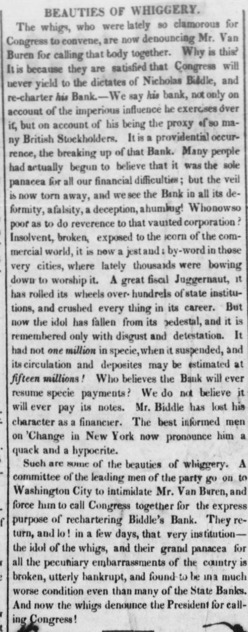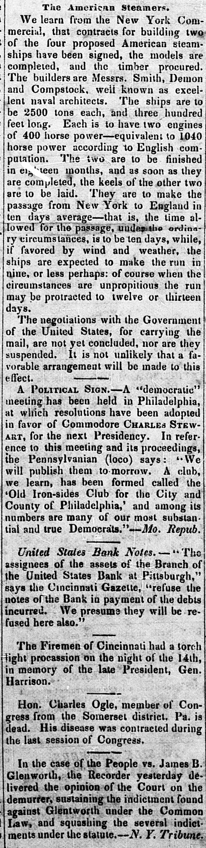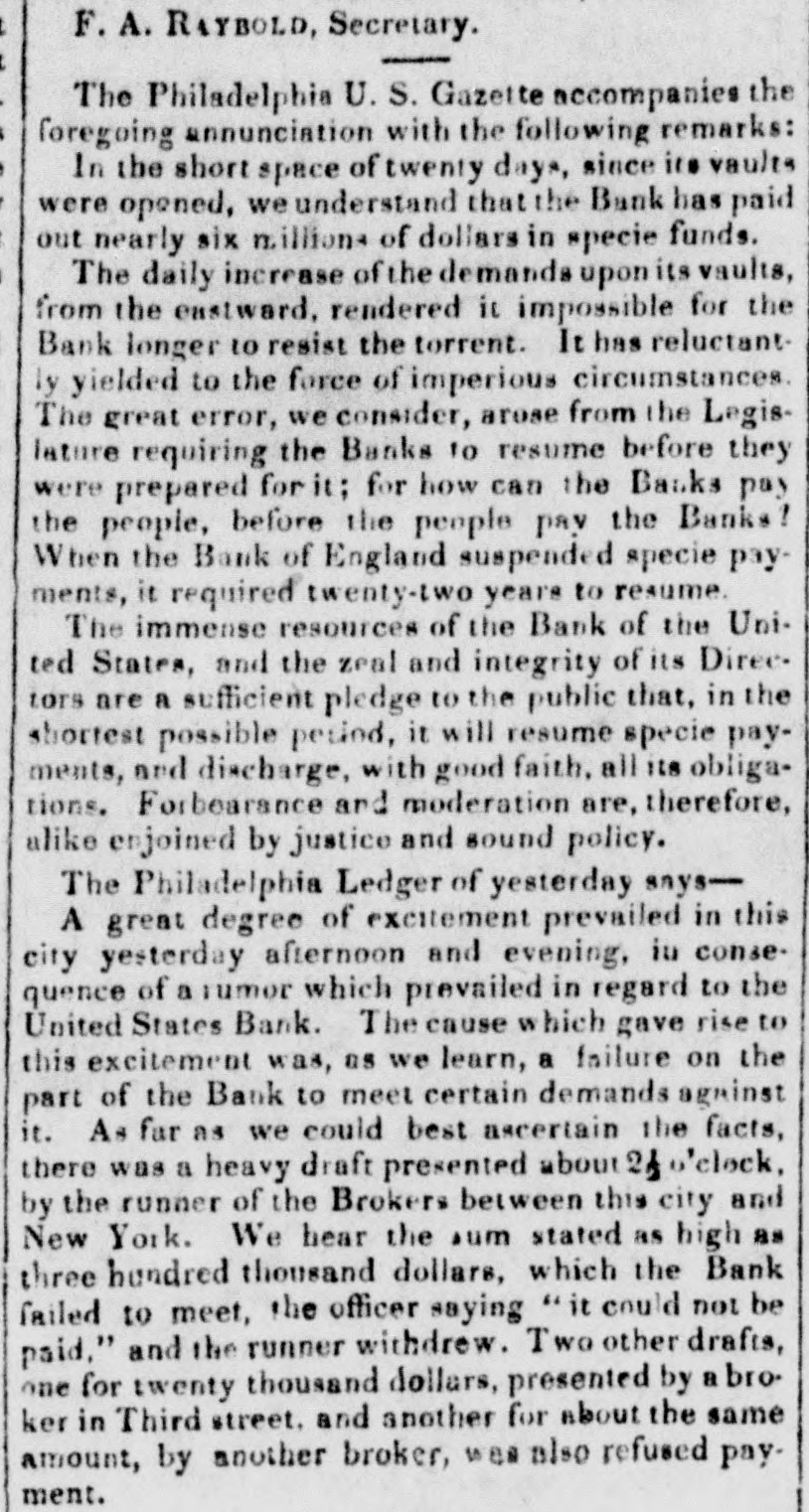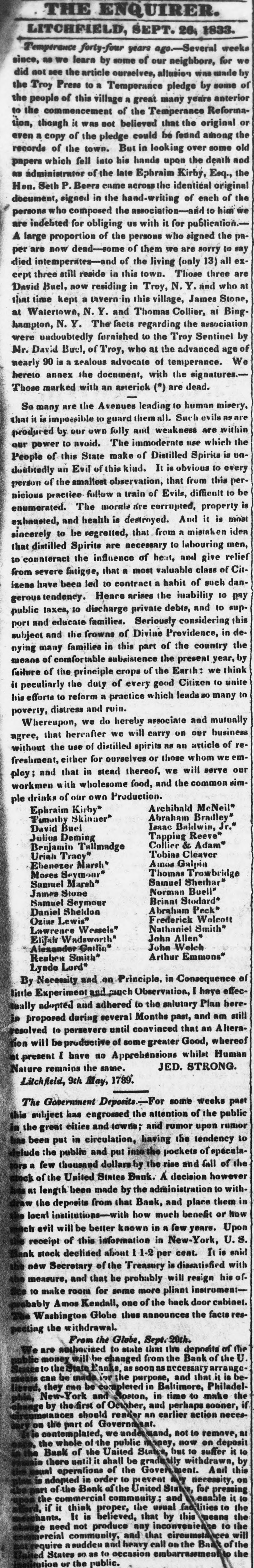 26, 1833. SEPT. years Several Temperance forty-four as of we our learn by for some since, neighborr, did not the see by article allusion ourselves, the of to a Press by Troy some pledge Temperance the of a this many anterior years great village people the of ReformaTemperance or the original of the tion, to the though commencement it was not believed could he that found among old the records hands upon even a copy of the town. pledge But in looking over the deail some and as administrator the came across Seth identical Beera Hon. papers which fell of into the late his Ephraim Kirby, Esq., original the of in of the each the signed hand-writing document, 10 the who him persons associationcomposed it us for for with obliging publication. the paA are large indehted proportion of the of persons them we who are signed sorry to say are per'are intemperates now dead-some of the living (only 13) three all exdied still reside in this town. Those and who at cept three Buel, now residing in Troy, N. Y. James Stone, David kept a tavern in this village, at Bing that Watertown, time N.Y. and Thomas Collier, association at N. Y. The facts regarding the Sentinel hampton, undoubtedly furnished to the Troy age by of were David Buel, of Troy, who at the advanced We Mr. 90 is zealous advocate of temperance. nearly hereio annex the document, with the signatures.Those marked with an aeterick (*) are dead. So many are the Avenues leading to human ils misery, are it is impossible to guard them all. Such ev within as that produced by our own fully and weakness are to avoid. The immoderate use which un- the of this State make of Distilled an Evil of this kind. It is every duubledly our People power obvious from Spirits this to is of the smallest observation, that per- be follow a train of Evils, The morale are property is enumerated. picious person practice corrupted, difficult to and health is destroyed. And it is most to be regretted, that from a idea sincerely exhausted, labouring mistaken Spirits are necessary to men, the influence of heart, that a most Citfrom to counteract that distilled severe fatigue, valuable and class give of relief izens have been led to contract a habit of such dangeroustendency. Hence arises the inability to pay public taxes, to discharge private debts, and to support and educate families. Seriously considering this subject and the frowns of Divine Providence, in denying many families in this part of the country the means of comfortable subsistence the present year, by failure of the principle crops of the Earth: we think it peculiarly the duty of every good Citizen to unite is efforts to reform a practice which leads so many to poverty, distress and ruin. Whereupon, we do hereby associate and mutually agree, that hereafier we will carry on our business without the use of distilled spirits as an article of refreshment, either for ourselves or those whom we emplay; and that in stead thereof, we will serve our workmen with wholesome food, and the common simple drinks of our own Production. Archibald McNeil* Ephraim Kirby* Abraham Bradley" Timethy Skinner' Isnac Baldwin, David Buel Tapping Reeve* Julius Deming Collier & Adam" Benjamin Tallmadge Tobias Cleaver Uriah Tracy" Ebenezer Marsh Moses Seymour Thomas Trowbridge Samuel Sheihar' Samuel Marsh" Norman Buell" James Stone Briant Stodard* Samuel Seymour Abraham Peck" Daniel Shekdon Ozias Lewis" Frederick Wolcott Nathaniel Smith* Lawrence Wessels' John Allen Elijah Wadsworth* John Welch Alexander Gailin Arthur Emmons" Reuben Smith* Lynde Lord* By Necessity and on Principle. in Consequence little Experiment and puch Observation, I haye effec- of inally adopted and adhered to the salutary Plan resolved proposed to during several Months past, and here. lion will be persevere until convinced that an am still Human whilet at present I productive have no Apprehensions of some greater Good, whereof Altera. JED. STRONG. Nature remains the same. Litchfield, 9th May, 1789. some past weeks The Government Deposits.__For of the the has public this attention subject engrossed and and rumor the rumor upon cities in great to the in been put having tendency circulation. of and the put pockets spéculapublic delude of the and fall few thousand the of Bank. States United however decision to the with. by made length'h administration in and that the from them Bank, place deposits or How much local benefit institutionsin be evil will better Upon in of this U.S. receipt information New-York, cent. 1-1-2 stock about per declined is of the with new Treasury diseatisfied Secretary of. his he will and that resign measure, probably for to pliant make some room instrument the Amos Kendall, probably Globe The Washington the peeting withdrawal. the From Globe, the of deposits they Philadelthe of by the first should of part the of United Bank shall if proper, hants. mercial quire States community, the public to and heavy and any that call the the