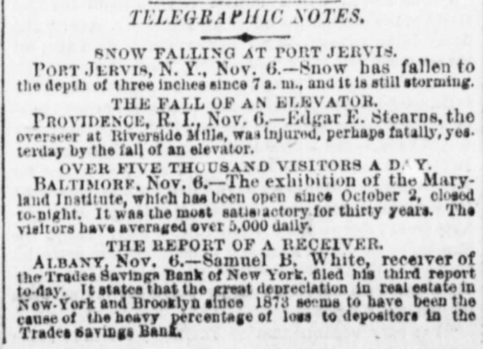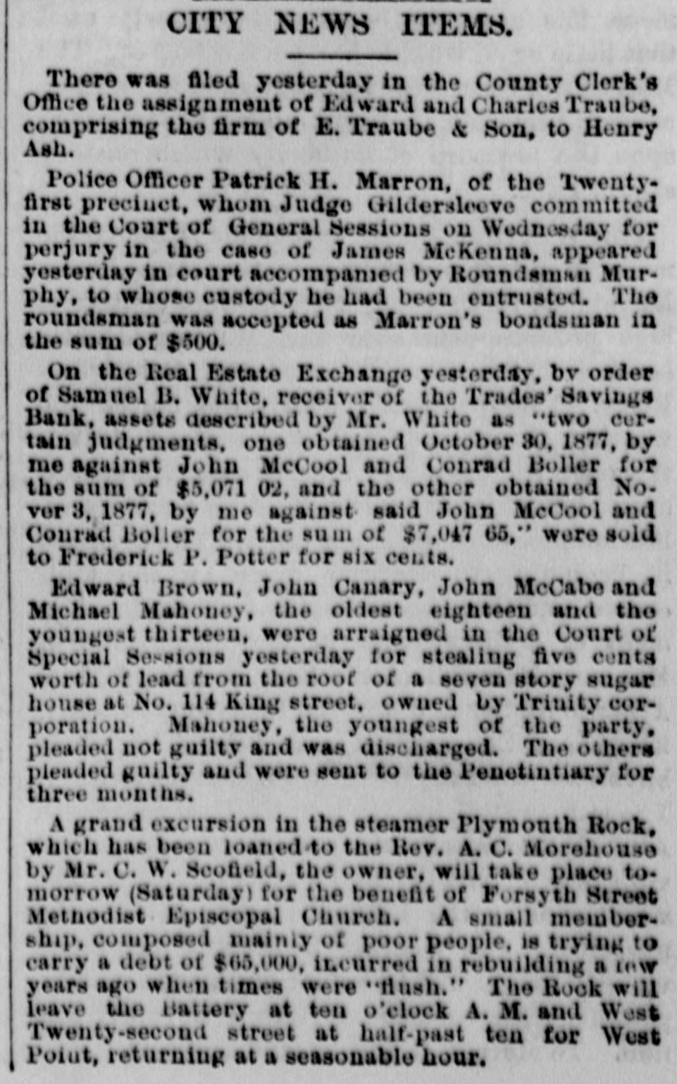 CITY NEWS ITEMS. There was filed yesterday in the County Clerk's Office the assignment of Edward and Charles Traube, comprising the firm of E. Traube & Son, to Henry Ash. Police Officer Patrick H. Marron, of the Twentyfirst preciuct, whom Judge Gildersleeve committed in the Court of General Sessions on Wednesday for perjury in the case of James McKenna, appeared yesterday in court accompanied by Roundsman Murphy, to whose custody he had been entrusted. The roundsman was accepted as Marron's bondsman in the sum of $500. On the Real Estate Exchange yesterday, by order of Samuel B. White, receiver of the Trades' Savings Bank, assets described by Mr. White as "two certain judgments, one obtained October 30, 1877, by me against John McCool and Conrad Boller for the sum of $5,071 02, and the other obtained No. ver 3, 1877, by me against said John McCool and Courad Boller for the sum of $7,047 65,* were sold to Frederick P. Potter for six cents. Edward Brown, John Canary, John McCabe and Michael Mahoney, the oldest eighteen and the youngest thirteen, were arraigned in the Court of Special Sessions yesterday for stealing five cents worth of lead from the roof of a seven story sugar house at No. 114 King street, owned by Trinity corporation. Mahoney, the youngest of the party. pleaded not guilty and was discharged. The others pleaded guilty and were sent to the Penetintiary for three months. A grand excursion in the steamer Plymouth Rock, which has been loaned to the Rev. A. C. Morehouse by Mr. C. W. Scofield, the owner, will take place to. morrow (Saturday) for the benefit of Forsyth Street Methodist Episcopal Church. A small membership, composed mainly of poor people, is trying to carry a debt of $65,000, incurred in rebuilding a lew years ago when times were "Hush." The Rock will leave the Battery at ten o'clock A. M. and West Twenty-second street at half-past ten for West Point, returning at a seasonable hour.