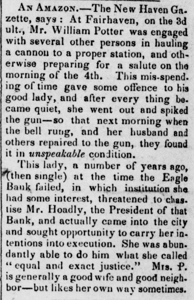 # AN AMAZON. The New Haven Gazette, says: At Fairhaven, on the 3d ult., Mr. William Potter was engaged with several other persons in hauling a cannon to a proper station, and otherwise preparing for a salute on the morning of the 4th. This mis-spending of time gave some offence to his good lady, and after every thing became quiet, she went out and spiked the gun-so that next morning when the bell rung, and her husband and others repaired to the gun, they found it in unspeakable condition. This lady, a number of years ago, (then single) at the time the Eagle Bank failed, in which institution she had some interest, threatened to chastise Mr. Hoadly, the President of that Bank, and actually came into the city and sought opportunity to carry her intentions into execution. She was abundantly able to do him what she called "equal and exact justice." Mrs. P. is generally a good wife and good neighbor-but likes her own way sometimes.