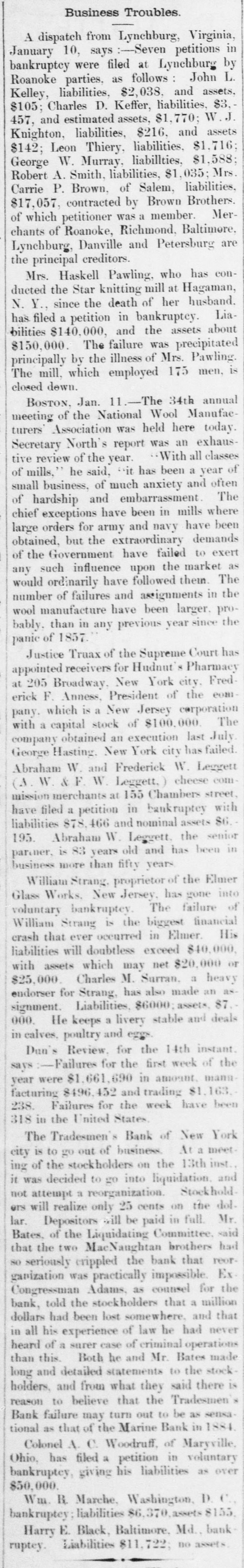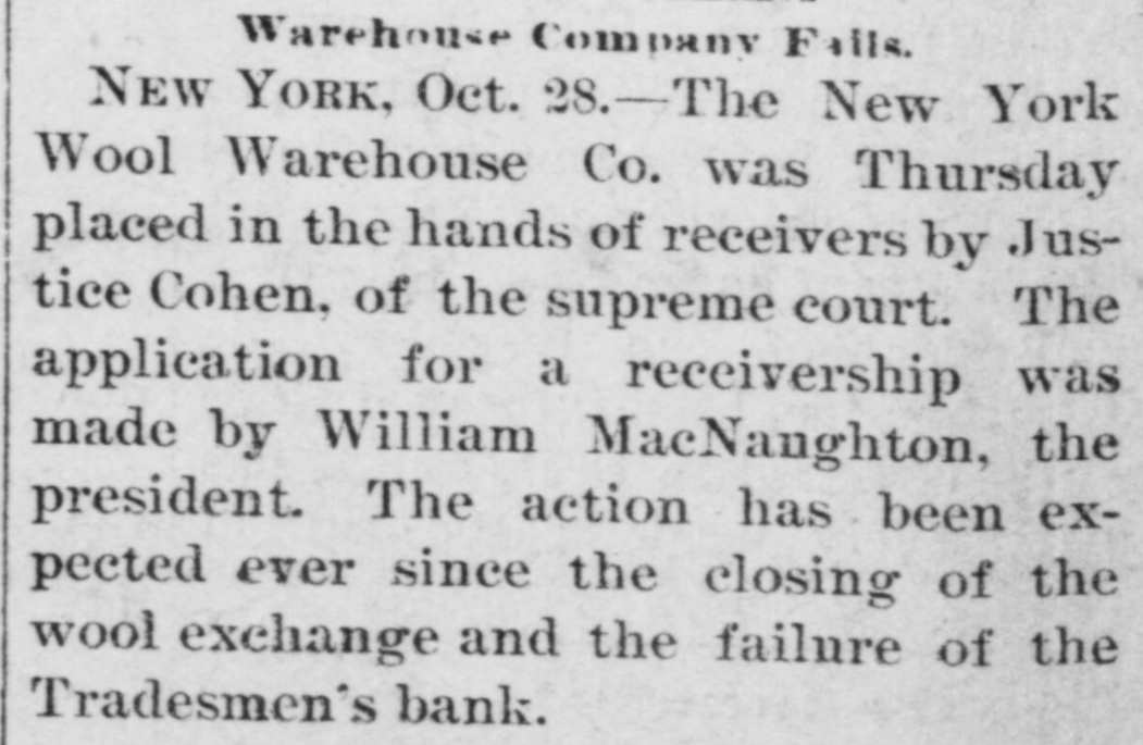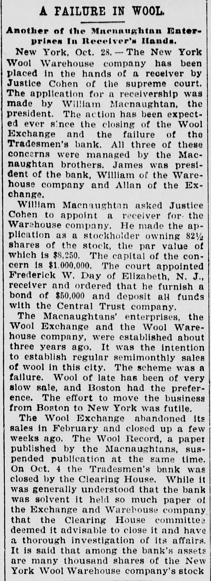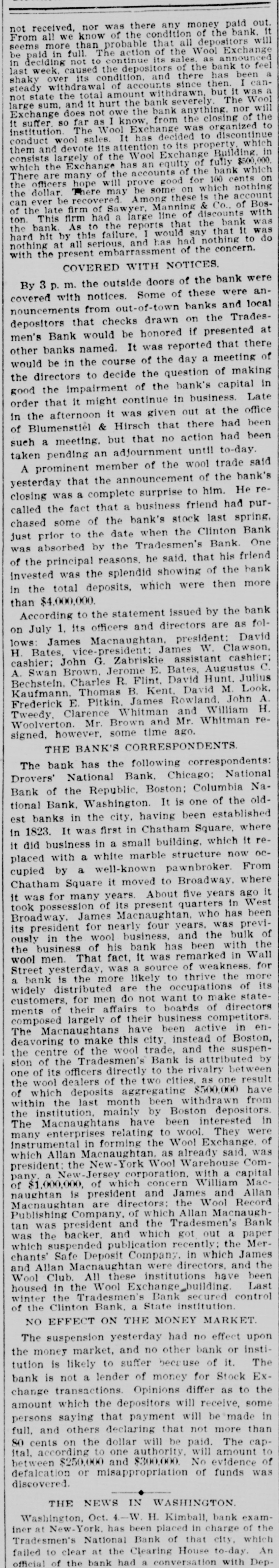 out. not received, we know nor was of the there condition any money of depositors the paid bank. will it seems From paid all more in full. than The probable action that its of the sales. all Wool as announced Exchange feel be in deciding week. caused not to the continue depositors and of there the has bank been to a last shaky over withdrawal its condition. of accounts since then. but it was a cansteady not state the total hurt amount the withdrawn ank severely. The nor Wool will large Exchange sum. does and it not as owe know, the bank from anything. the closing organized of the it institution. suffer. so The far Wool Exchange decided was to discontinue to them conduct wool devote sales. its attention It has to its property, Building. which in consists and the largely Exchange of the has Wool an equity Exchange of the of fully bank $500,000. which which There are many of the accounts good for 100 cents nothing on the the dollar. officers hope recovered. There will may prove Among be some these on which is Co., the account of Boscan the ever late be firm of Sawyer, Manning line of discounts & with of the ton. bank. This firm As this to had failure. the a large reports I would that say the nothing that bank it to was was do with hard nothing the hit at present by all serious. embarrassment and has had of the concern. COVERED WITH NOTICES. 3 m. the outside doors of these the bank were were anBy p. with notices. Some of and local covered nouncements from out-of-town banks Tradesthat checks drawn on presented the at depositors Bank would be honored if that there men's banks named. It was reported meeting of other be in the course of the day a making would directors to decide the question of in the the impairment of the bank's capital Late good that it might continue in business. office order afternoon it was given out at had the been in the & Hirsch that there been of but that no such taken an adjournment Blumenstiel a pending meeting. action until trade to-day. had said prominent member of the wool bank's A that the announcement of the He reyesterday was a complete surprise to him. had purclosing the fact that a business friend called some of the bank's stock last spring. Bank chased to the date when the Clinton One just absorbed prior by the Tradesmen's Bank. friend was the principal reasons. he said. that his the rank of was the splendid showing of invested in the total deposits. which were then more than $4,000,000. According to the statement issued by the bank folJuly 1. its officers and directors are as David on James Macnaughtan. president: W. Clawson, lows: vice-president: James cashier: H. cashier: Bates, John G. Zabriskie assistant Augustus C. A. Brown. Jerome E. Bates, Julius Bechstein. Charles R. Kent. David M. Look. Kaufmann, E. Pitkin. James H. Swan Thomas B. Flint. David Rowland, Hunt. William John A. Frederick Clarence Whitman and reTweedy, Woolverton. Mr. Brown and Mr. Whitman signed. however, some time ago. THE BANK'S CORRESPONDENTS bank has the following correspondents: The National Bank, Chicago: National NaBank Drovers' of the Republic, Boston: Columbia oldtional Bank, Washington. It is one of the banks in the city, having been established where est 1823. It was first in Chatham Square, in did business in a small building. which it oc- reit with a white marble structure now From placed a well-known Square it moved to it Chatham cupied by pawnbroker. Broadway, ago where for many years. About five years West it was possession of its present quarters has in been took James Macnaughtan, who for nearly four years. its the wool business. and the of his bank has Wall ously Broadway. president business in remarked been the was with bulk in previ- of the That fact, it was wool was a source of more likely to Street bank men. yesterday, is the occupations thrive weakness. the of more for its widely a distributed are the make statefor men do not want to directors customers, of their affairs to boards of composed ments largely of their business competitors. in enMacnaughtans have been active Boston, deavoring The to make this city, instead of of the wool trade, and the suspenthe centre of the Tradesmen's Bank is attributed between by sion of its officers directly to the rivalry result one dealers of the two cities, as one the aggregating from of month been within which wool the deposits last withdrawn $500,000 depositors. have the institution. mainly by Boston in Macnaughtans have been interested were The enterprises relating to wool. They of many in forming the Wool Exchange Allan Macnaughtan, as already the New-York Wool president: instrumental which Warehouse said. capital Com- was a wwJJersey corporation. with a of which concern of is president and James pany. naughtan $1,000,000. William Wool and Record Allan Macare directors: the of which Allan and the Publishing tan Macnaughtan was president Company. Tradesmen's Macnaugh- paper Bank backer. and which got out a publication Safe Deposit Company, in Macnaughtan were and chants' which was Allan the suspended recently: directors, which have the and James Mer- been the Wool Club. All these institutions housed in the Wool Exchange _building Last winter the Tradesmen's Bank secured control of the Clinton Bank, a State institution. NO EFFECT ON THE MONEY MARKET The suspension yesterday had no effect upon the money market, and no other bank or instiis likely to suffer because of it. The not a lender of money for bank tution is differ Stock Extransactions. Opinions as to the which the depositors will some that payment will in change persons amount saying receive, be made full, and others declaring that not more than 80 cents on the dollar will be paid. The capital. according to one authority, will amount to between $250,000 and $300,000. No evidence of defalcation or misappropriation of funds was discovered. . THE NEWS IN WASHINGTON Washington, Oct. 4 -W. H. Kimball, bank examhas been placed in the National Bank of that which iner Trades