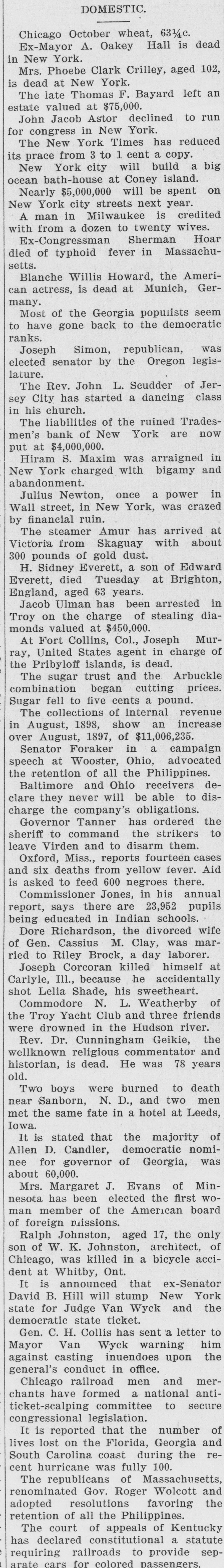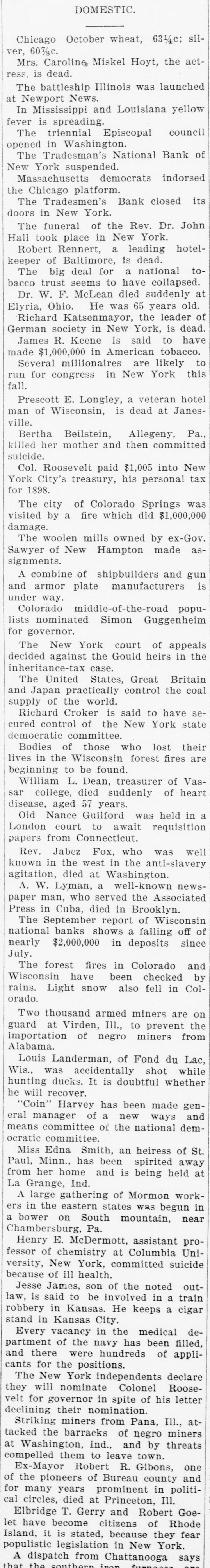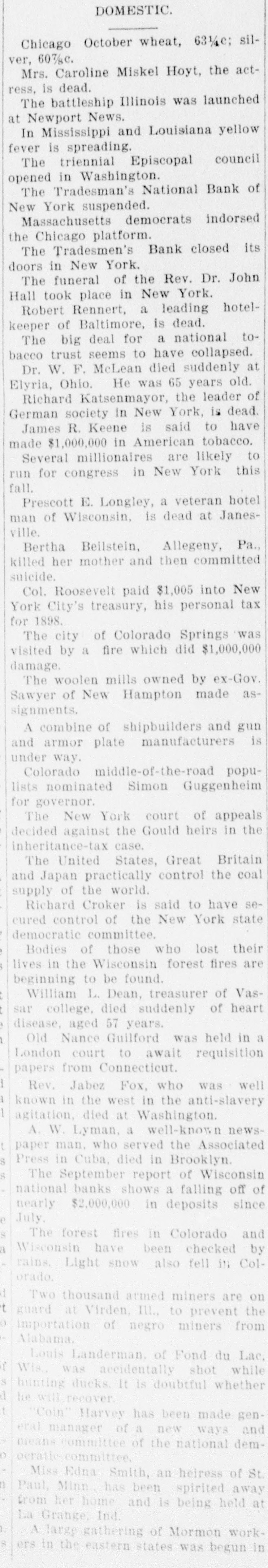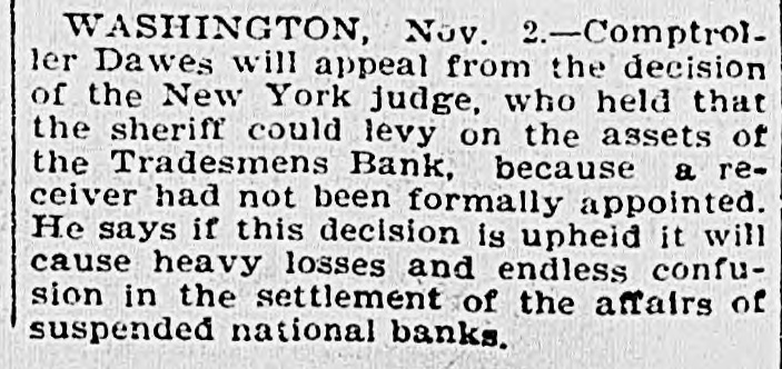out. not received, we know nor was of the there condition any money of depositors the paid bank. will it seems From paid all more in full. than The probable action that its of the sales. all Wool as announced Exchange feel be in deciding week. caused not to the continue depositors and of there the has bank been to a last shaky over withdrawal its condition. of accounts since then. but it was a cansteady not state the total hurt amount the withdrawn ank severely. The nor Wool will large Exchange sum. does and it not as owe know, the bank from anything. the closing organized of the it institution. suffer. so The far Wool Exchange decided was to discontinue to them conduct wool devote sales. its attention It has to its property, Building. which in consists and the largely Exchange of the has Wool an equity Exchange of the of fully bank $500,000. which which There are many of the accounts good for 100 cents nothing on the the dollar. officers hope recovered. There will may prove Among be some these on which is Co., the account of Boscan the ever late be firm of Sawyer, Manning line of discounts & with of the ton. bank. This firm As this to had failure. the a large reports I would that say the nothing that bank it to was was do with hard nothing the hit at present by all serious. embarrassment and has had of the concern. COVERED WITH NOTICES. 3 m. the outside doors of these the bank were were anBy p. with notices. Some of and local covered nouncements from out-of-town banks Tradesthat checks drawn on presented the at depositors Bank would be honored if that there men's banks named. It was reported meeting of other be in the course of the day a making would directors to decide the question of in the the impairment of the bank's capital Late good that it might continue in business. office order afternoon it was given out at had the been in the & Hirsch that there been of but that no such taken an adjournment Blumenstiel a pending meeting. action until trade to-day. had said prominent member of the wool bank's A that the announcement of the He reyesterday was a complete surprise to him. had purclosing the fact that a business friend called some of the bank's stock last spring. Bank chased to the date when the Clinton One just absorbed prior by the Tradesmen's Bank. friend was the principal reasons. he said. that his the rank of was the splendid showing of invested in the total deposits. which were then more than $4,000,000. According to the statement issued by the bank folJuly 1. its officers and directors are as David on James Macnaughtan. president: W. Clawson, lows: vice-president: James cashier: H. cashier: Bates, John G. Zabriskie assistant Augustus C. A. Brown. Jerome E. Bates, Julius Bechstein. Charles R. Kent. David M. Look. Kaufmann, E. Pitkin. James H. Swan Thomas B. Flint. David Rowland, Hunt. William John A. Frederick Clarence Whitman and reTweedy, Woolverton. Mr. Brown and Mr. Whitman signed. however, some time ago. THE BANK'S CORRESPONDENTS bank has the following correspondents: The National Bank, Chicago: National NaBank Drovers' of the Republic, Boston: Columbia oldtional Bank, Washington. It is one of the banks in the city, having been established where est 1823. It was first in Chatham Square, in did business in a small building. which it oc- reit with a white marble structure now From placed a well-known Square it moved to it Chatham cupied by pawnbroker. Broadway, ago where for many years. About five years West it was possession of its present quarters has in been took James Macnaughtan, who for nearly four years. its the wool business. and the of his bank has Wall ously Broadway. president business in remarked been the was with bulk in previ- of the That fact, it was wool was a source of more likely to Street bank men. yesterday, is the occupations thrive weakness. the of more for its widely a distributed are the make statefor men do not want to directors customers, of their affairs to boards of composed ments largely of their business competitors. in enMacnaughtans have been active Boston, deavoring The to make this city, instead of of the wool trade, and the suspenthe centre of the Tradesmen's Bank is attributed between by sion of its officers directly to the rivalry result one dealers of the two cities, as one the aggregating from of month been within which wool the deposits last withdrawn $500,000 depositors. have the institution. mainly by Boston in Macnaughtans have been interested were The enterprises relating to wool. They of many in forming the Wool Exchange Allan Macnaughtan, as already the New-York Wool president: instrumental which Warehouse said. capital Com- was a wwJJersey corporation. with a of which concern of is president and James pany. naughtan $1,000,000. William Wool and Record Allan Macare directors: the of which Allan and the Publishing tan Macnaughtan was president Company. Tradesmen's Macnaugh- paper Bank backer. and which got out a publication Safe Deposit Company, in Macnaughtan were and chants' which was Allan the suspended recently: directors, which have the and James Mer- been the Wool Club. All these institutions housed in the Wool Exchange _building Last winter the Tradesmen's Bank secured control of the Clinton Bank, a State institution. NO EFFECT ON THE MONEY MARKET The suspension yesterday had no effect upon the money market, and no other bank or instiis likely to suffer because of it. The not a lender of money for bank tution is differ Stock Extransactions. Opinions as to the which the depositors will some that payment will in change persons amount saying receive, be made full, and others declaring that not more than 80 cents on the dollar will be paid. The capital. according to one authority, will amount to between $250,000 and $300,000. No evidence of defalcation or misappropriation of funds was discovered. . THE NEWS IN WASHINGTON Washington, Oct. 4 -W. H. Kimball, bank examhas been placed in the National Bank of that which iner Trades