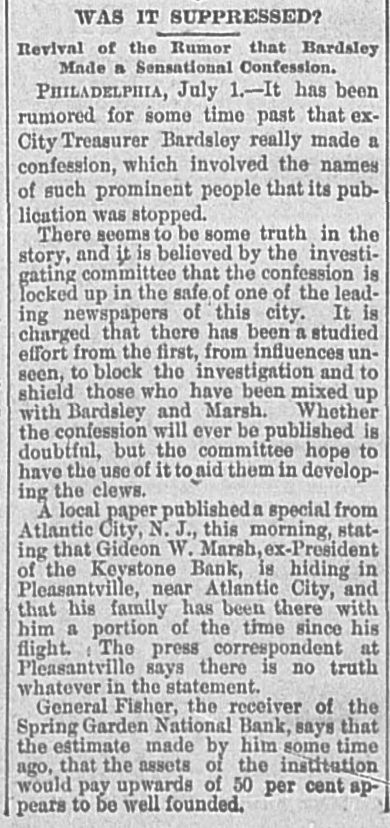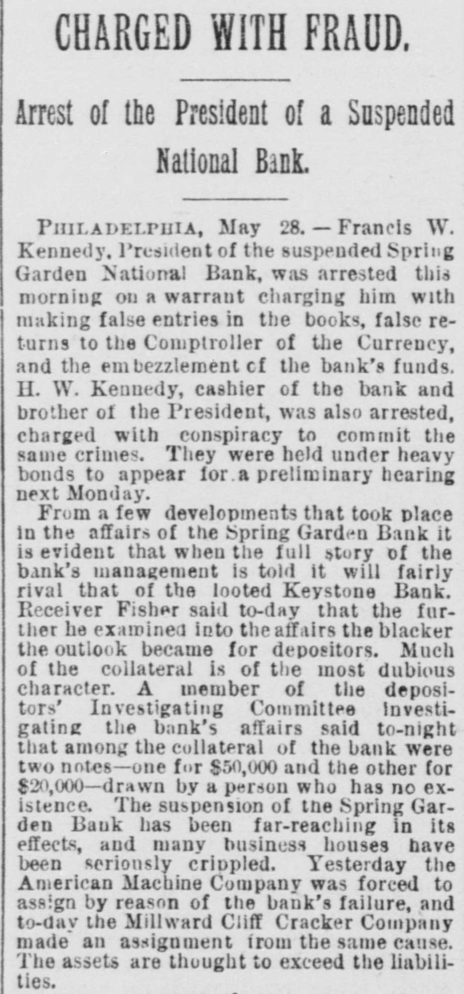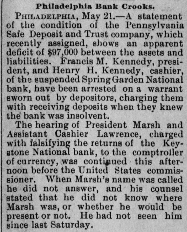 A BANK SHUTSIIS DOORS. THE SPRING GARDEN NATIONAL OF PHILADELPHIA FAILS. The Crash followed by the Suspen8 on of the Penn afe Deposit and Trust Company-The Failures a Eurprise to the Public-Fair Rep rts at the Last Showing. PHILADELPHIA, May 8.-Under an order received from Controller of the Treasury Lacey the doors of the Spring Garden National Bank were cl sed at 11 o'clock this morning. News of the suspension spread through the city like wildfire, and it was not long before the frightened depositors began to gather around the bank building at Twelfth and Spring Garden streets. Scarcely had the announcement of the failure of the Spring Garden bank been made before there was a rumor afloat that the Penn Safe Deposit and Trust Company, also located at Twelfth and Spring Garden streets, had also suspended payment. A SURPRISE. To the general public the crash was a great surprise, for at the last sale of Spring Garden' bank stock on April 28, 1891, the price obtained was $121 50, which is exactly $21 50 above par. The capital stock of the institution was quoted at $750,000 and there was supposed to be a surplus of $130,000. A dividend of 21/2 per cent. was paid upon the capital stock at the last annual meeting and the bank was therefore generally supposed to be sound. THE CITY CAUGHT. The bank is a large depository of the city's money. According to the statement of City Treasurer Bardsley he has $144,000 on deposit in the institution. The officers of the bank are: President, Francis W. Kennedy; cashier, Henry H, Kennedy; assistant cashier, S. A. McClure. The board of directors were Francis W. Kennedy, Nathan Middleton, Ephraim Turland, Nelson F. Evans, Ephraim Young, Robert C. Thomas and John B. Stetson. At 11:30 the following notice was placed upon the door: This bank is closed by order of the controller of the currency until further notice. W. B. DREW, National Bank Examiner. A STATEMENT BY THE PRESIDENT. When the people gathered immediately af er the doors had closed, President Kens nedy looked outof a side door and called out that he had no statement to m ke. As soon as he had finished speaking ne disappeared inside, amid the shou S and jeers of t e disappoint crowd. Later he gave out the following statement: We have this morning decided to place the bank in the hands of Mr. Drew. the national bank examiner. This step has been forced upon us principally by reason of the large withdrawal of deposits during the financial stringency which commenced last September, and the continued dullness of general business since. To meet these demands and maintain our reserve it was found impossible to realize rapidly enough upon the assets. We have been below our reserve for some weeks past, and can see no immediate prospects of increasing it. We still owe a balance to the clearing house committee for outstanding loan certificates, the payment of which is being pressed These facts, coupled with the disturbances of the past week, have caused increased weakness on the part of some of our depositors, together with weakening of our credit with other banks. We trust that the suspension will be only temporary. FRANCIS W. KENNEDY, President. THE TRUST COMPANY. The Penn Trust Company is now a state institution, but it was originally an outgrowth of the bank in this city. The stockholders of the bank are also largely stockholders of the trust company. Samuel B. Huey was consulted by persons interested and connected with the trust company 88 to the di