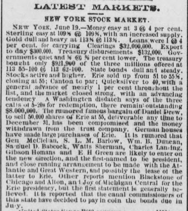 LATEST MARKETS. NEW YORK STOCK MARKET. NEW YORK. June 19.-Money easy at 3 @ 4 per cent. Sterling easy at 109% @ 109%, with an increased supply. Gold dull and heavy at 113% @ 113% Loans were I @ 4 per cent. for carrying Clearings $32,000,000. Export to day $300.000. Treasury disbursements $132,000. Governments quiet and % @ % per cent lower, The treasury bought only $921,900 of the three millions offered at 113 55-100 @ 113 62-100. State bonds dull and steady. Stocks active and higher. Erie sold up from 51 to 55% closing at 55; Canton to par: Quicksilver to 40, with a general advance of nearly 1 per cent throughout the list, and the market closed strong. with an advancing tendency A Washingten disdatch says of the three calls of 5-20s for redemption, there remain: outstanding $8.000,000. The rumored famous bargain of Daniel Drew, to sell 50,000 shares of Erie at 55, deliverable any time to December 31. has been compromised and the money withdrawn from the trust company. German houses have made large purchases of Erie. It Is rumored that Gen McClelian. S. L. M. Barlow. Wm. B. Dunean, Namuel D. Babcock, Watts Sherman, Charles Lan-ing, Gibson Homans and E H Green are likely to enter on the new direction, and the first-named to be president, and close running arrangement to be made with the Atlantie and Great Western, and possibly the lease of the latter to Erie. Other reports mention Blackstone of Chicago and Alton, an Joy of Michigan Central for the Erie presidency, but the first statement Is generally believed. It is reported that the canal commissioners of this state have decided to pay in coin the bonds due in Juy.