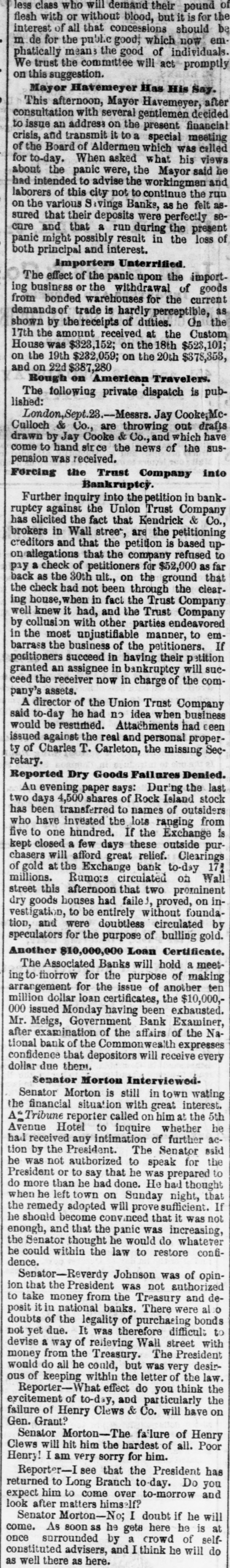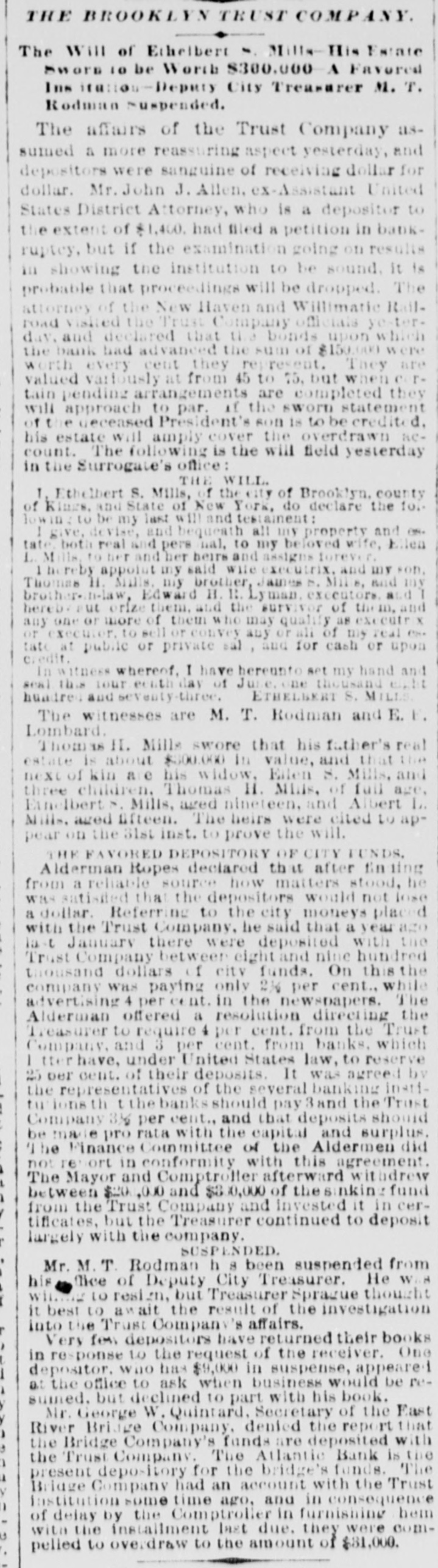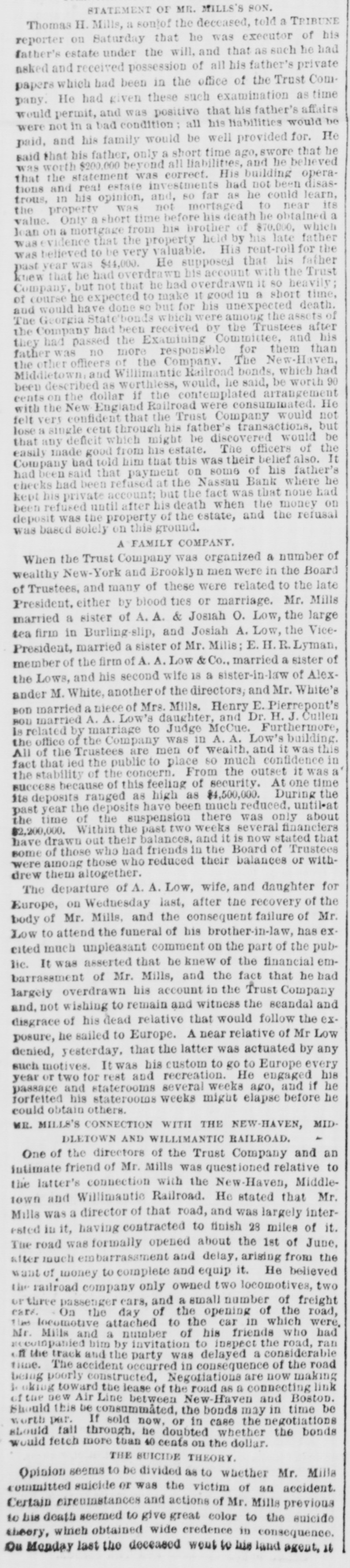 STATEMENT OF MR. MILLS'S SON. Thomas H. Mills, a sonjof the deceased, told a TRIBUNE reporter on Saturday that he was executor of his father's estate under the will, and that as such he had asked and received possession of all his father's private papers which had been in the office of the Trust Com- time pany. He had given these such examination as would permit, and was positive that his father's would affairs be were not in a bad condition ; all his liabilities paid, and his family would be well provided for. He that his father, only a short time ago, swore believed that he said worth $200,000 beyond all liabilities, and he was the statement was correct. His building opera- disasthat and real estate investments had not been tions in his opinion, and, so far as he could learn, its trous, property was not mortaged to near the Only a short time before his death he obtained which a value. on a mortgage from his brother of $70,000. father Joan that the property held by his late for was evidence believed to be very valuable. His rent-roll his father the was was $44,000. He supposed that the Trust past year that he had overdrawn his account with knew but not that be had overdrawn it so beavily; Company. expected to make it good in a short time, have done 80 but for his State'bonds which were among and of The course Georgia would he unexpected Trustees the assets death. after of Company had been received by the the had passed the Examining Committee, and than his they was no more responsible for them father other officers of the Company. The New-Haven, Middletown the and Willimantic Railroad bonds, which had 90 been described as worthless, would. he said, be worth dollar if the contemplated arrangement cents on the with the New England Railroad were consummated. not He very confident that the Trust Company would but felt lose a single cent through his father's transactions. be that deficit which might be discovered would of the any made good from his estate. The officers It easily bad told him that this was their belief also. father's had been said Company that payment on some of his he checks had been refused at the Nassau Bank where had kept his private account; but the fact was that none been refused until after his death when the money on deposit was the property of the estate, and the refusal was based solely on this ground. A FAMILY COMPANY. When the Trust Company was organized a number of wealthy New-York and Brookly n men were in the Board of Trustees, and many of these were related to the late President. either by blood ties or marriage. Mr. Mills married a sister of A.A & Josiah O. Low, the large tea firm in Burling-slip, and Josiah A. Low, the VicePresident, married a sister of Mr. Mills; E.H.R.Lyman, member of the firm of A. Low &Co., married a sister of the Lows, and his second wife 18 a sister-in-law of Alexander M. White, another of the directors, and Mr. White's married a niece of Mrs. Mills. Henry E. Pierrepont's Cullen BOD married A. A. Low's daughter, and Dr. H. J. related by marriage to Judge McCue. Furthermore, Is office of the Company was in A. A. Low's building. All the of the Trustees are men of wealth, and it was this that led the public to place so much confidence in fact the stability of the concern. From the outset it was a because of this feeling of security. At one time its success deposits ranged as high as $4,500,000. During the the deposits have been much reduced. until-at past year time of the suspension there was only about the Within the past two weeks several financiers $2,200,000. have drawn out their balances, and it is now stated that of those who had friends in the Board of Trustees were some among those who reduced their balances or withdrew them altogether. The departure of A. A. Low, wife, and daughter for Europe, on Wednesday last, after the recovery of the body of Mr. Mills, and the consequent failure of Mr. Low to attend the funeral of his brother-in-law, has excited much unpleasant comment on the part of the public. It was asserted that be knew of the financial embarrassment of Mr. Mills, and the fact that he had largely overdrawn his account in the Trust Company and, not wishing to remain and witness the scandal and disgrace of his dead relative that would follow the exposure, he sailed to Europe. A near relative of Mr Low denied, yesterday. that the latter was actuated by any such motives. It was his custom to go to Europe every year or two for rest and recreation. He engaged his passage and staterooms several weeks ago, and if he forfeited his staterooms weeks might elapse before he could obtain others. MR. MILLS'S CONNECTION WITH THE NEW-HAVEN, MID DLETOWN AND WILLIMANTIC RAILROAD. One of the directors of the Trust Company and an intimate friend of Mr. Mills was questioned relative to the latter's connection with the New-Haven, Middletown and Willimautic Railroad. He stated that Mr. Mills was a director of that road, and was largely interested in it, having contracted to finish 28 miles of it. The road was formally opened about the 1st of June, alter much embarrassment and delay, arising from the want of money to complete and equip it. He believed the railroad company only owned two locomotives, two three passenger cars, and a small number of freight care On the day of the opening of the road, that locomotive attached to the car in which were, Mr. Mills and a number of his friends who had accompanied bim by invitation to inspect the road, ran off the track and the party was delayed a considerable time. The accident occurred in consequence of the road being poorly constructed, Negotiations are now making looking toward the lease of the road as connecting link oftne new Air Line between New-Haven and Boston. Should this be consummated, the bonds may in time be worth par. If sold now. OF in case the negotiations should fall through. be doubted whether the bonds would fetch more than 40 cents on the dollar. THE SUICIDE THEORY. Opinion seems to be