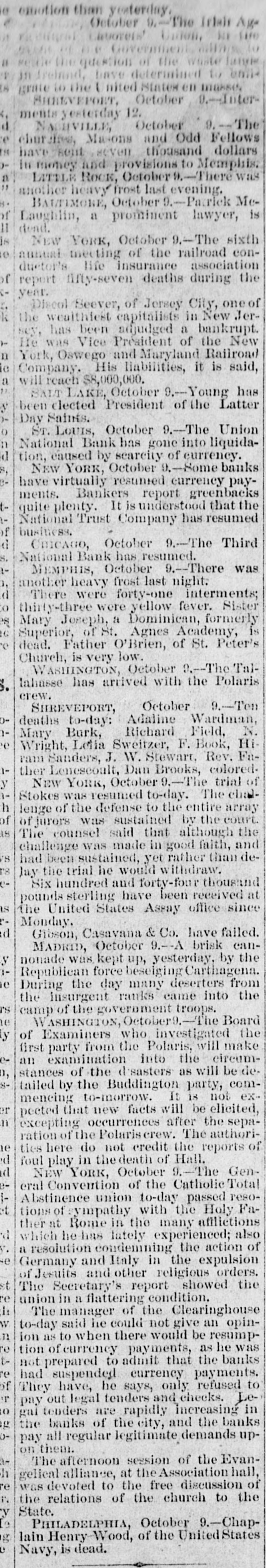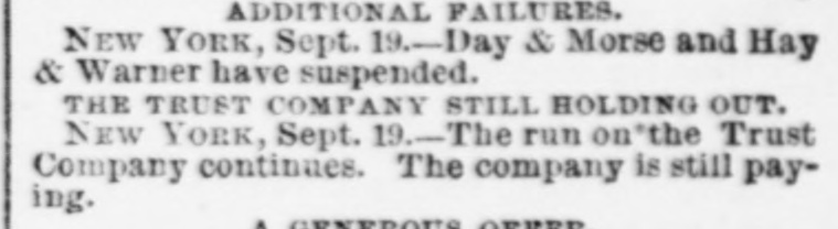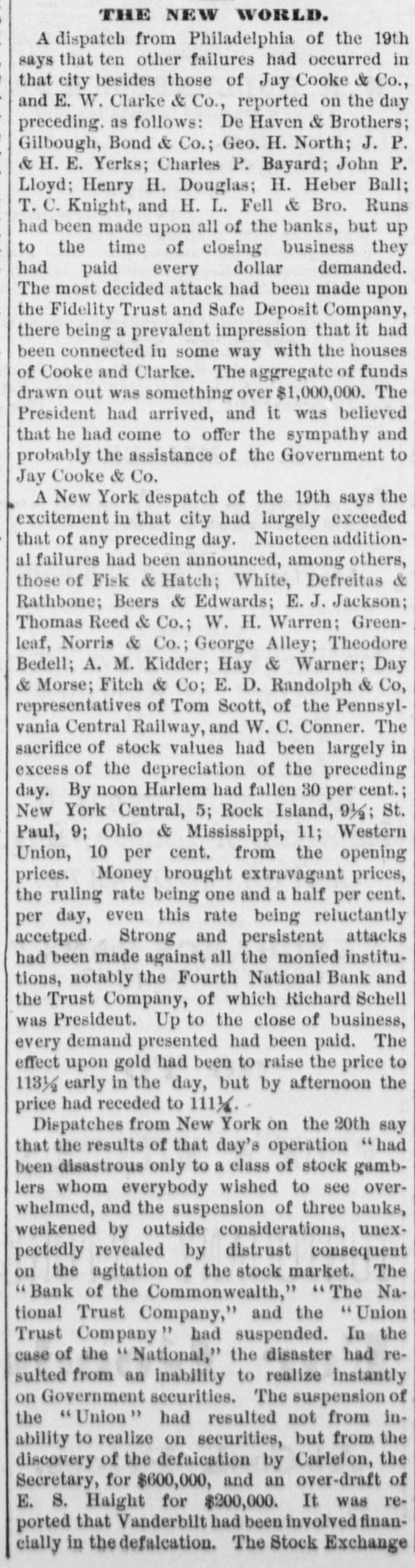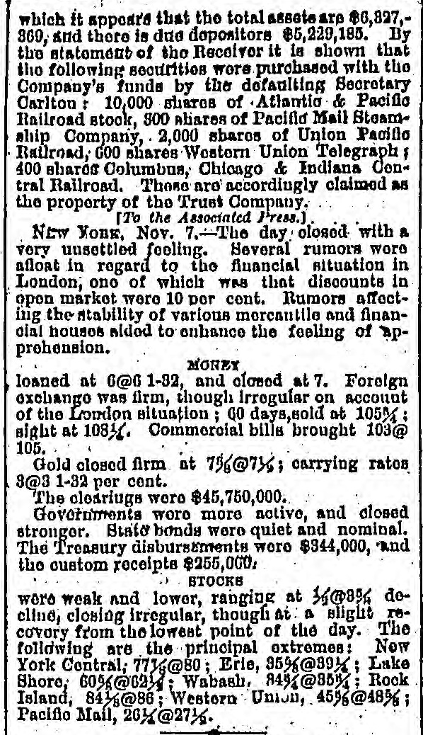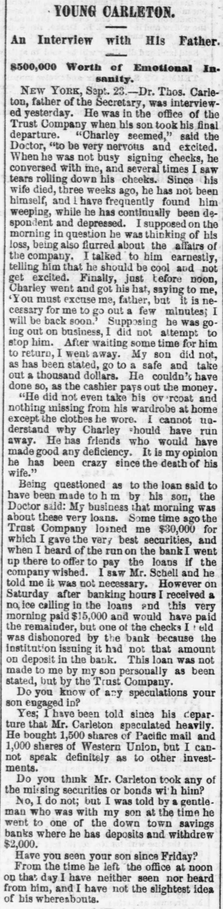 STATEMENT OF MR. MILLS'S SON. Thomas H. Mills, a sonjof the deceased, told a TRIBUNE reporter on Saturday that he was executor of his father's estate under the will, and that as such he had asked and received possession of all his father's private papers which had been in the office of the Trust Com- time pany. He had given these such examination as would permit, and was positive that his father's would affairs be were not in a bad condition ; all his liabilities paid, and his family would be well provided for. He that his father, only a short time ago, swore believed that he said worth $200,000 beyond all liabilities, and he was the statement was correct. His building opera- disasthat and real estate investments had not been tions in his opinion, and, so far as he could learn, its trous, property was not mortaged to near the Only a short time before his death he obtained which a value. on a mortgage from his brother of $70,000. father Joan that the property held by his late for was evidence believed to be very valuable. His rent-roll his father the was was $44,000. He supposed that the Trust past year that he had overdrawn his account with knew but not that be had overdrawn it so beavily; Company. expected to make it good in a short time, have done 80 but for his State'bonds which were among and of The course Georgia would he unexpected Trustees the assets death. after of Company had been received by the the had passed the Examining Committee, and than his they was no more responsible for them father other officers of the Company. The New-Haven, Middletown the and Willimantic Railroad bonds, which had 90 been described as worthless, would. he said, be worth dollar if the contemplated arrangement cents on the with the New England Railroad were consummated. not He very confident that the Trust Company would but felt lose a single cent through his father's transactions. be that deficit which might be discovered would of the any made good from his estate. The officers It easily bad told him that this was their belief also. father's had been said Company that payment on some of his he checks had been refused at the Nassau Bank where had kept his private account; but the fact was that none been refused until after his death when the money on deposit was the property of the estate, and the refusal was based solely on this ground. A FAMILY COMPANY. When the Trust Company was organized a number of wealthy New-York and Brookly n men were in the Board of Trustees, and many of these were related to the late President. either by blood ties or marriage. Mr. Mills married a sister of A.A & Josiah O. Low, the large tea firm in Burling-slip, and Josiah A. Low, the VicePresident, married a sister of Mr. Mills; E.H.R.Lyman, member of the firm of A. Low &Co., married a sister of the Lows, and his second wife 18 a sister-in-law of Alexander M. White, another of the directors, and Mr. White's married a niece of Mrs. Mills. Henry E. Pierrepont's Cullen BOD married A. A. Low's daughter, and Dr. H. J. related by marriage to Judge McCue. Furthermore, Is office of the Company was in A. A. Low's building. All the of the Trustees are men of wealth, and it was this that led the public to place so much confidence in fact the stability of the concern. From the outset it was a because of this feeling of security. At one time its success deposits ranged as high as $4,500,000. During the the deposits have been much reduced. until-at past year time of the suspension there was only about the Within the past two weeks several financiers $2,200,000. have drawn out their balances, and it is now stated that of those who had friends in the Board of Trustees were some among those who reduced their balances or withdrew them altogether. The departure of A. A. Low, wife, and daughter for Europe, on Wednesday last, after the recovery of the body of Mr. Mills, and the consequent failure of Mr. Low to attend the funeral of his brother-in-law, has excited much unpleasant comment on the part of the public. It was asserted that be knew of the financial embarrassment of Mr. Mills, and the fact that he had largely overdrawn his account in the Trust Company and, not wishing to remain and witness the scandal and disgrace of his dead relative that would follow the exposure, he sailed to Europe. A near relative of Mr Low denied, yesterday. that the latter was actuated by any such motives. It was his custom to go to Europe every year or two for rest and recreation. He engaged his passage and staterooms several weeks ago, and if he forfeited his staterooms weeks might elapse before he could obtain others. MR. MILLS'S CONNECTION WITH THE NEW-HAVEN, MID DLETOWN AND WILLIMANTIC RAILROAD. One of the directors of the Trust Company and an intimate friend of Mr. Mills was questioned relative to the latter's connection with the New-Haven, Middletown and Willimautic Railroad. He stated that Mr. Mills was a director of that road, and was largely interested in it, having contracted to finish 28 miles of it. The road was formally opened about the 1st of June, alter much embarrassment and delay, arising from the want of money to complete and equip it. He believed the railroad company only owned two locomotives, two three passenger cars, and a small number of freight care On the day of the opening of the road, that locomotive attached to the car in which were, Mr. Mills and a number of his friends who had accompanied bim by invitation to inspect the road, ran off the track and the party was delayed a considerable time. The accident occurred in consequence of the road being poorly constructed, Negotiations are now making looking toward the lease of the road as connecting link oftne new Air Line between New-Haven and Boston. Should this be consummated, the bonds may in time be worth par. If sold now. OF in case the negotiations should fall through. be doubted whether the bonds would fetch more than 40 cents on the dollar. THE SUICIDE THEORY. Opinion seems to be