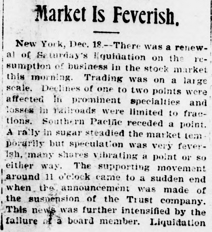 Market Is Feverish. New York, Dec. 18.--There was a renewal of Saturday's Equidation on the resumption of business in the stock market this morning. Trading was on a large scale. Declines of one to two points were affected in prominent specialties and losses in railroads were limited to fractions. Southern Pacine receded a point. A raily in sugar steadied the market tem porarily but speculation was very feverish, many shares vibrating a point or so either way. The supporting movement around 11 o'clock came to a sudden end when the announcement was made of the suspension of the Trust company. This news was further intensified by the failure of a board member. Liquidation