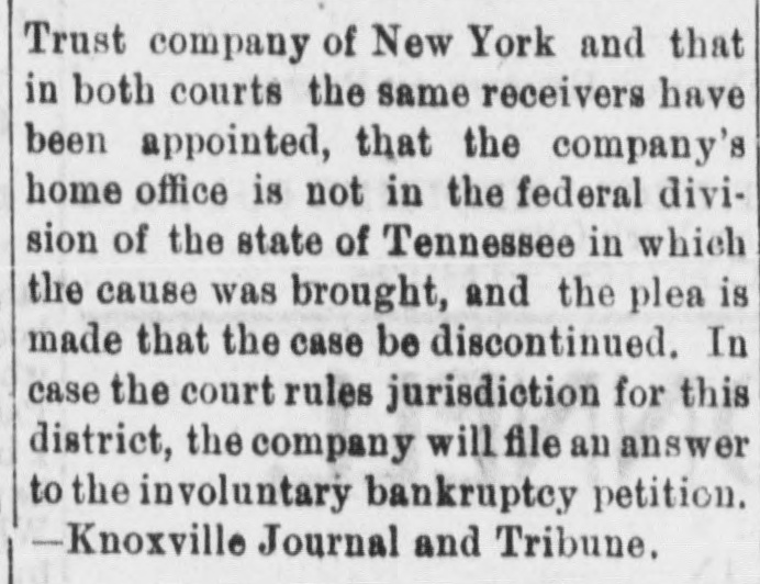 Trust company of New York and that in both courts the same receivers have been appointed, that the company's home office is not in the federal division of the state of Tennessee in which the cause was brought, and the plea is made that the case be discontinued. In case the court rules jurisdiction for this district, the company will file an answer to the involuntary bankruptcy petition. -Knoxville Journal and Tribune.