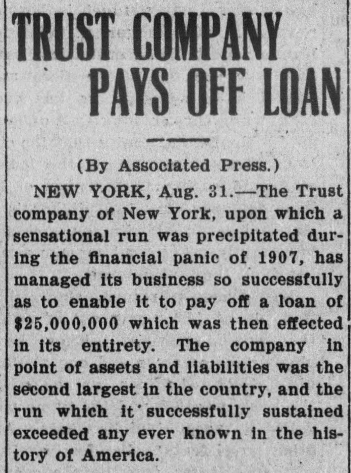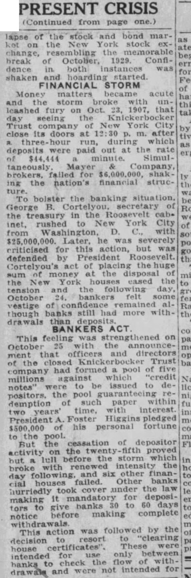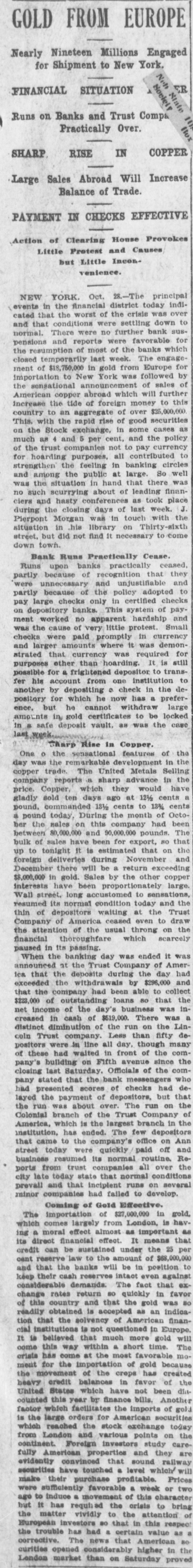 FROM GOLD EUROPE Nearly Millions Nineteen Engaged to York, SITUATION FINANCIAL on and Trust Comps Runs Banks Over Practically IN RISE COPPER SHARP Will of Trade. IN CHECKS PAYMENT EFFECTIVE of House Action Lietne Pretent Clearing and Causes Little Incon but venience. cated YORK. Oct. district crisis down and that NEW in the of the nettling bank normal. and were reports events further for mensions of the of most banks The last week. engage from Europe by followed the revemporarily in gold was of annound abroad which money closed ment of #19-750,000 $18 to New York of will further to this 5.000.000 of the copper of foreign of over securities on American the tide aggregate good as 4 and increase country with to the an Tapid rine change, in and some the currency policy all This, the Stock 5 per cent not to payment circles and much as trust company purposes banking so well of the harding feeling in at large there was situating as for strengthen the the public hand that leading finan place among stuation in about of took week was the Currying inferences last with the no such hastying days in of touch Pierpone in situation not did find street, ciers and closing was Thirts come town during the Morgan ,his library It on to Cease. they down Bank Runs banks genition practically that and to Runs upon of and unjustido checks partly the nolley certified lifed of were only in pay and partly because chobanks This hardship Small pay deposited Inobitory large no apparene little protest. in currency on of very promptly was demon and that ment was the cause were paid where it required still for checks larger amounts american harding. was It to trans to strated other Mightened than depositpottution the defor purpose for from one check in prefer account ting now has large amo: safe once, deposit for another his by deposit which cannot he withdraw to be locked case pository but gold he certificate vault, all was the Codner. of the last in a Charg national Rine in features Selling in the which at day One was trade the the markable The sharp United advance Metals would cents in have the copper reports they 12 1/2 cents ten days ago cents to 13% of Octo gladly comman During compan price. sold anded 18th the month had been The round, this nounds. that pound today sales on and 000.000 so on the a the $0,000,000 for that and bulk of tonight It during return ber sales have is been estimanovember copper up to tineries will be the other large Coreign there gold Sales by the $5,000,000 December in have been property today to and Trust interests long condition the Wall state street, hositors normal writing ceased at even to on draw the the Competition thorousing. ighfare resumed thin of of America of the usual which throng scarcell financial passing it was ended of Amer financial baused in the its banking day Company the day had and the Trust during $296.00 When at depondrawals suposits by to the the withdrawed able that ica that company the had loans so was in a creased exce the compating business was that of the day's $519,000. There the Lin $223,000 of of run on fifty do net income in intinution cash of the Less than though mans com cream distinct ammandany all day of the the Trust see line in front since com de coin positors were had waited on Fifth Official" Mongers avenue of the who of these building had pany's last Saturday bank checks but that closing stated that scores of ositors. run on the of pany presented of over. The Company the had the Trust branch layed was about of the largest depositor came the run branch is the few on Anne were Colonial Colarica, which ended. The office off and Re toursumed ports America, Assistution to has the company compickly paid routine over the today that today companies norma all conditions incipient to minor street business from resumed trust state that normal runs develop. on severa city late and that had failed Effects gold prevail of Gold $27,000,000 in is hav Coming of London, Londontont The importangels almost from as means the per which moral comes effect effect under It the $68,000. 000,000 to its can be to the be in ing a direct financialized inancial amount of opition credit reserve law banks will intaor even that cant that the baserves reserve The fact in favor BO and their quickly was Keeperable return so the gold indica considerates that c as an finan change country and is accept enepted American Europe of this obtained of ationed in gold will readuse that the solvenes is not more time. The tion that much a short vorable mo ctal helleved within most gold because It 10 this come way at the of has create come has crops of the dill orists for the the of in favor been move Att have bills. mout balances not Another the heavy credit States which by finance the important of gol United United this year tacilicates for American exchange todas the factor orders stock points on care the large large the various study are is which ondon reached and investors and they Foreign perties railway continent. from loan pro that sound which will urchase level Prices fully Am convinoed touched a profitable. or expurities evidential exidently have purchase week character two make their payment favorable of this to bring o sufficientis move the orisis ntion were to induce required the respect ago has vividly to in this as that value BE but mattenvestors so a certain American the invest bad has that higher in th London curities market opened than on Europeable trouble The news nonderably proved the oons Saturday