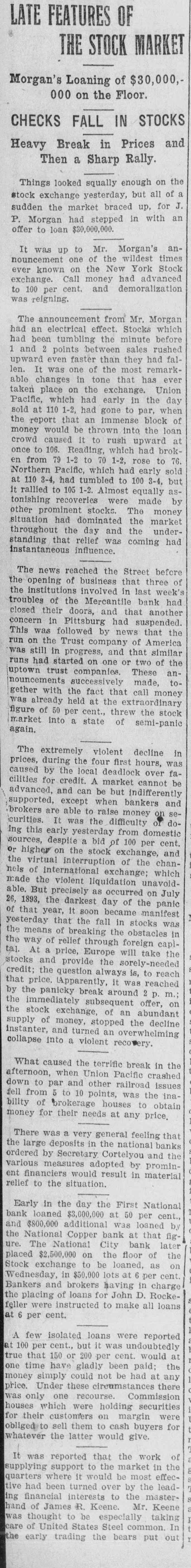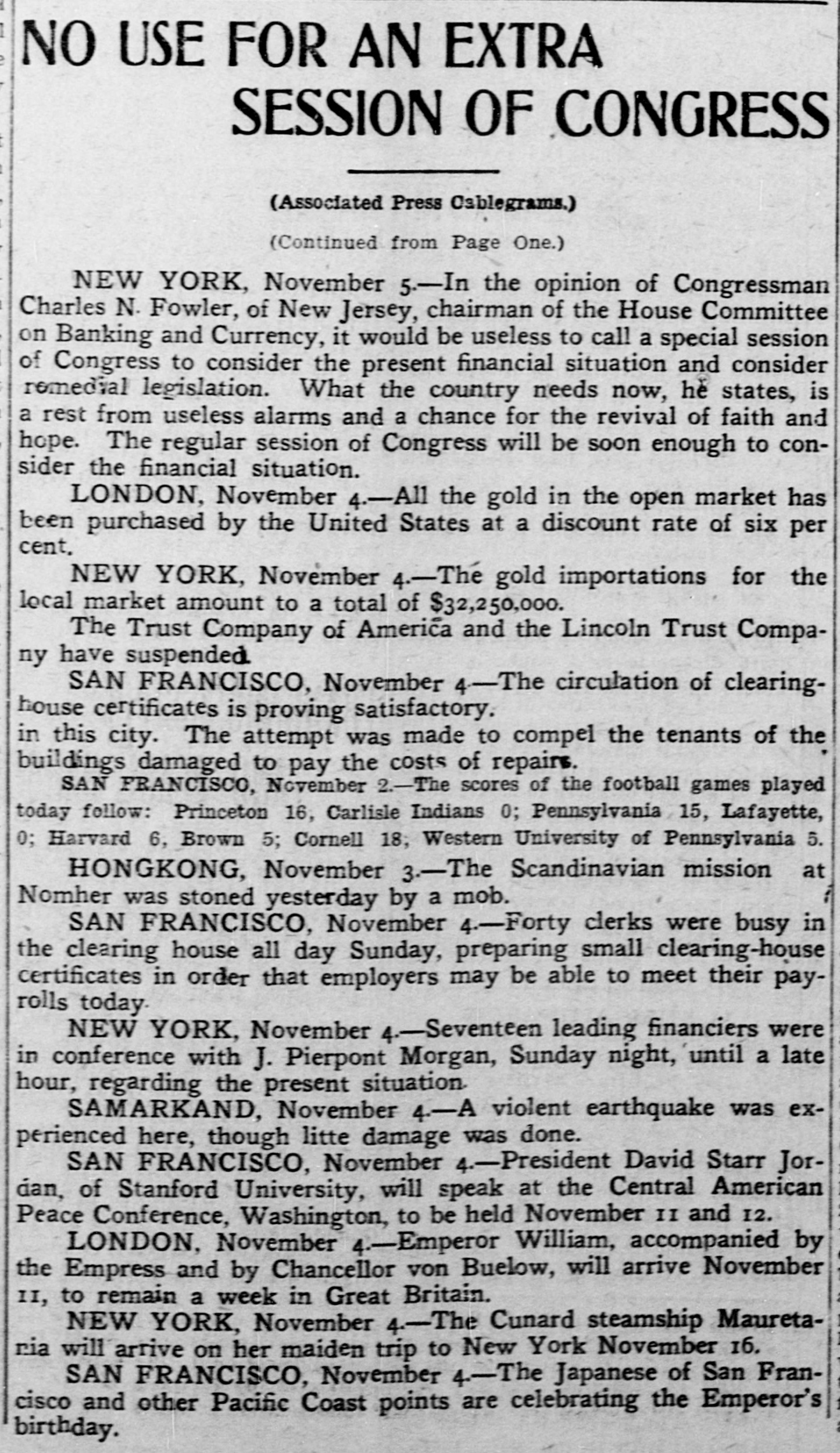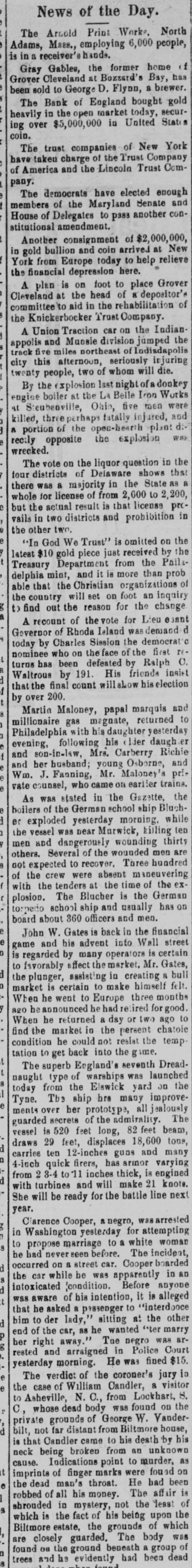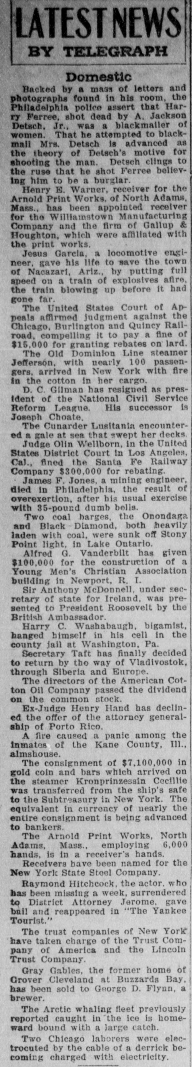 LATEST NEWS BY TELEGRAPH Domestic Backed by a mass of letters and photographs found in his room, the Philadelphia police assert that Harry Ferree, shot dead by A. Jackson Detsch, Jr., was a blackmailer of women. That he attempted to blackmail Mrs. Detsch is advanced as the theory of Detsch's motive for shooting the man. Detsch clings to the ruse that he shot Ferree believIng him to be a burglar. Henry E. Warner, receiver for the Arnold Print Works. of North Adams, Mass., has been appointed receiver for the Williamstown Manufacturing Company and the firm of Gallup & Houghton, which were affiliated with the print works. Jesus Garcia, a locomotive engineer. gave his life to save the town of Nacazari, Ariz., by putting full speed on a train of explosives afire, the train blowing up before it had gone far. The United States Court of Appeals affirmed judgment against the Chicago, Burlington and Quincy Railroad, compelling it to pay a fine of $15,000 for granting rebates on lard. The Old Dominion Line steamer Jeffersón. with nearly 100 passengers, arrived in New York with fire in the cotton in her cargo. D. C. Gilman has resigned as president of the National Civil Service Reform League. His successor is Joseph Choate. The Cunarder Lusitania encountered a gale at sea that swept her decks. Judge Olin Wellborn, in the United States District Court in Los Angeles, Cal., fined the Santa Fe Railway Company $300,000 for rebating. James F. Jones, a mining engineer, died in Philadelphia, the result of overexertion, after his usual exercise with 35-pound dumb bells. Two coal harges, the Onondaga and Black Diamond, both heavily laden with coal, were sunk off Stony Point light, in Lake Ontario. Alfred G. Vanderbilt has given $100,000 for the construction of a Young Men's Christian Association building in Newport, R. I. Sir Anthony McDonnell, under secretary of state for Ireland, was presented to President Roosevelt by the British Ambassador. Harry C. Washabaugh, bigamist, hanged himself in his cell in the county jail at Washington, Pa. Secretary Taft has finally decided to return by the way of Vladivostok, through Siberia and Europe. The directors of the American Cotton Oil Company passed the dividend on the conimon stock. Ex-Judge Henry Hand has declined the offer of the attorney generalship of Porto Rico. A fire caused a panic among the inmates of the Kane County, III., almshouse. The consignment of $7,100,000 in gold coin and bars which arrived on the steamer Kronprinzessin Cecillie was transferred from the ship's safe to the Subtreasury in New York. The equivalent in currency of nearly the entire consignment is being advanced to bankers. The Arnold Print Works, North Adams, Mass., employing 6,000 hands, is in a receiver's hands. Receivers have been named for the New York State Steel Company. Raymond Hitchcock, the actor. who has been missing a week, surrendered to District Attorney Jerome, gave bail and reappeared in "The Yankee Tourist." The trust companies of New York have taken charge of the Trust Company of America and the Lincoln Trust Company. Gray Gables, the former home of Grover Cleveland at Buzzards Bay, has been sold to George D. Flynn, a brewer. The Arctic whaling fleet previously reported caught in the ice is homeward bound with a large catch. Two Chicago laborers were electrocuted by the cable of a derrick becoming charged with electricity.