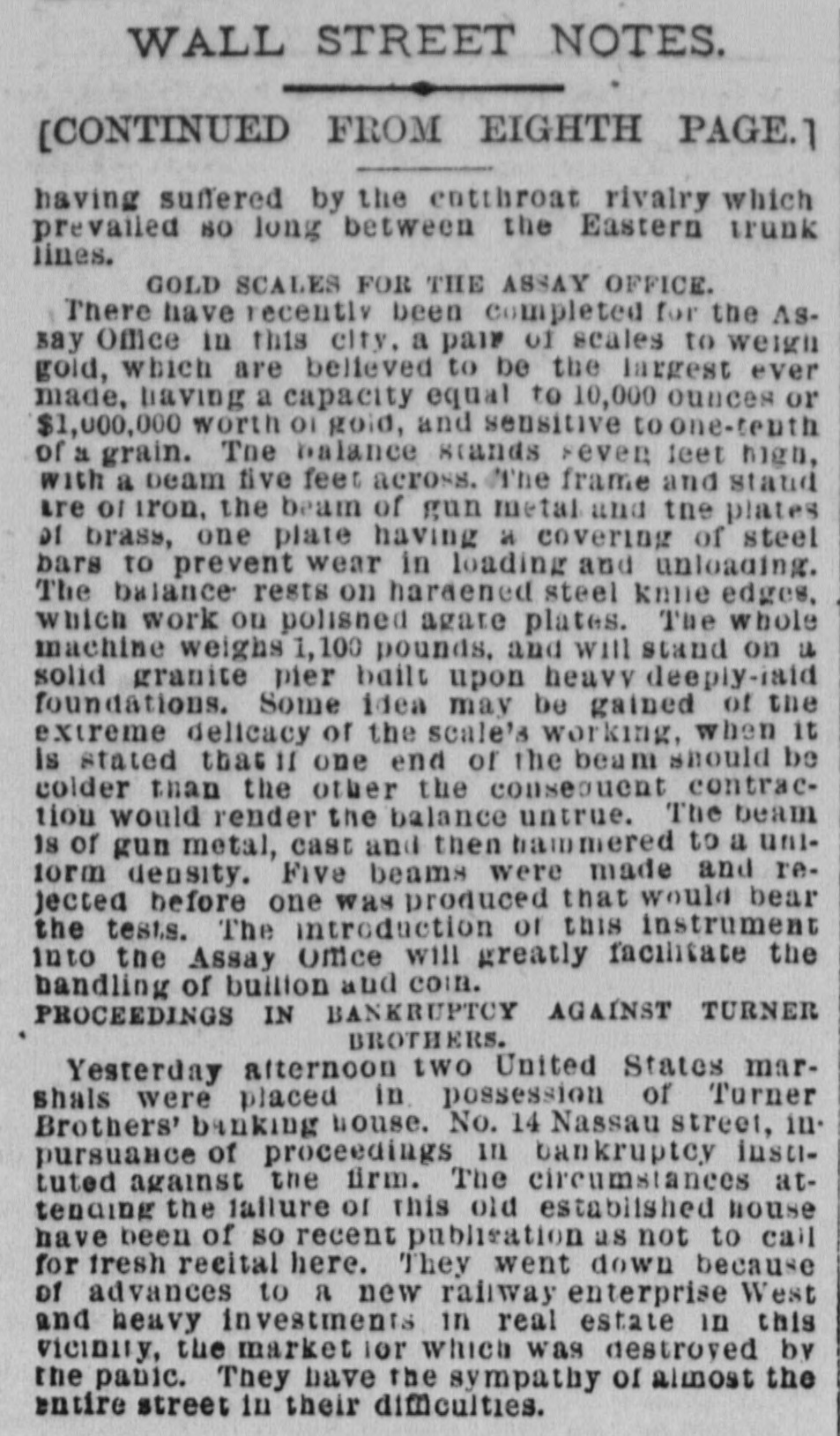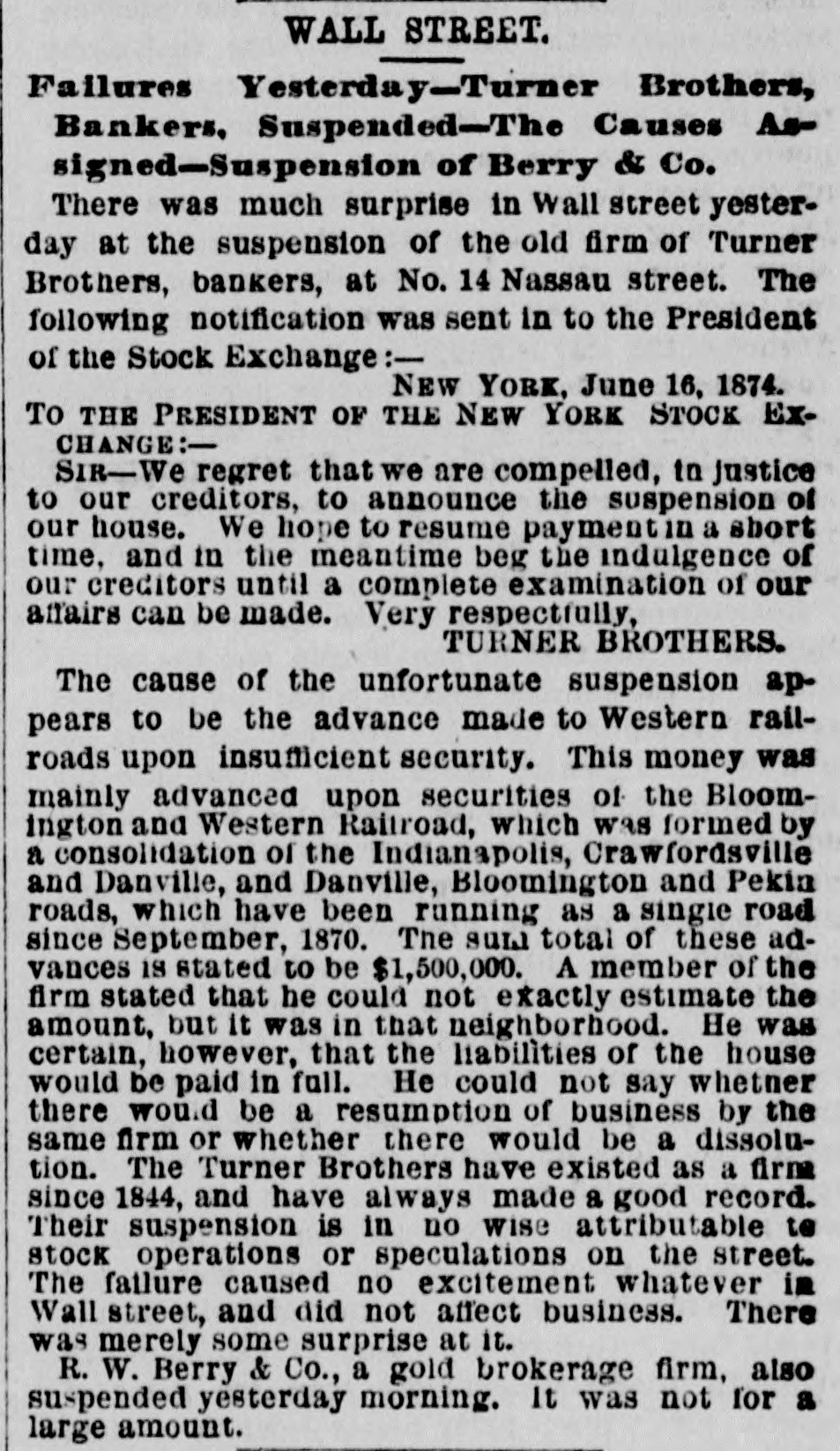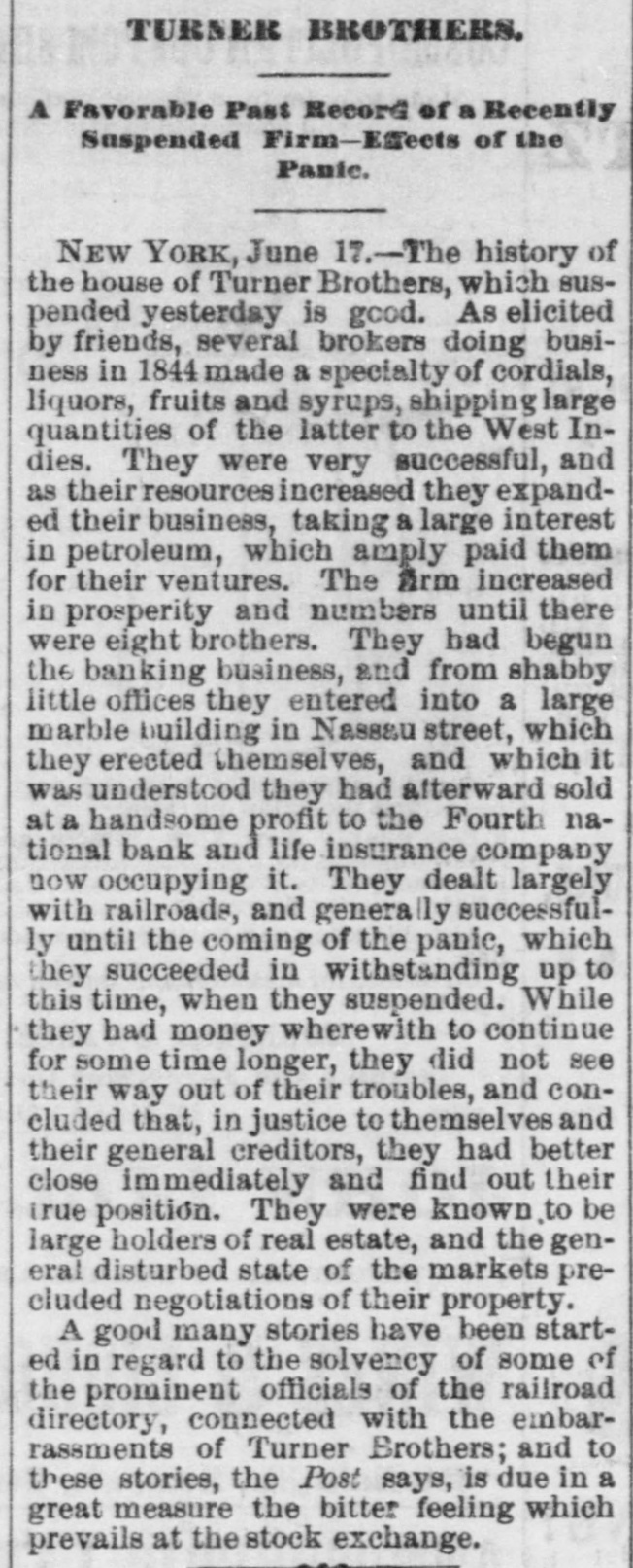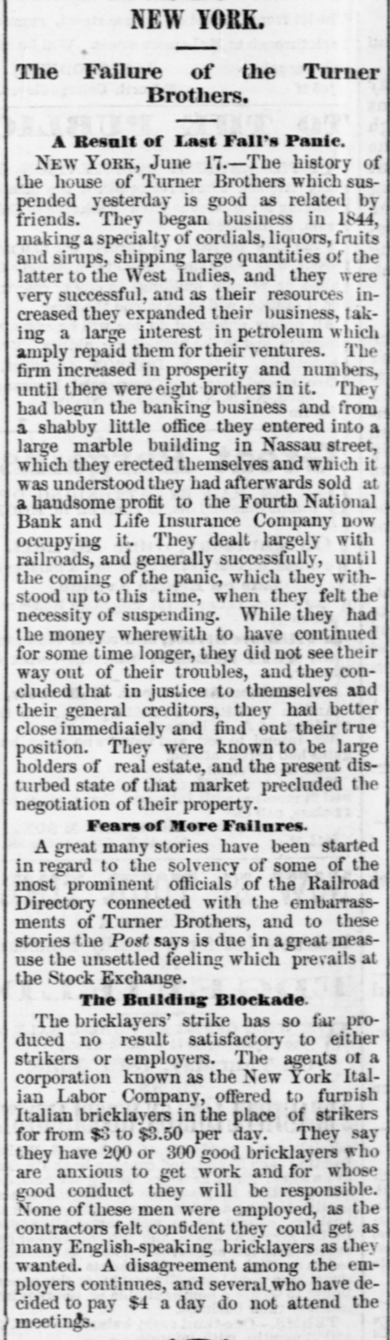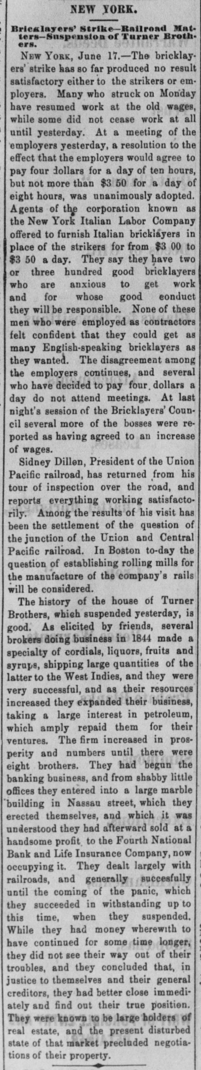 NEW YORK. Bricklayers' Strike-Railroad Matters-Suspension of Turner Brothers. NEW YORK, June 17.-The bricklayers' strike has so far produced no result satisfactory either to the strikers or employers. Many who struck on Monday have resumed work at the old wages, while some did not cease work at all until yesterday. At a meeting of the employers yesterday, a resolution to the effect that the employers would agree to pay four dollars for a day of ten hours, but not more than $3.50 for a day of eight hours, was unanimously adopted. Agents of the corporation known as the New York Italian Labor Company offered to furnish Italian bricklayers in place of the strikers for from $3 00 to $3 50 a day. They say they have two or three hundred good bricklayers who are anxious to get work and for whose good eonduct they will be responsible. None of these men who were employed as contractors felt confident that they could get as many English-speaking bricklayers as they wanted. The disagreement among the employers continues, and several who have decided to pay four dollars a day do not attend meetings. At last night's session of the Bricklayers' Council several more of the bosses were reported as having agreed to an increase of wages. Sidney Dillen, President of the Union Pacific railroad, has returned from his tour of inspection over the road, and reports everything working satisfactorily. Among the results of his visit has been the settlement of the question of the junction of the Union and Central Pacific railroad. In Boston to-day the question of establishing rolling mills for the manufacture of the company's rails will be considered. The history of the house of Turner Brothers, which suspended yesterday, is good. As elicited by friends, several brokers doing business in 1844 made a specialty of cordials, liquors, fruits and syrups, shipping large quantities of the latter to the West Indies, and they were very successful, and as their resources increased they expanded their business, taking a large interest in petroleum, which amply repaid them for their ventures. The firm increased in prosperity and numbers until there were eight brothers. They had begun the banking business, and from shabby little offices they entered into a large marble building in Nassau street, which they erected themselves, and which it was understood they had afterward sold at a handsome profit to the Fourth National Bank and Life Insurance Company, now occupying it. They dealt largely with railroads, and generally succesfully until the coming of the panic, which they succeeded in withstanding up to this time, when they suspended. While they had money wherewith to have continued for some time longer, they did not see their way out of their troubles, and they concluded that, in justice to themselves and their general creditors, they had better close immediately and find out their true position. They were known to be large holders of real estate, and the present disturbed state of that market precluded negotiations of their property.