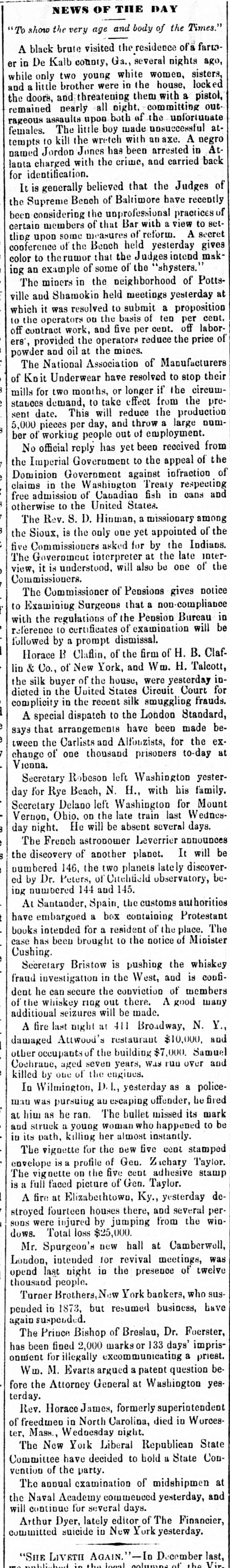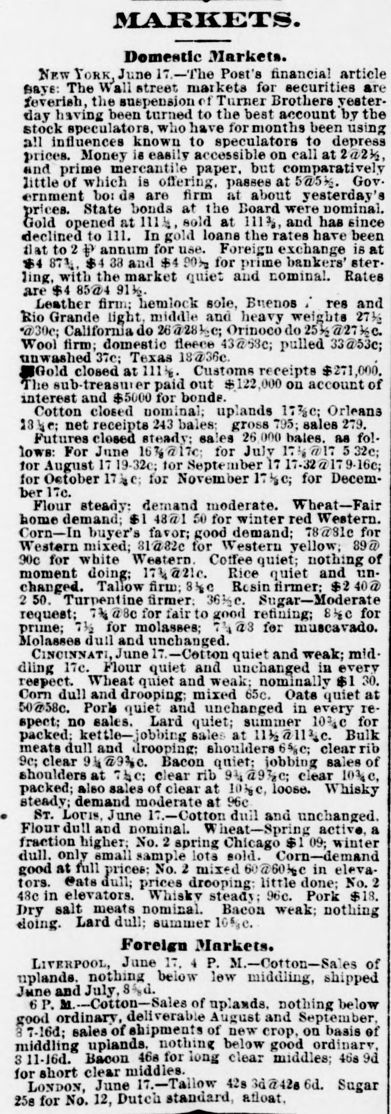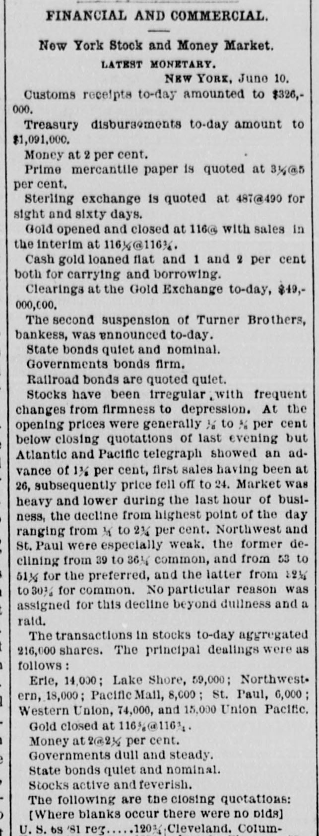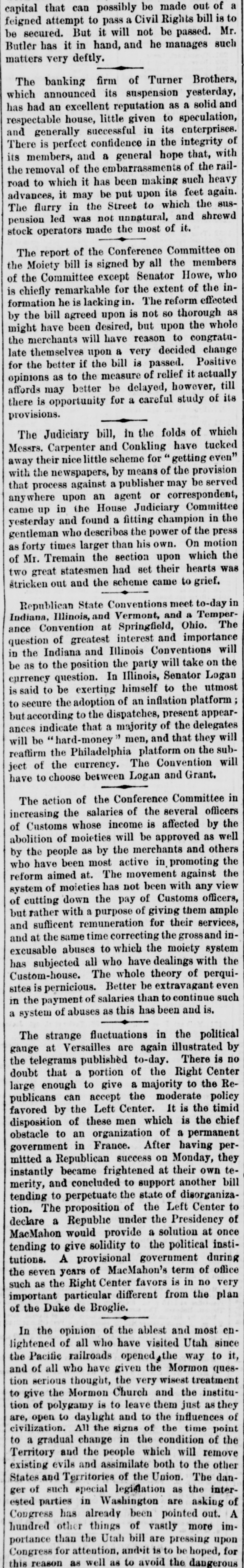 NEW YORK. Bricklayers' Strike-Railroad Matters-Suspension of Turner Brothers. NEW YORK, June 17.-The bricklayers' strike has so far produced no result satisfactory either to the strikers or employers. Many who struck on Monday have resumed work at the old wages, while some did not cease work at all until yesterday. At a meeting of the employers yesterday, a resolution to the effect that the employers would agree to pay four dollars for a day of ten hours, but not more than $3.50 for a day of eight hours, was unanimously adopted. Agents of the corporation known as the New York Italian Labor Company offered to furnish Italian bricklayers in place of the strikers for from $3 00 to $3 50 a day. They say they have two or three hundred good bricklayers who are anxious to get work and for whose good eonduct they will be responsible. None of these men who were employed as contractors felt confident that they could get as many English-speaking bricklayers as they wanted. The disagreement among the employers continues, and several who have decided to pay four dollars a day do not attend meetings. At last night's session of the Bricklayers' Council several more of the bosses were reported as having agreed to an increase of wages. Sidney Dillen, President of the Union Pacific railroad, has returned from his tour of inspection over the road, and reports everything working satisfactorily. Among the results of his visit has been the settlement of the question of the junction of the Union and Central Pacific railroad. In Boston to-day the question of establishing rolling mills for the manufacture of the company's rails will be considered. The history of the house of Turner Brothers, which suspended yesterday, is good. As elicited by friends, several brokers doing business in 1844 made a specialty of cordials, liquors, fruits and syrups, shipping large quantities of the latter to the West Indies, and they were very successful, and as their resources increased they expanded their business, taking a large interest in petroleum, which amply repaid them for their ventures. The firm increased in prosperity and numbers until there were eight brothers. They had begun the banking business, and from shabby little offices they entered into a large marble building in Nassau street, which they erected themselves, and which it was understood they had afterward sold at a handsome profit to the Fourth National Bank and Life Insurance Company, now occupying it. They dealt largely with railroads, and generally succesfully until the coming of the panic, which they succeeded in withstanding up to this time, when they suspended. While they had money wherewith to have continued for some time longer, they did not see their way out of their troubles, and they concluded that, in justice to themselves and their general creditors, they had better close immediately and find out their true position. They were known to be large holders of real estate, and the present disturbed state of that market precluded negotiations of their property.