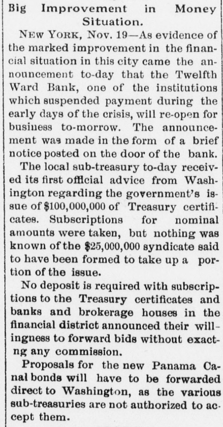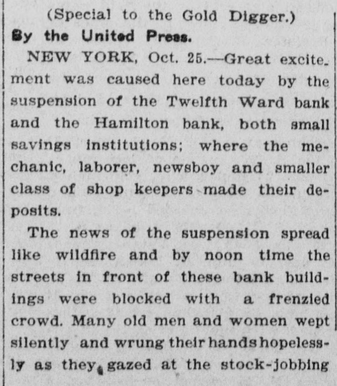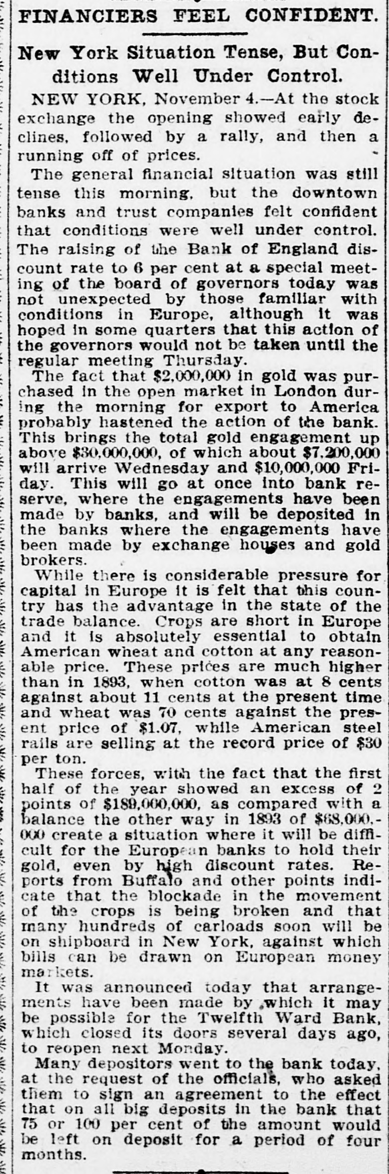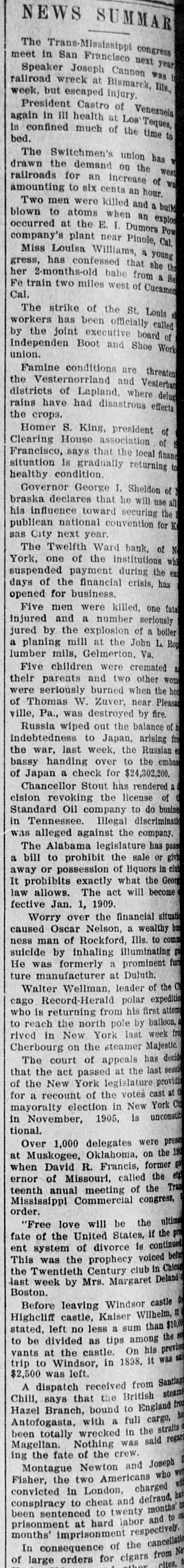 NEWS SUMMAR The Trans-Mississippi congress meet in San Francisco next year Speaker Joseph Cannon was railroad wreck at Bismarck, Ills., week, but escaped injury. President Castro of Venezuela in ill health at Los Teques, is again confined much of the time bed. The Switchmen's union has the demand on the west for an drawn railroads increase hour. of amounting to six cents an were killed and a buil to atoms when an explos at the E. I. blown Two men Dumors Pow plant near company's occurred Williams, Pinole, Cal. Miss Louisa a young has confessed that she gress, 2-months-old babe from a her train two miles west of Cucamon Cal. strike of the St. Louis The has been officially called workers the joint executive board by Independent Boot and Shoe Work union. Famine conditions are threaten Vesternorrland and Vesterbat the of Lapland, where delug the crops. districts rains have had disastrous effects S. King, president of of Homer House association Clearing says that the local situation Francisco, is gradually returning healthy condition. Governor George I. Sheldon declares that he will braska influence toward securing his publican national convention for sas City next year. Twelfth Ward bank, of of the York, The one institutions during the payment has suspended days of the financial crisis, opened for business. men were killed, seriously one fatal Five and a number boiler injured the explosion of a Rop jured by mill at the John L. lumber a planing mils, Gelmerton, Va. children were cremated Five parents and two other their seriously burned when the Pleasa were Thomas W. Zuver, near fire. of Pa., was destroyed by ville, wiped out the balance of Russia to Japan, arising week, the handing the indebtedness war, last over to the Russian embas bassy a check for $24,302,200. of Chancellor Japan Stout has rendered of revoking the license do busine cision Standard Oil company to discrimination Tennessee. Illegal company. in was alleged against the has The Alabama legislature sale or to prohibit the in a bill or possession of liquors the Georg away prohibits exactly what will become It law allows. The act fective Jan. 1, 1909. situatio over the financial wealthy Worry Oscar Nelson, a to comm caused man of Rockford, illuminating Ills. ness suicide by inhaling prominent was formerly a Duluth. ture He manufacturer at of Walter Wellman, leader expedition the Record-Herald polar first attem cago who is returning from his by balloon, reach the north pole last week to rived in New York Majestic. Cherbourg on the steamer has decide court of appeals last The the act passed at the provide that the New York legislature cast of recount of the votes York for a election in New unconstitu in mayoralty November, 1905, is tional. Over 1,000 delegates were on the prese Muskogee, Oklahoma, former at David R. Francis, the when of Missouri, called the Tran ernor anual meeting of congress, Mississippi teenth Commercial ultima order. "Free love will be the if the fate of the United States, is continued system of divorce voiced ent was the prophecy in Chicag This Twentieth Century club Deland last the week by Mrs. Margaret Boston. Before leaving Windsor Wilhelm, castle Higheliff castle, Kaiser than stated, left no less a sum among the to be divided as tips his previous at the castle. On it was trip vants to Windsor, in 1898, $2,500 A dispatch was left. received British from Santlas steams says that the England Hazel Chili, Branch, bound to full cargo, Antofogasta, with a the straits totally wrecked in said regard been Magellan. Nothing was the fate of the crew. ing Montague Newton and Joseph who Fisher, the two Americans charged convicted in London, defraud, han to cheat months conspiracy been twenty and labor sentenced to and to prisonment at hard respectively. imprisonment months' In consequence of cigars the cancellation from Ne U of large orders for other cites,