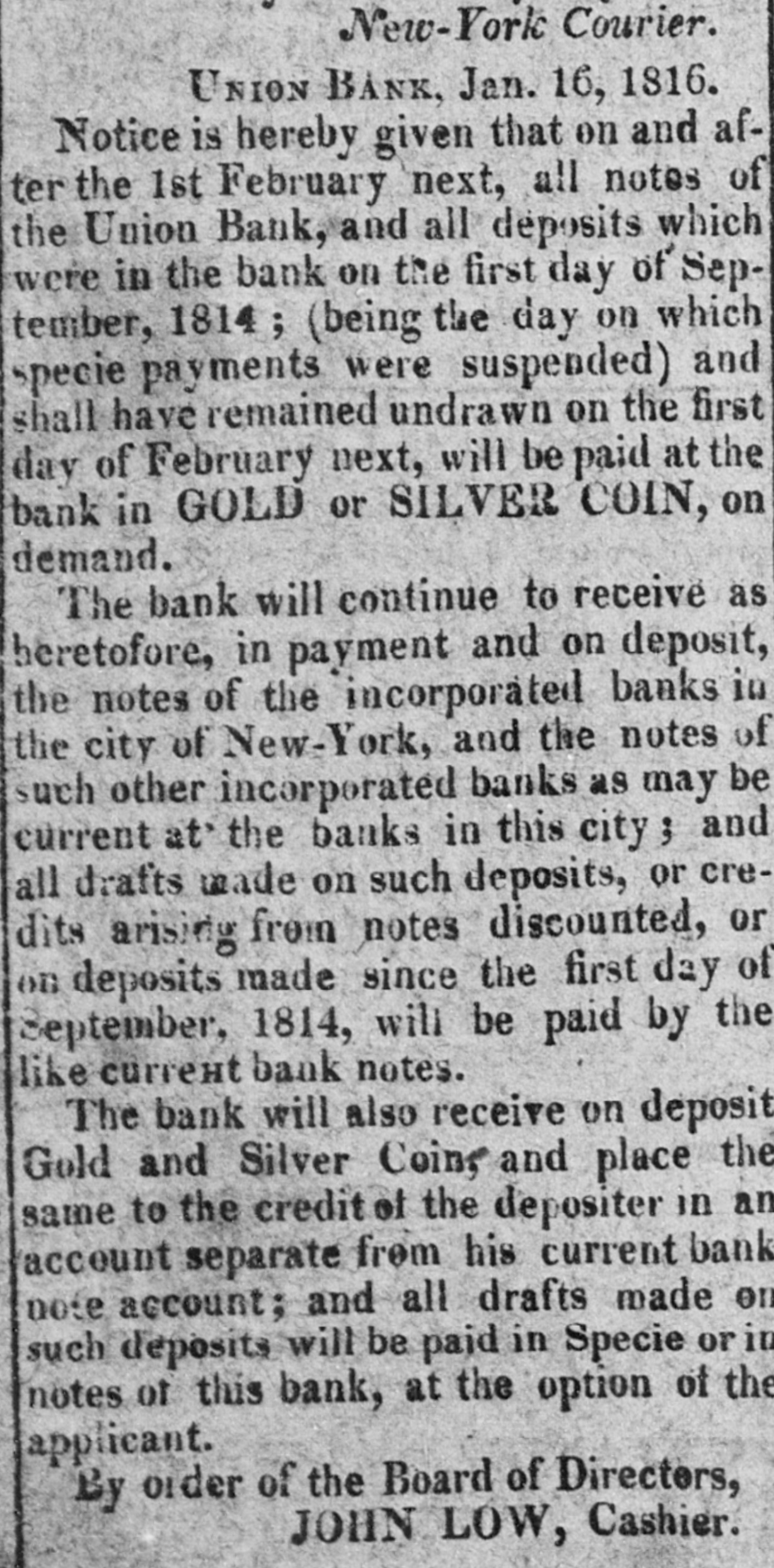New-York Courier. UNION BANK, Jan. 16, 1816. Notice is hereby given that on and after the 1st February next, all notes of the Union Bank, and all deposits which were in the bank on the first day of September, 1814 (being the day on which pecie payments were suspended) and shall have remained undrawn on the first day of February next, will be paid at the bank in GOLD or SILVER COIN, on demand. The bank will continue to receive as heretofore, in payment and on deposit, the notes of the incorporated banks in the city of New-York, and the notes of such other incorporated banks as may be current at' the banks in this city ; and all drafts made on such deposits, or credits arising from notes discounted, or on deposits made since the first day of September, 1814, will be paid by the like current bank notes. The bank will also receive on deposit Gold and Silver Coins and place the same to the credit of the depositer in an account separate from his current bank note account; and all drafts made on such deposits will be paid in Specie or in notes of this bank, at the option of the applicant. By order of the Board of Directors, JOHN LOW, Cashier.